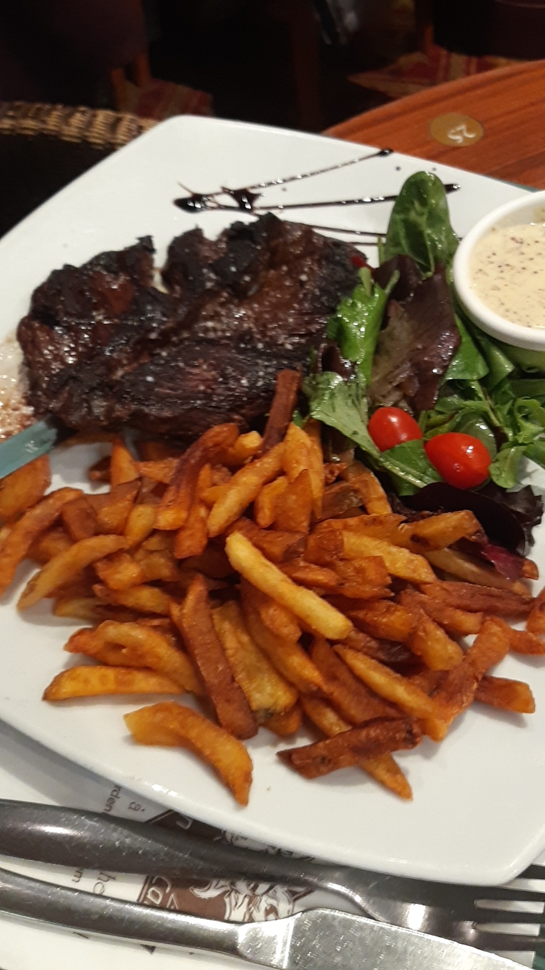 Petit resto sympa dans le centre de Montauban, au carrefour des rues piétonnes. Très vite servis, de bonnes frites maison bien soufflées accompagnent les plats. J'aurais aimé un peu plus copieux et avec quelques variétés de légumes, mais la viande (onglet de bœuf et andouillette) est bonne, bien cuite, et avec de très bonnes sauces (au choix pour l'onglet, au poivre vert, roquefort, champignons... Et à la moutarde pour l'andouillette).