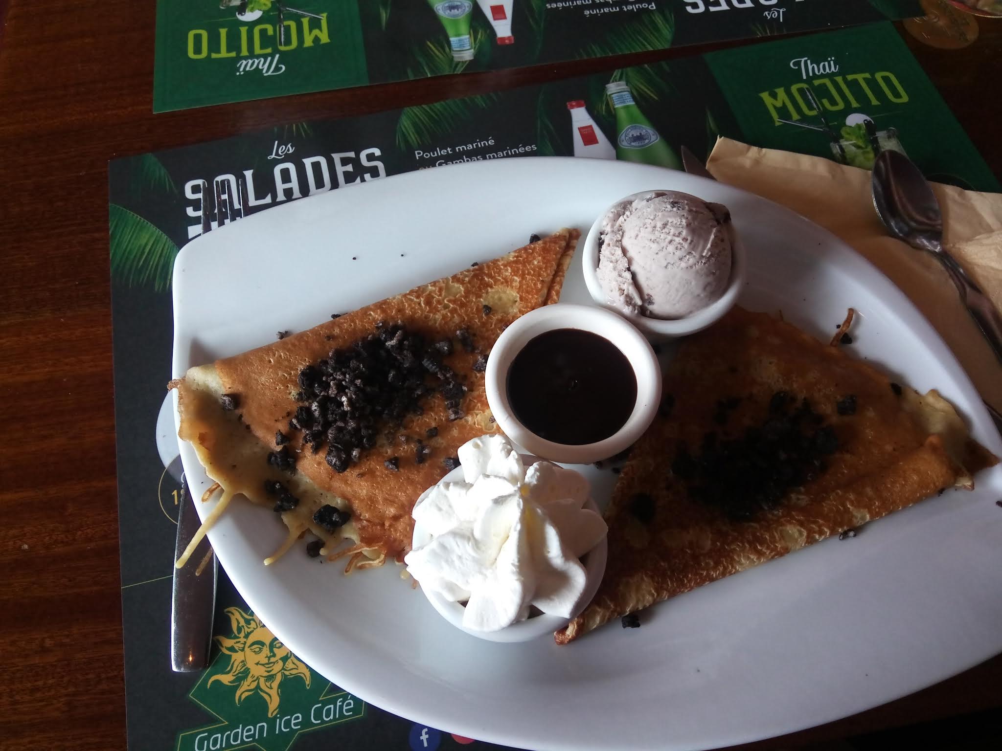 Obliger de mettre une étoile mais bon ça a bien changer. 2 crêpes identiques a la différence une avec une boule de glace. La différence majeure ? Le prix 4€90 celle sans glace et 7€40 celle avec.... Ça fait cher la boule de glace. A savoir que celle a 7€40 (la Garden ICE) était anciennement avec de la banane même si ça ne justifier pas autant la différence de prix c'était limite + acceptable que ça.