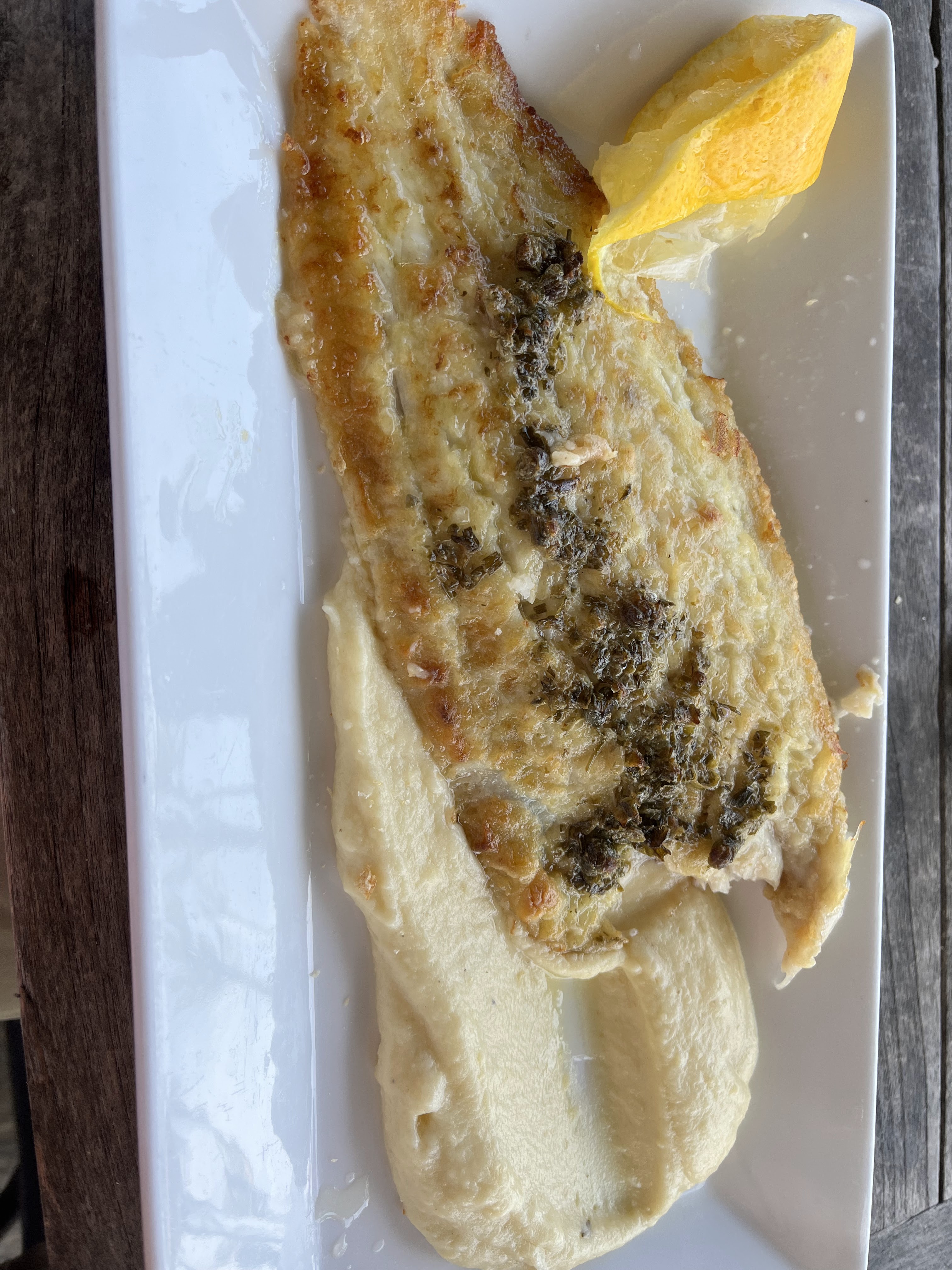 C’est le premier restaurant qu’on a essayé en Corse. Il était déjà 14h un dimanche. Le serveur était assez gentil et ils nous a préparé une table dehors. On a commandé le poisson avec purée et salade verte. Le poisson était très bon! mais un peu cher pour la taille du poisson. On avait encore faim… Quelques détails: Nous avons attendu environ 30 minutes pour le plat. Même si on était assis dehors on entendait toutes les discussions du personnel à l’intérieur qui parlaient très fort. La rue en face était très bruyante aussi. >> Pas d’indications d’allergènes. Il faut demander au service et ceci est assez embêtant si le personnel ne connaît pas tout les ingrédients.