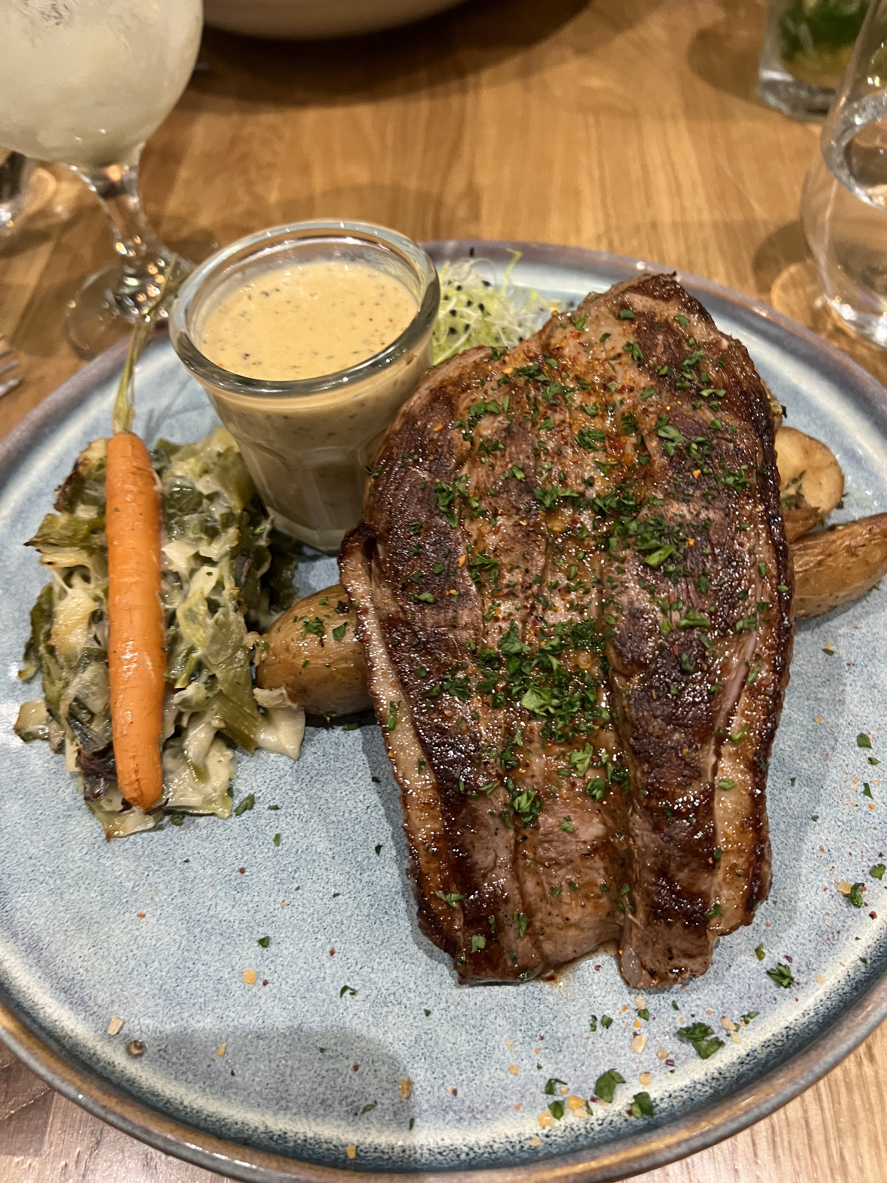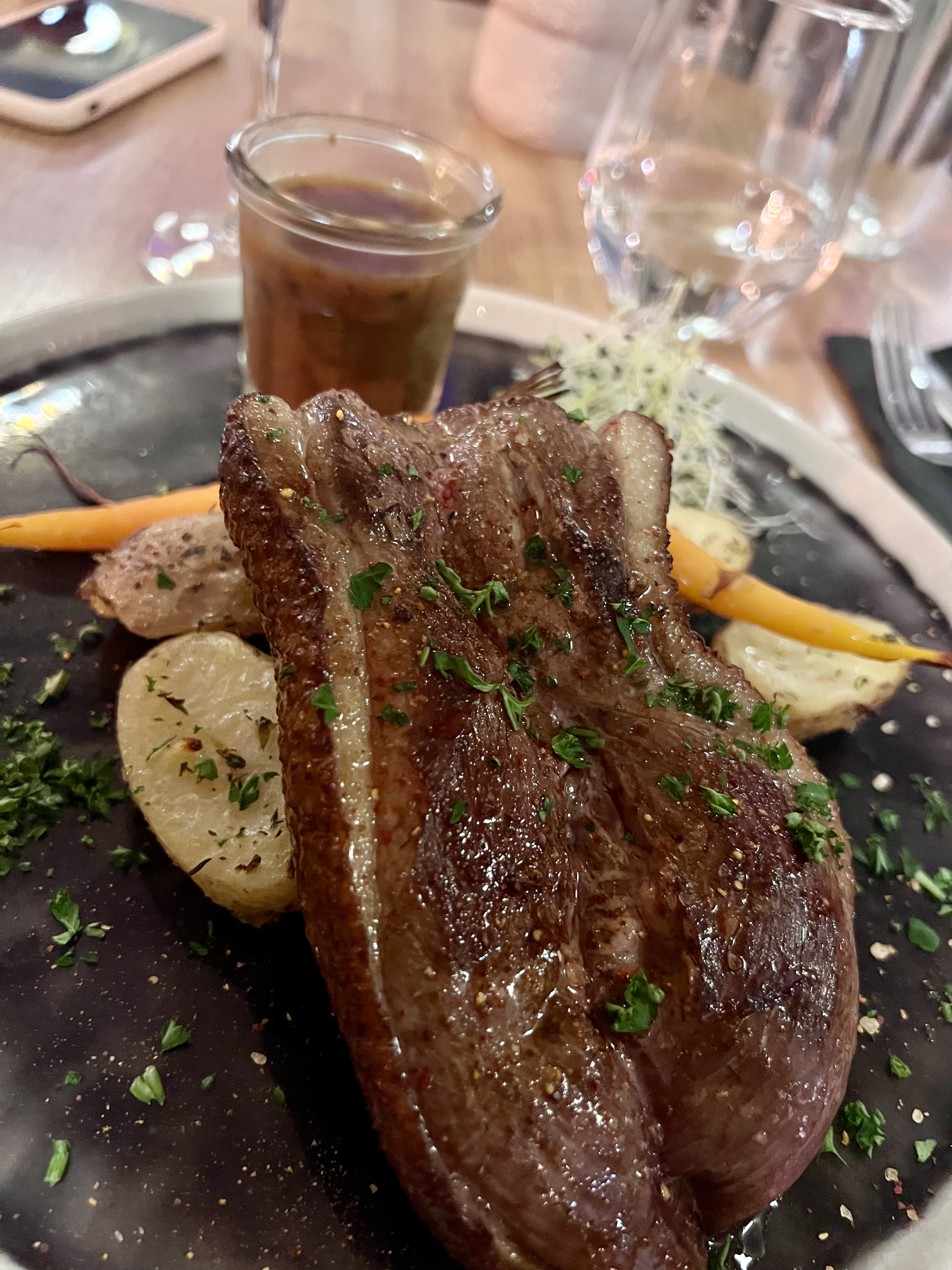 Côte de bœuf 1 personne (34€) commandée bleue. Arrivée bien cuite. Magret de canard commandé rosé. Arrivé très cuit. Service digne d'une brasserie. Nous sommes de Dax et n'y reviendrons pas.