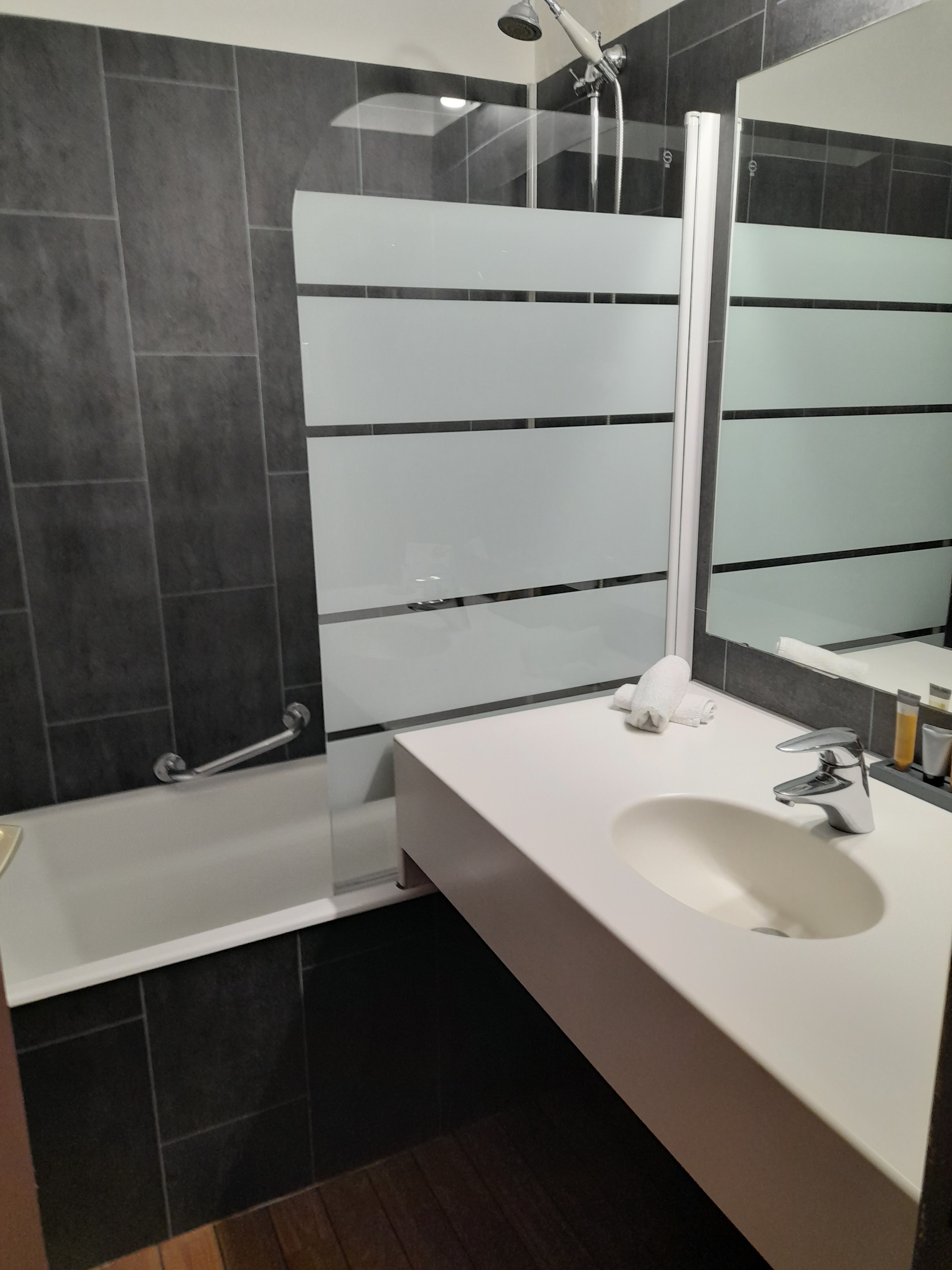 Belle chambre king size très bonne literie ce qui est assez rare en France, salle de bain moderne juste calcaire au pommeau de douche, très bel accueil merci pour cette nuit