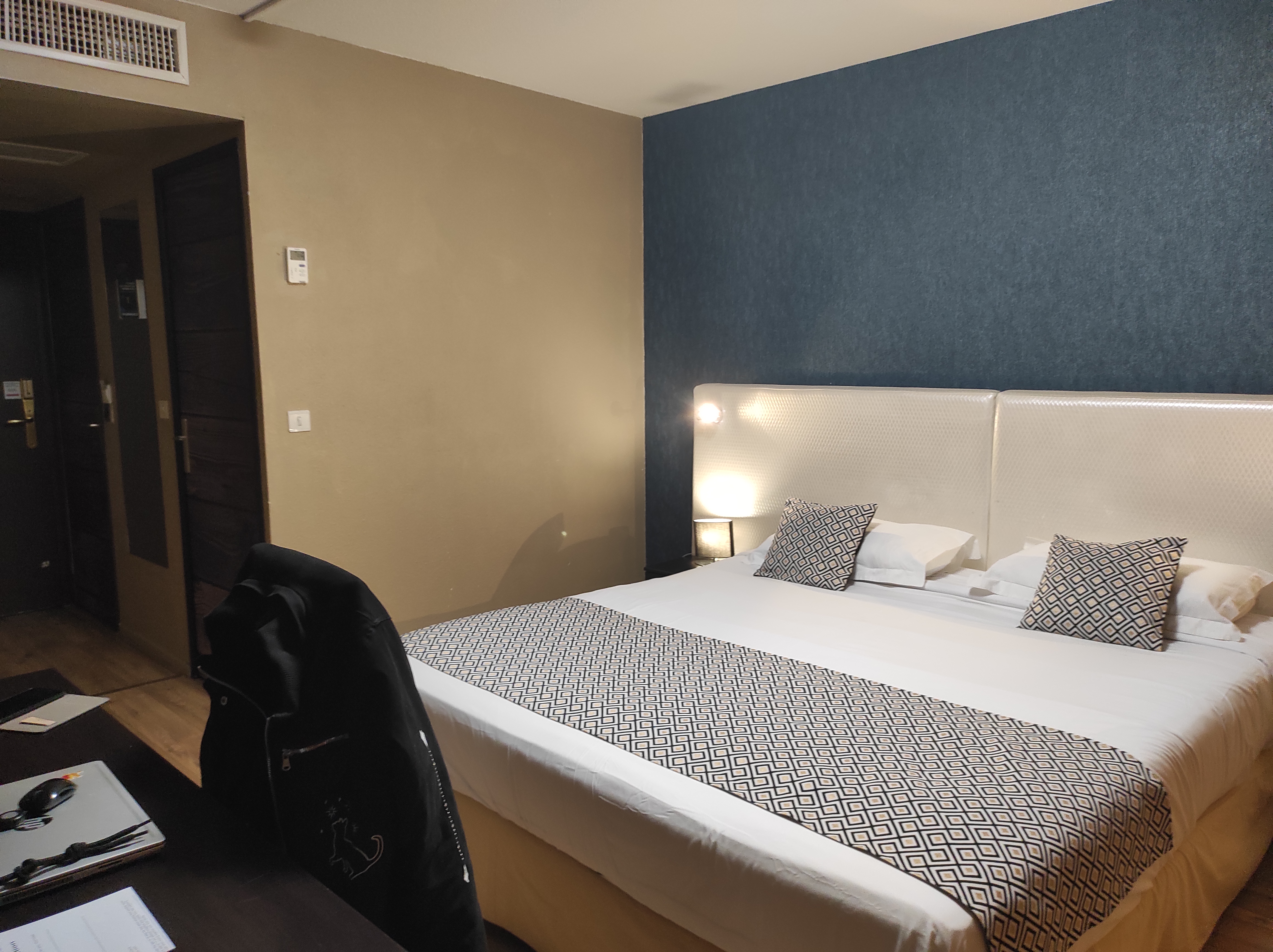 Cet hôtel ne mérite pas ses 4 étoiles. J’ai séjourné dans des hôtels 3 étoiles de meilleure qualité en confort, en service et équipements. La réceptionniste est irrespectueuse et désagréable. Le gérant n’est pas mieux. Il a un vrai problème de posture professionnelle et de communication. On ne vient pas dans un hôtel pour se faire agresser et maltraiter par son personnel. En plus, il fait attendre longtemps pour avoir quelqu’un a la réception. La clochette est un simple décor. Il faut aller a la recherche du personnel si vous êtes pressé. De plus, l’hôtel pratique une politique du supplément partout, par exemple 25€ pour entrer dans la chambre a 14h00 au lieu de 15h00,… La chambre ne dispose pas de prises suffisantes : pas de prise près du lit ni en dessous de TV ni une prise en norme française dans la SDB. Le bar refuse de sévir le café. Ce n’est franchement pas un hôtel que je recommanderai.
