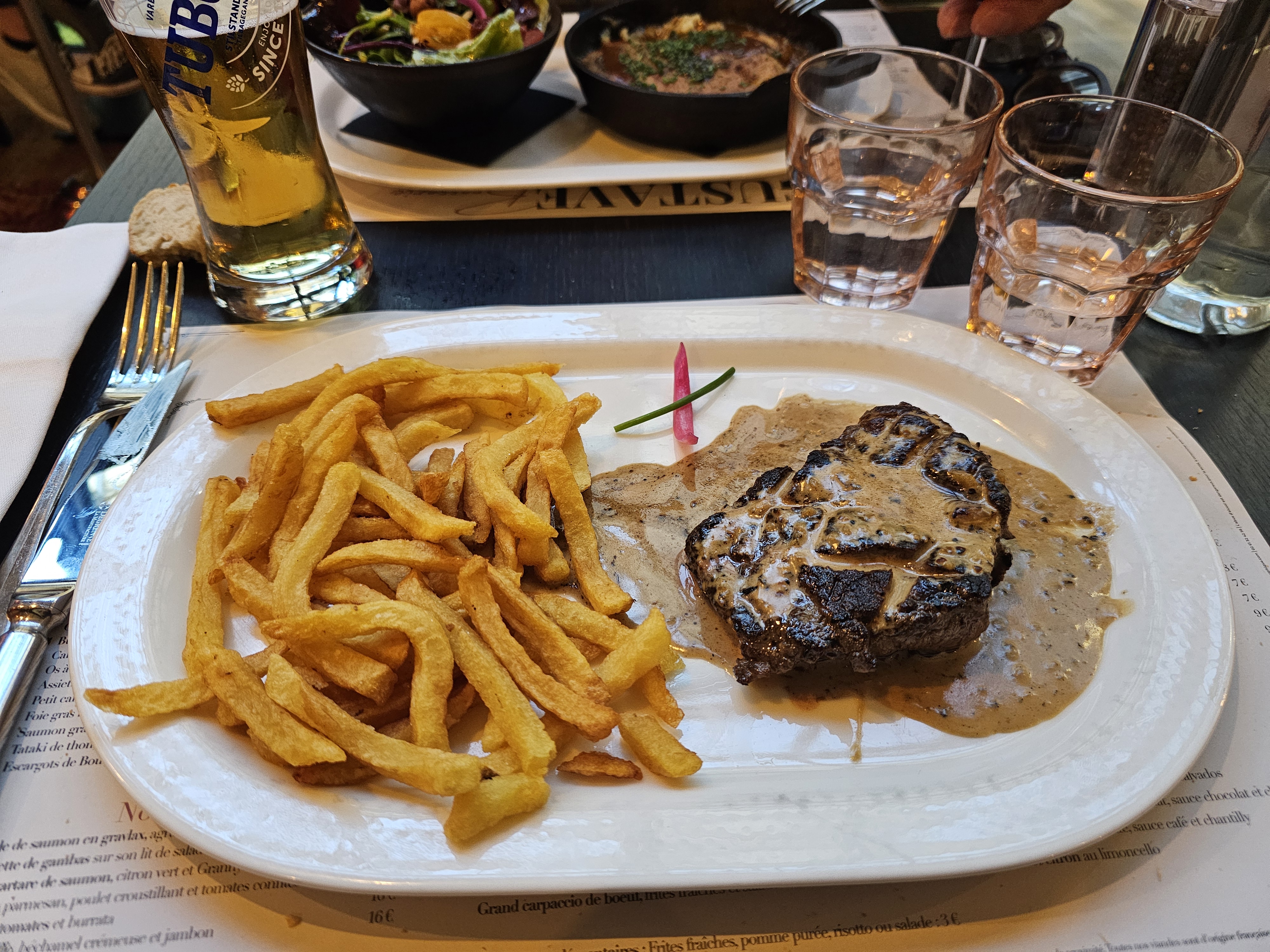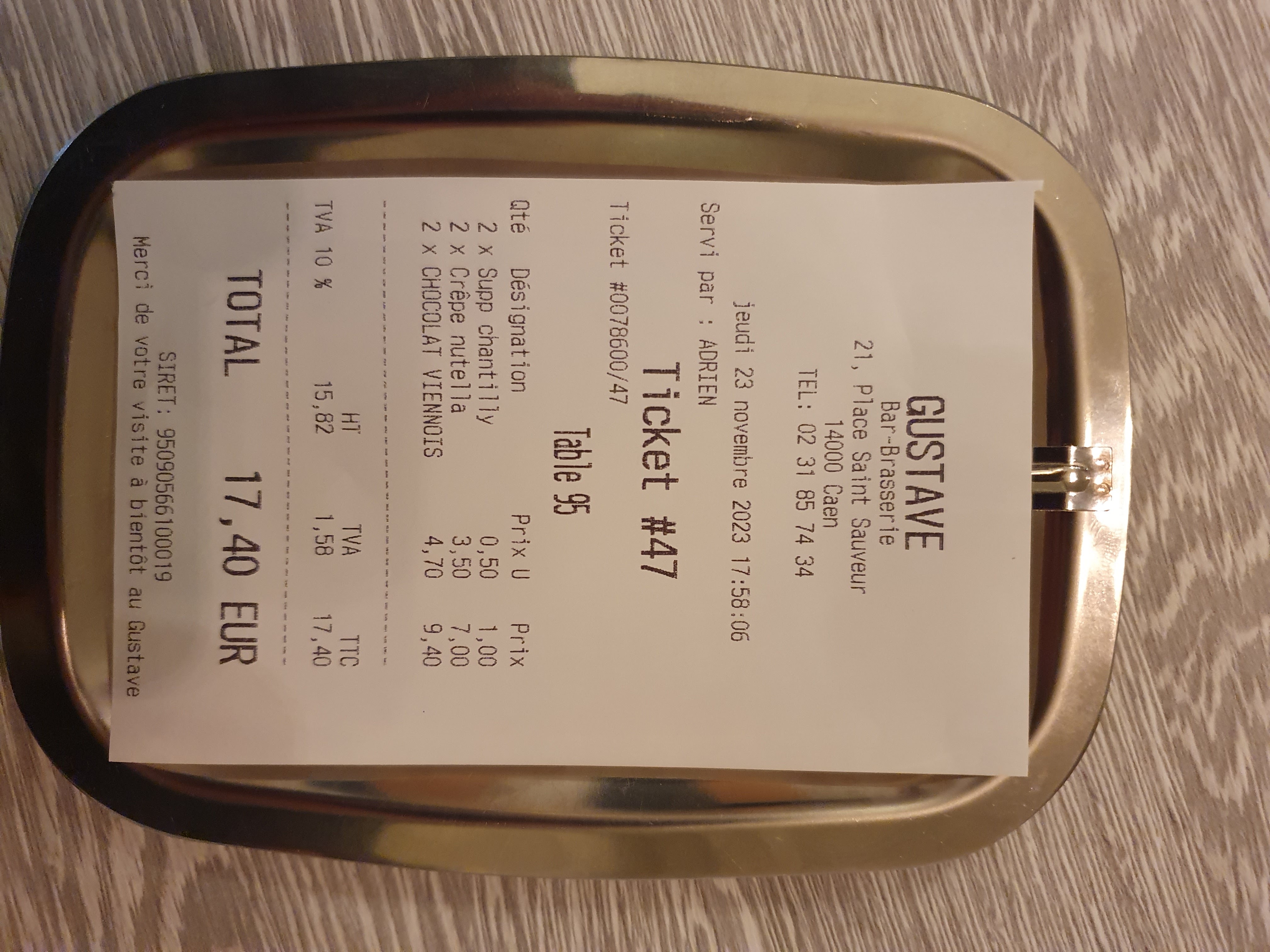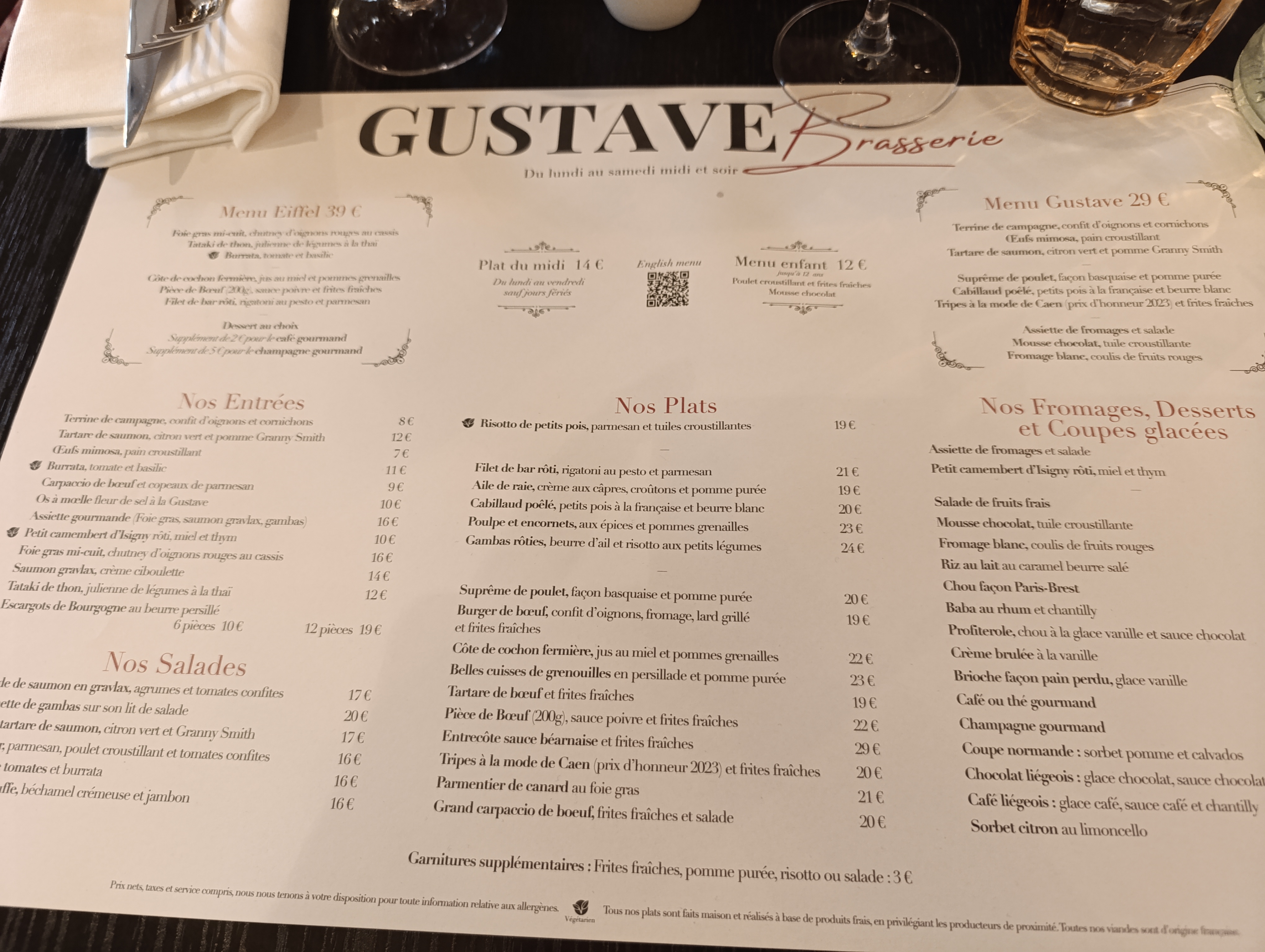 Très bonne expérience, de la prise de notre commande jusqu'à la fin du service. Rapport qualité prix très correct. Remerciements particulier à Angélo pour notre prise en charge, souriant, consciencieux et sympathique. Je recommande le Gustave !