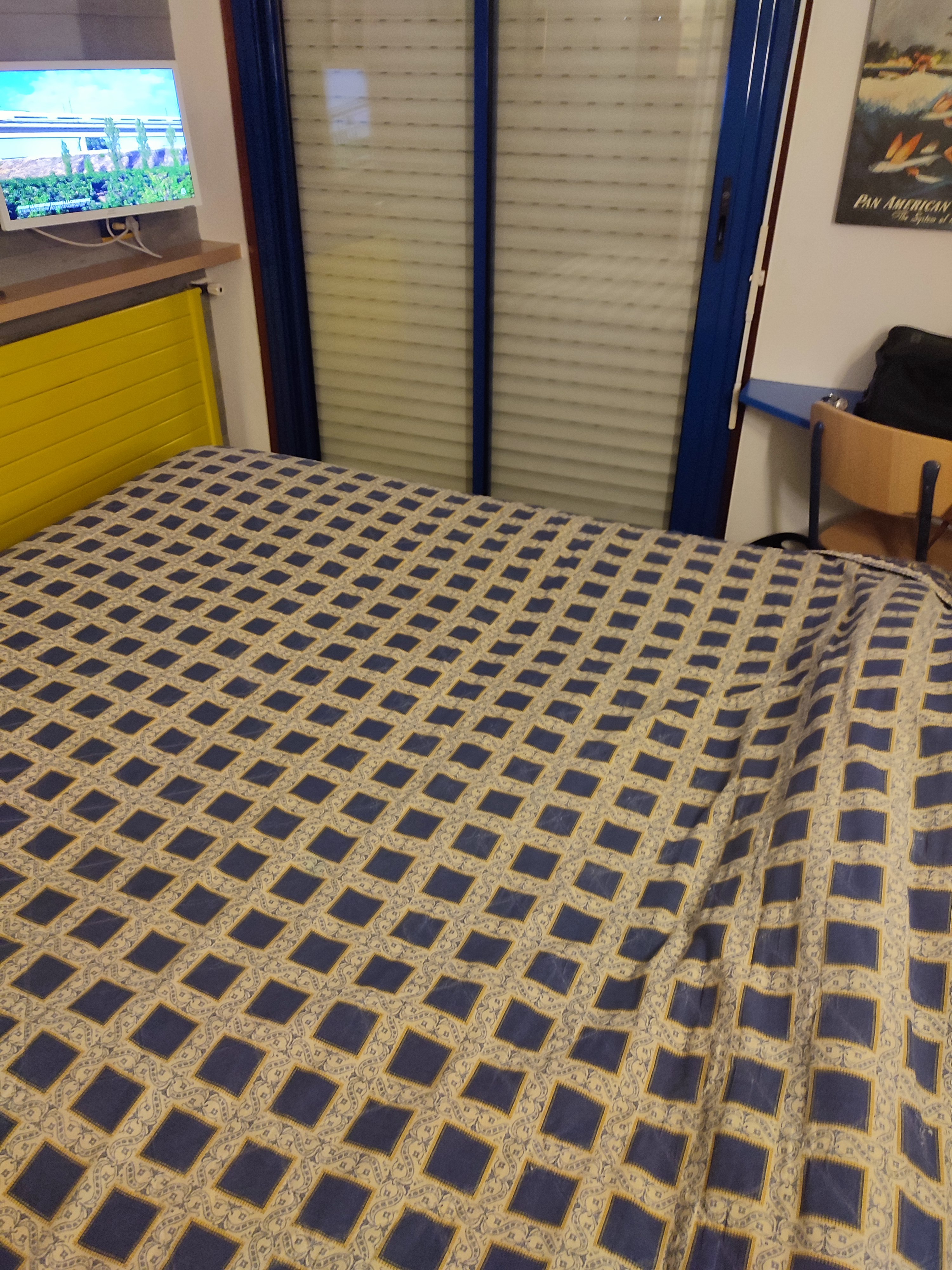 Chambre en sous pente, exiguë. Pas de chevets à côté du lit, lequel est collé au mur. Donc pour se lever la nuit on passe sur le corps de son conjoint, qui du coup se réveille. Lit fait n'importe comment ; pour ne pas avoir à dormir à même la couverture, nous avons du le refaire à notre arrivée. 1 gel douche et 1 gobelet pour deux, pas de tapis de bain. Positif : propreté et petit déjeuner copieux.