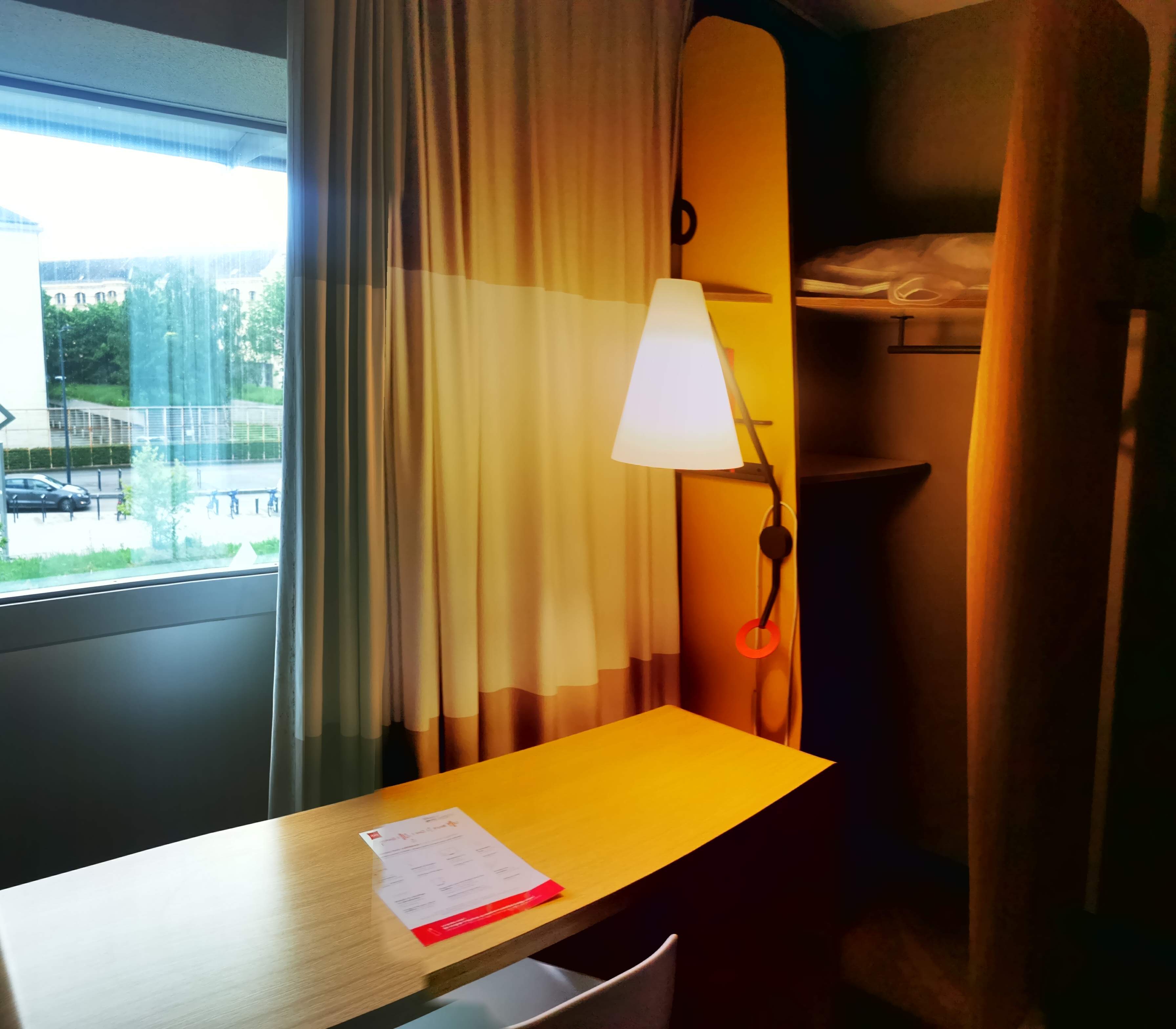 Chambre petite mais plus grande que certains ibis. Manque toujours une bouilloire dans la chambre ou en libre accès. Pour un 3* c'est dommage. Côté prison on n'entend pas le train .