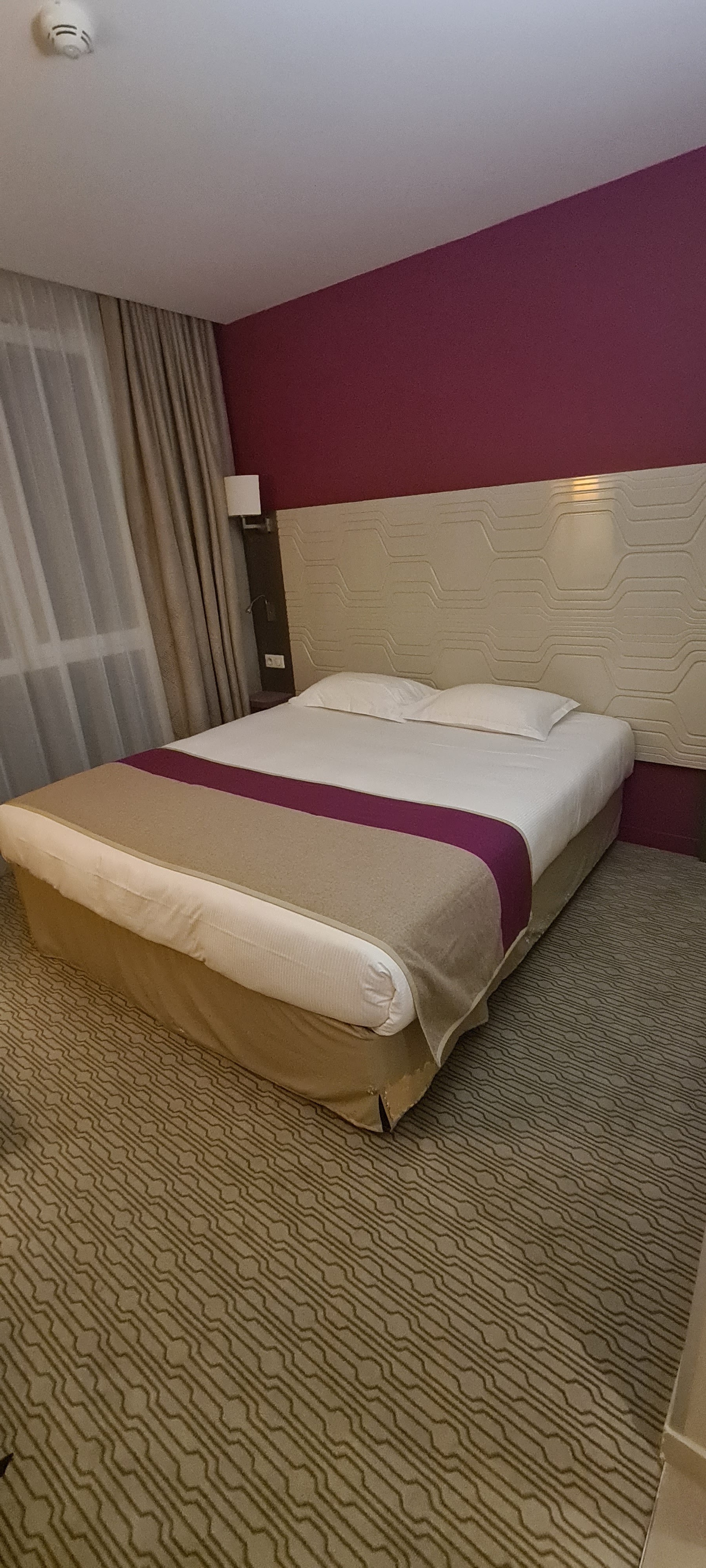 Je regrette l'état des chambres Tâches oranges sur la moquette, Tâches noires sur les rideaux, Des vitres salles, des fissures au mur... Il manque un espace lounge près du bar si nous souhaitons télétravailler Malgré cela l'hôtel est dans son ensemble correct et conforme aux attentes