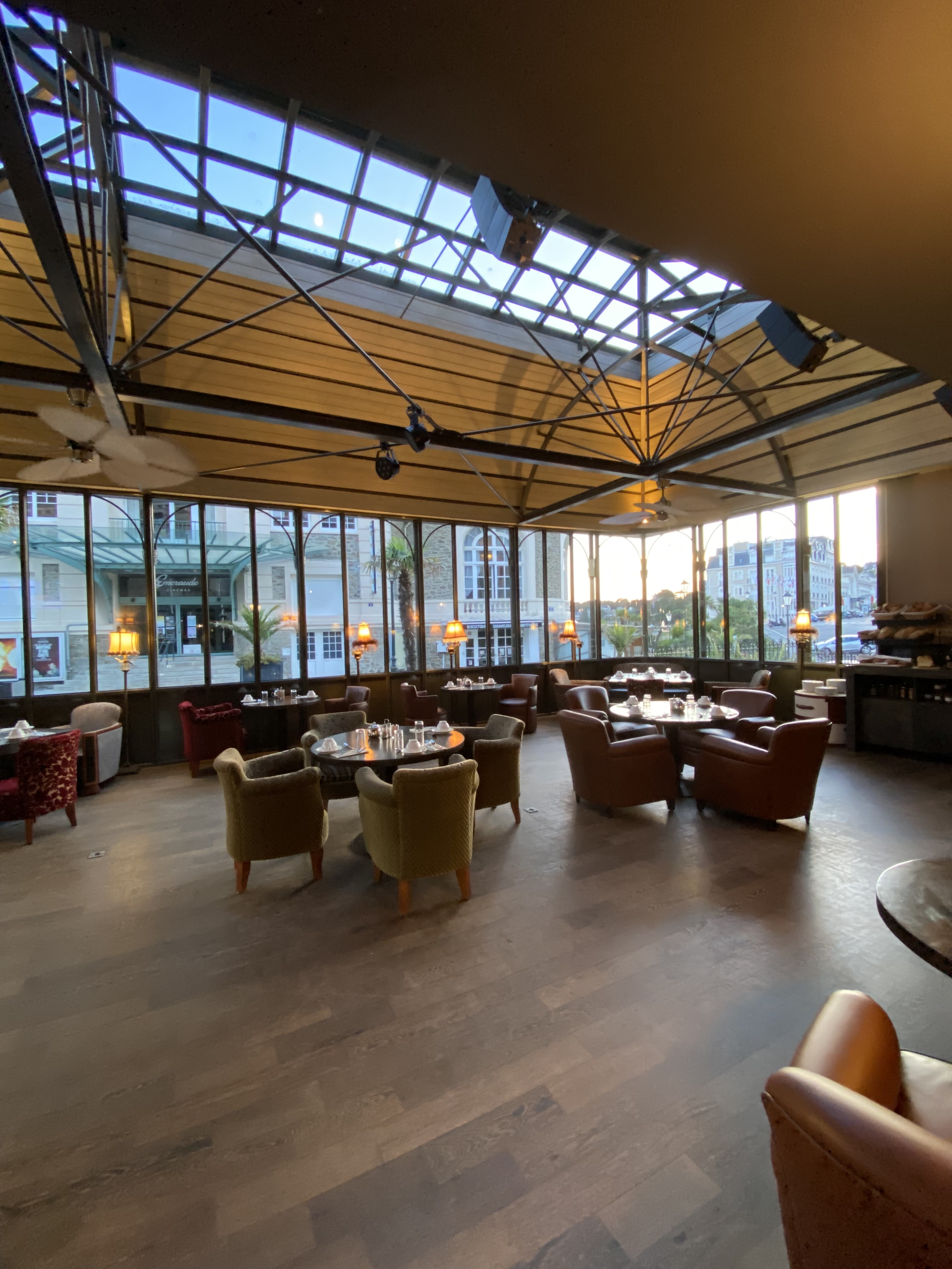 Je ne vais pas vous décrire mon séjour dans cet hôtel, j'y ai seulement pris le café et une excellente tarte citron meringuée. Mais je voulais partager avec vous le charme de cet endroit et l'agréable atmosphère qui s'y dégage. Tout d'abord son emplacement idéal en retrait de la plus belle plage de Dinard, celle de l'écluse et ses fameuses tentes rayées bleues et blanches, près du Casino et des jolis commerces du centre ville et enfin du marché et face au cinéma. Et il y a ce bâtiment suranné qui évoque si bien les années rétro de des plages d'antan. La verrière où nous avons pris le café est a ce titre magnifique. Il s'agit un Hôtel 4* du groupe ACCOR catégorie MGallery, son directeur a déjà officié à Trouville-sur-Mer au grand Hôtel des termes. Nous avons bénéficié d'un excellent accueil au bar.