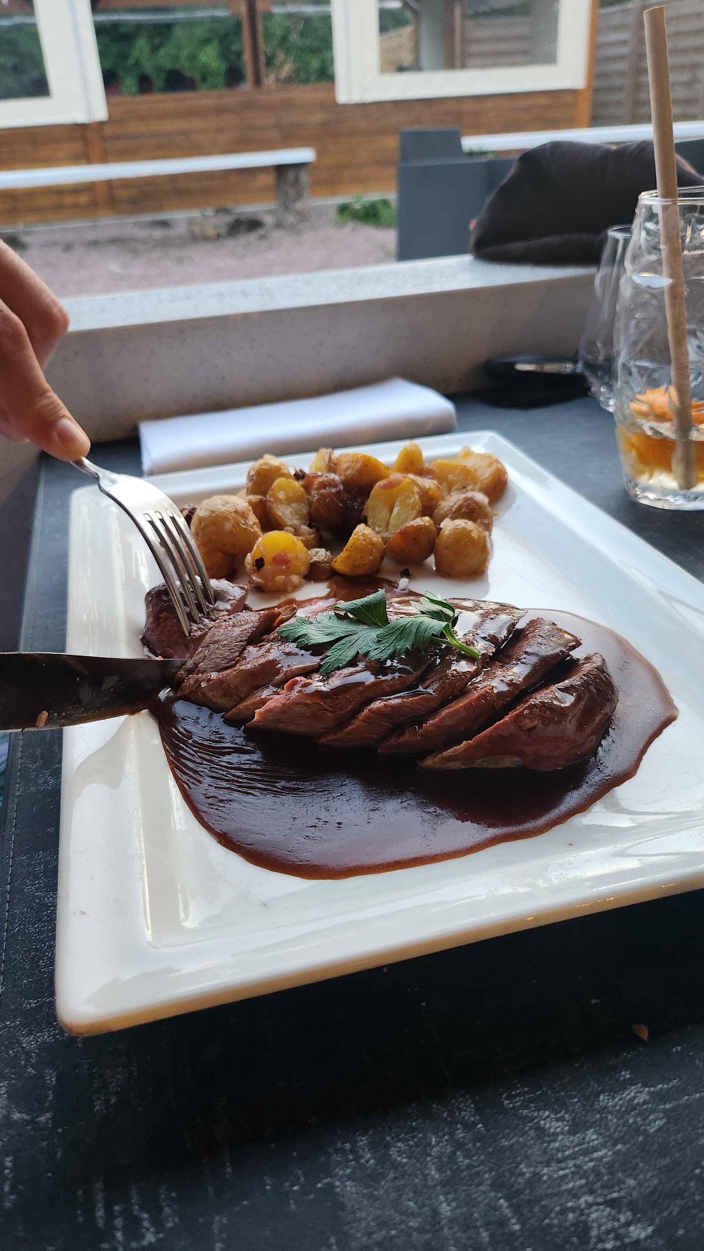 Beaucoup de choix peut être un peu trop pour que tout soit frais et fait maison. Cela n'engage que moi. Frites maison molles. Magret très bon. Service très long, trop long .. Obligé de se déplacer pour demander les cafés. Extérieur très agréable