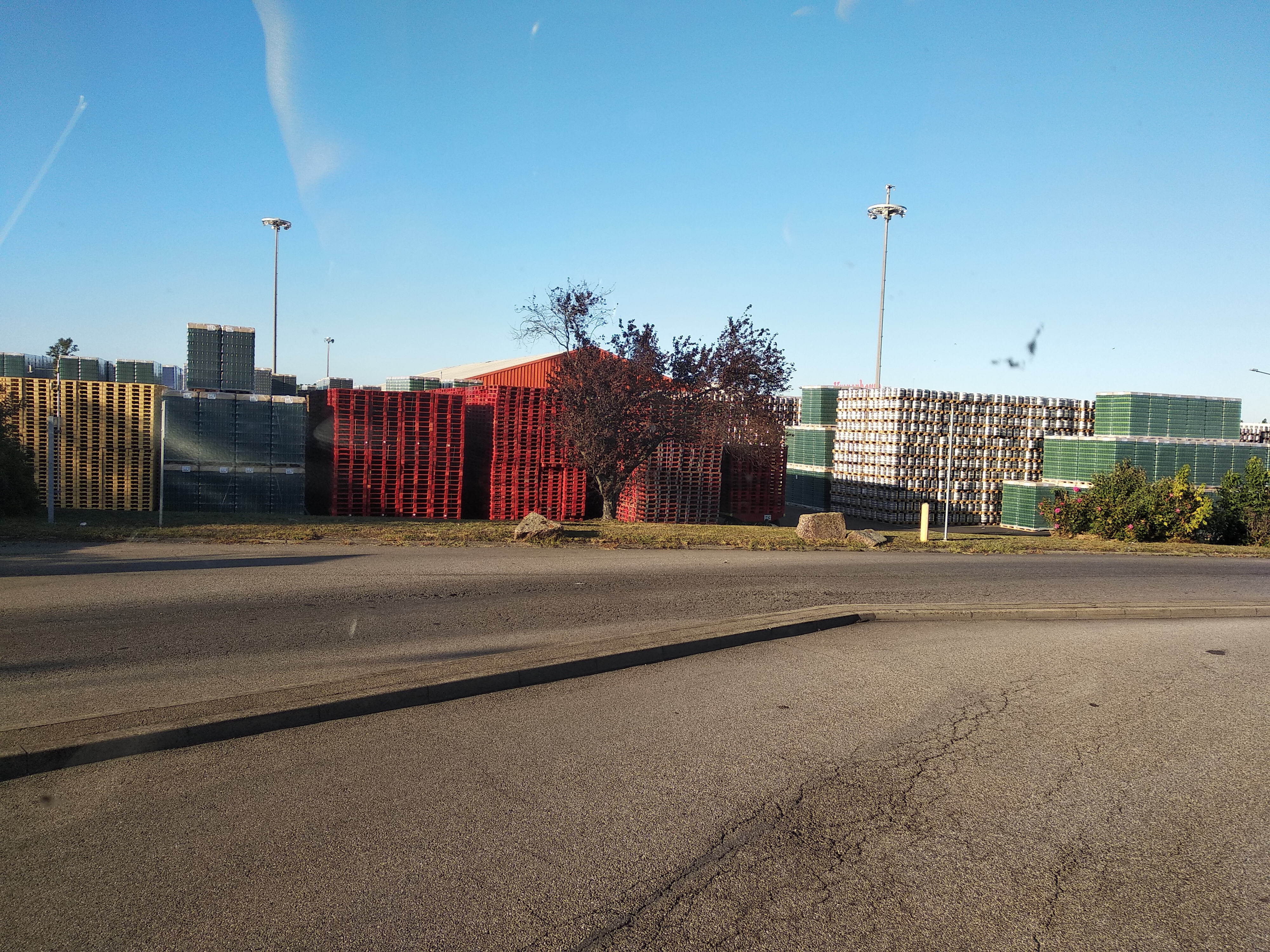 Express, déchargement de bouteilles. Le déchargement latéral enlève 4 palettes à la fois. On peut dire que le déchargement prend autant de temps qu’il faut pour ouvrir et fermer le côté de la remorque. Il y a un grand parking devant l'entreprise où vous pouvez rester pour faire une pause.