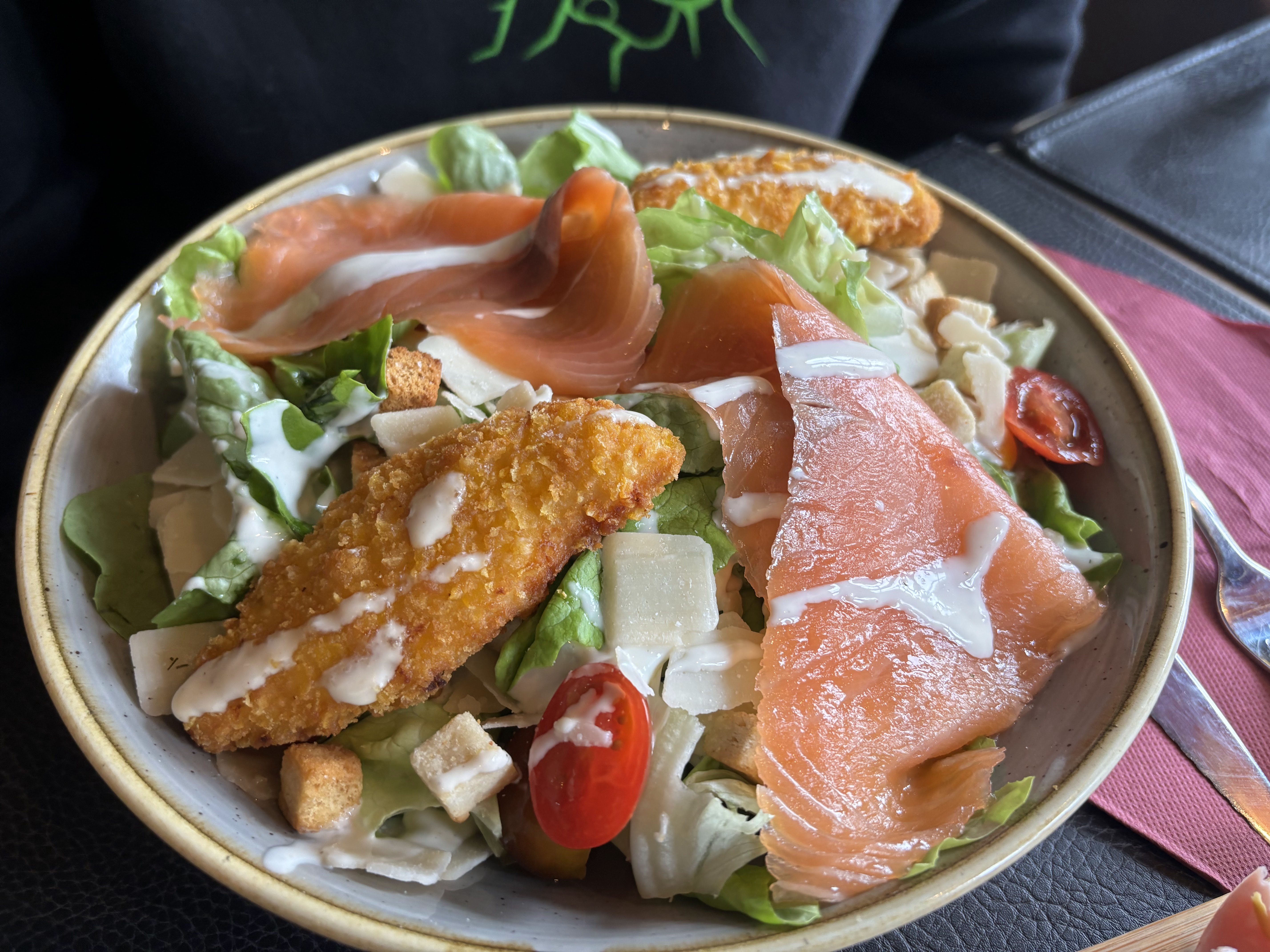 Service efficace, serveur Francois sympa aux ptits soins ambiance parfaite niveau sonore. Salade Caesar duo (poulet/saumon) et salade de l'Abbaye : excellentes👍👍👍 Tout comme le café gourmand 😉