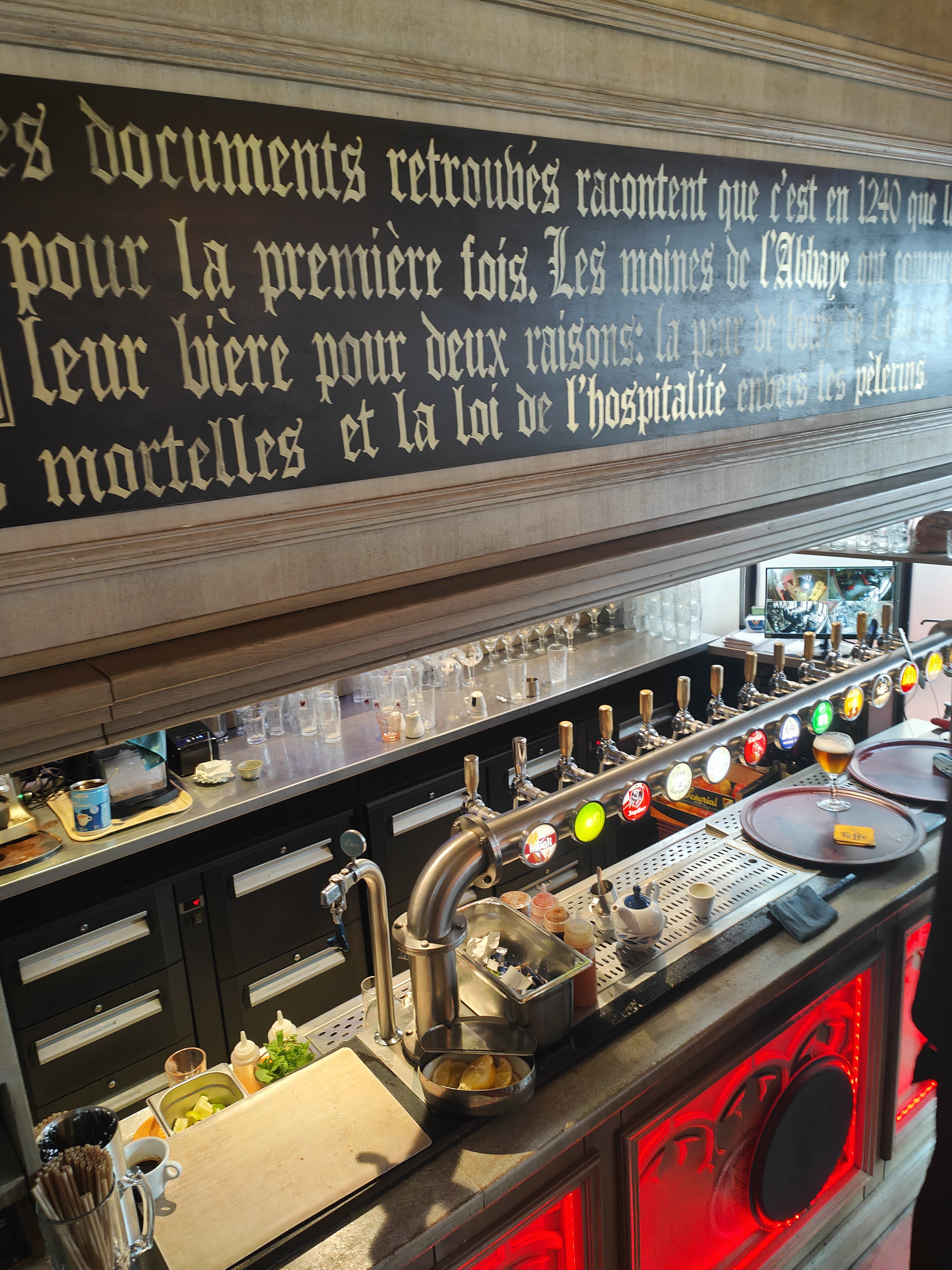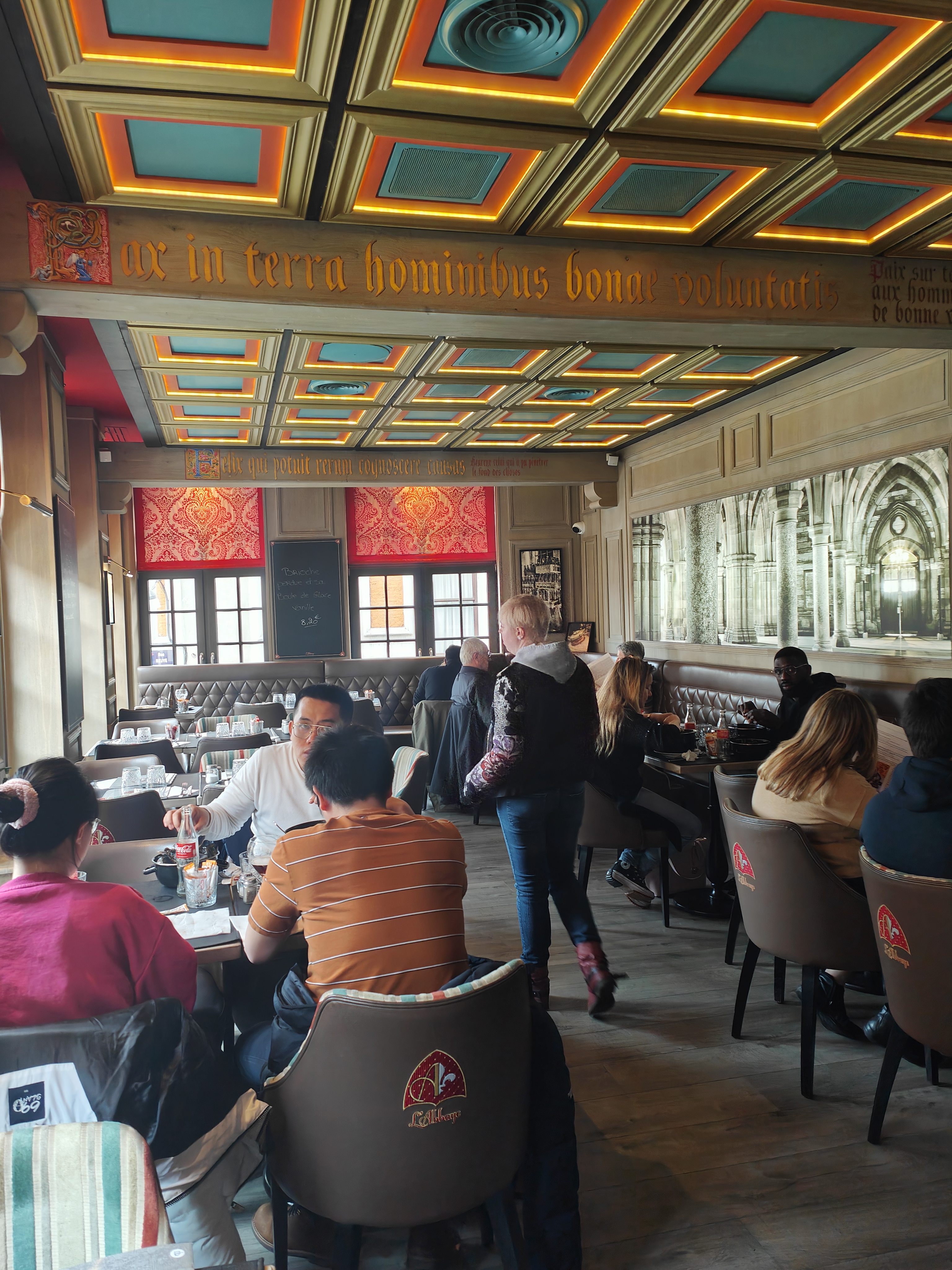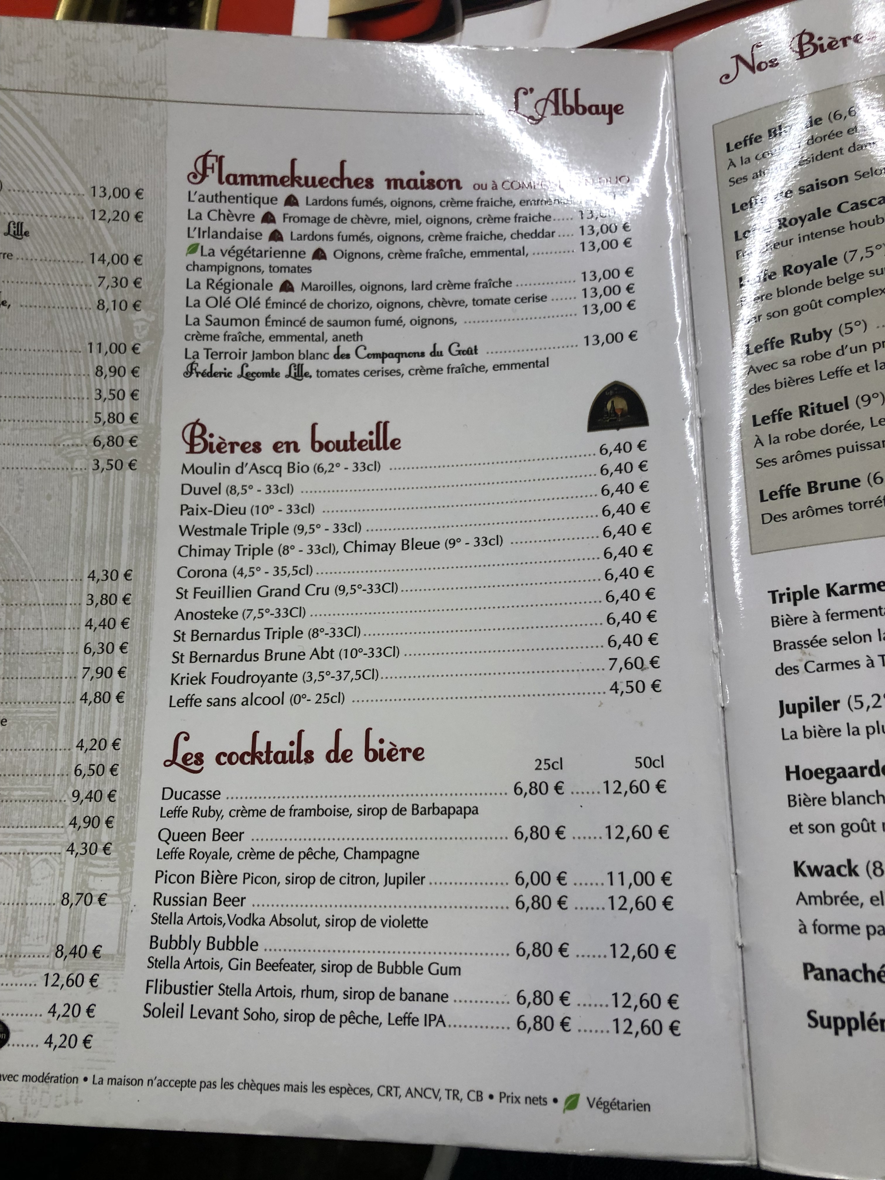 Une Brasserie agréable bien placée au centre de Lille, au décor intérieur à l’image d’une Abbaye Servie professionnel, une belle collection de bières à la pression La carbonnade était très bonne