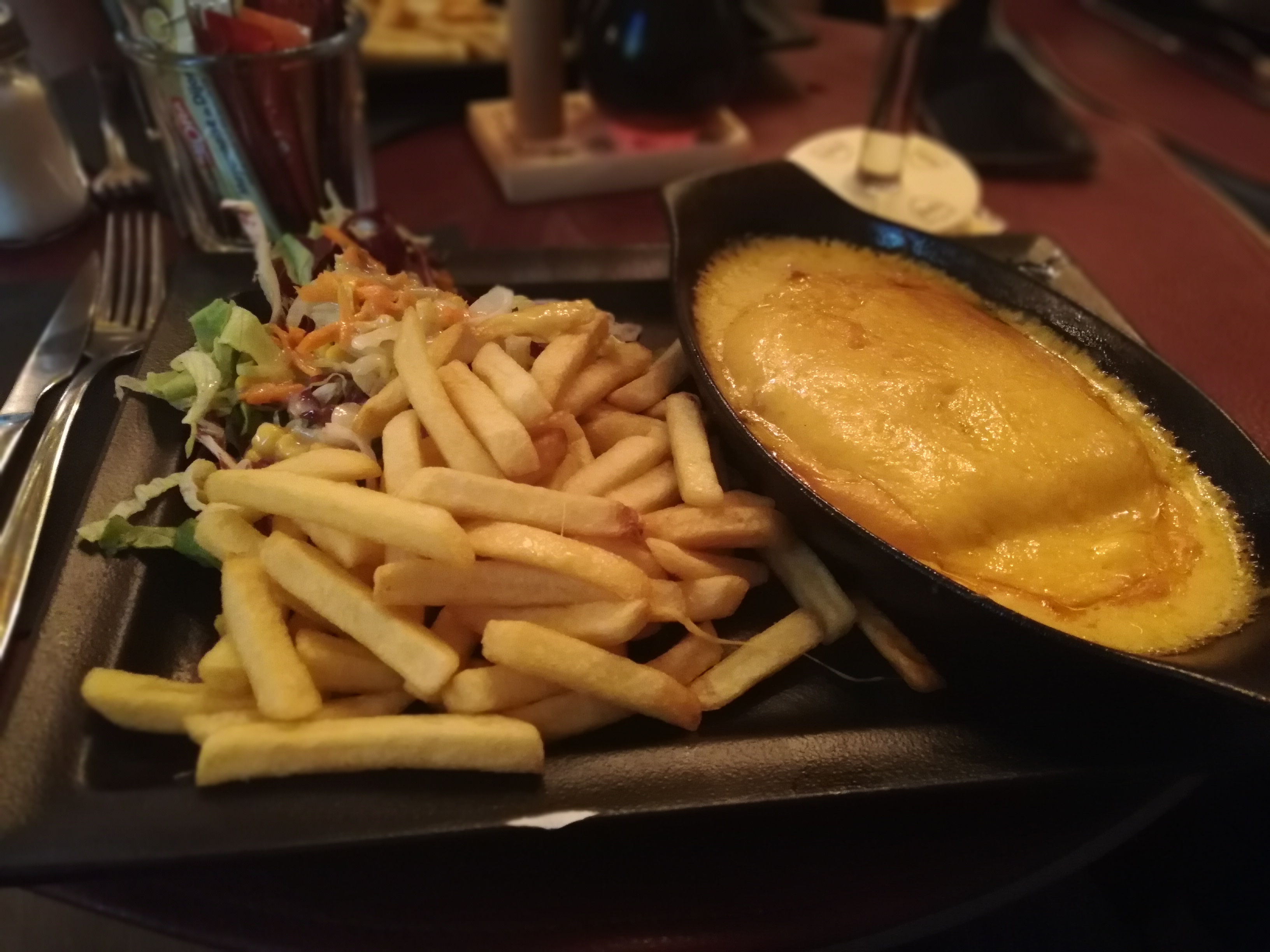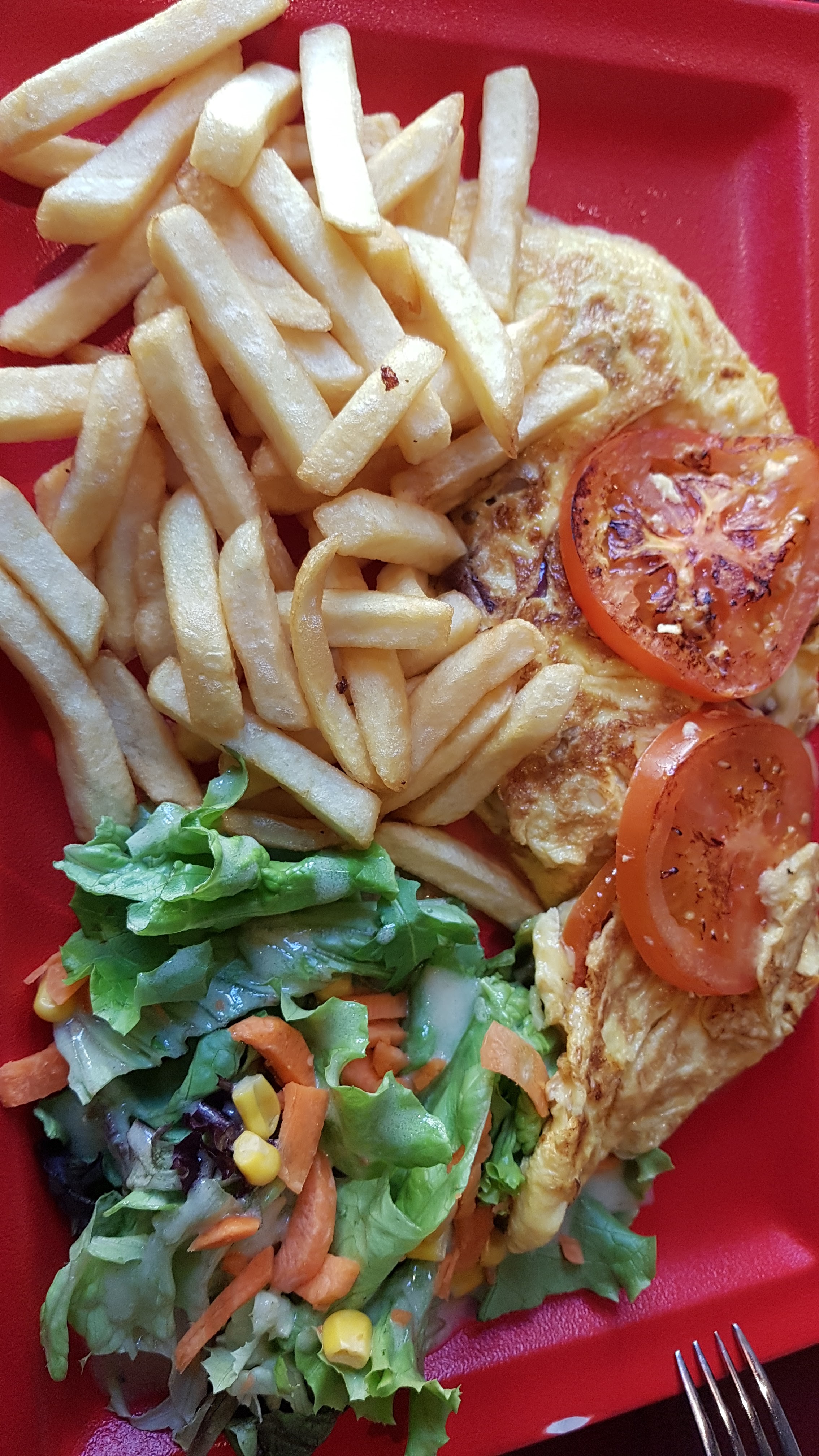 Repas plus que copieux, à prix très correct. J'ai commandé une omelette qui était servie avec une portion de frites et une salade. Je n'ai pas pu tout finir... Joli cadre. Très joli choix de tableaux aux murs, éclairés juste ce qu'il faut pour les mettre en valeur. Service agréable.