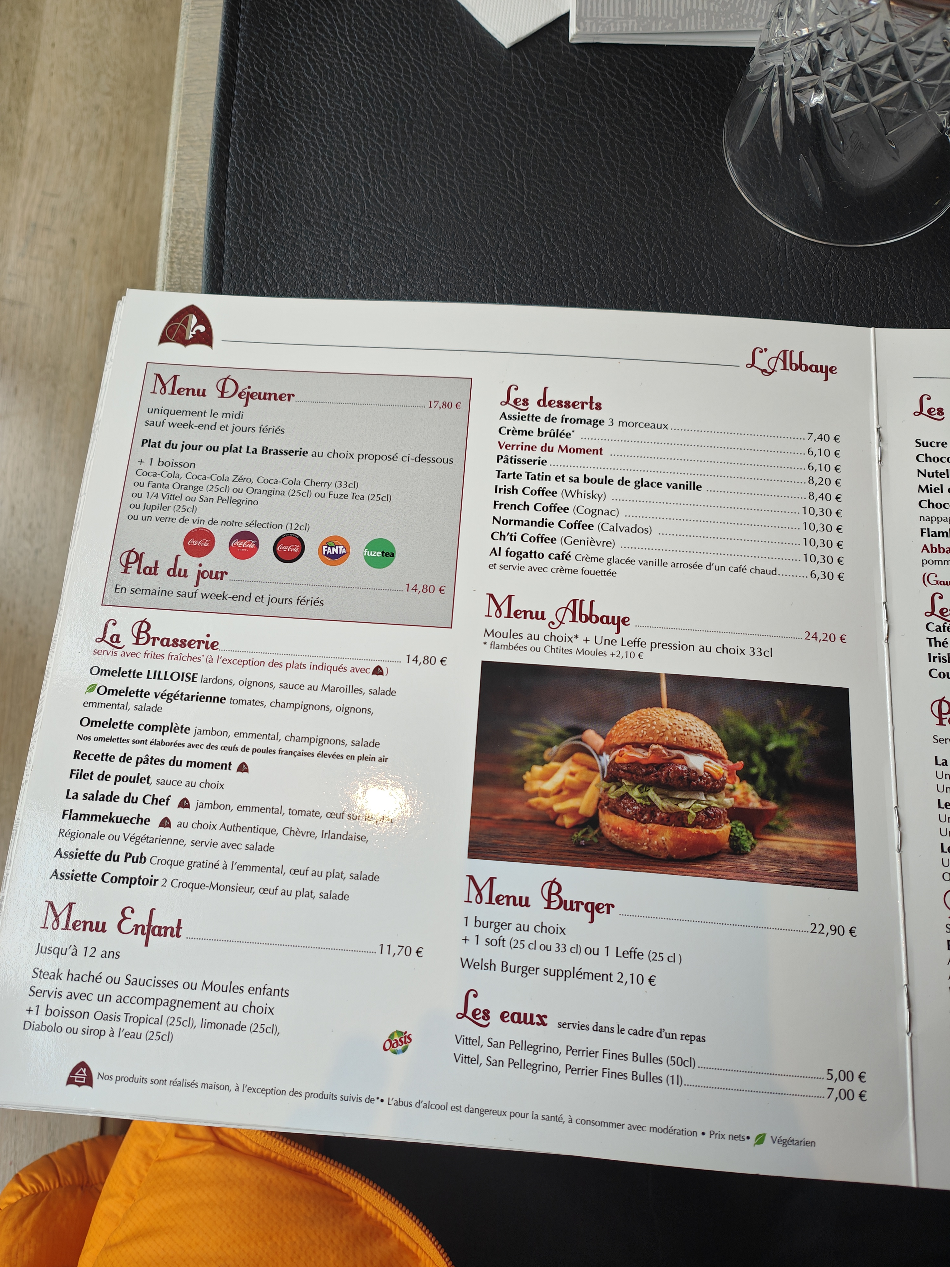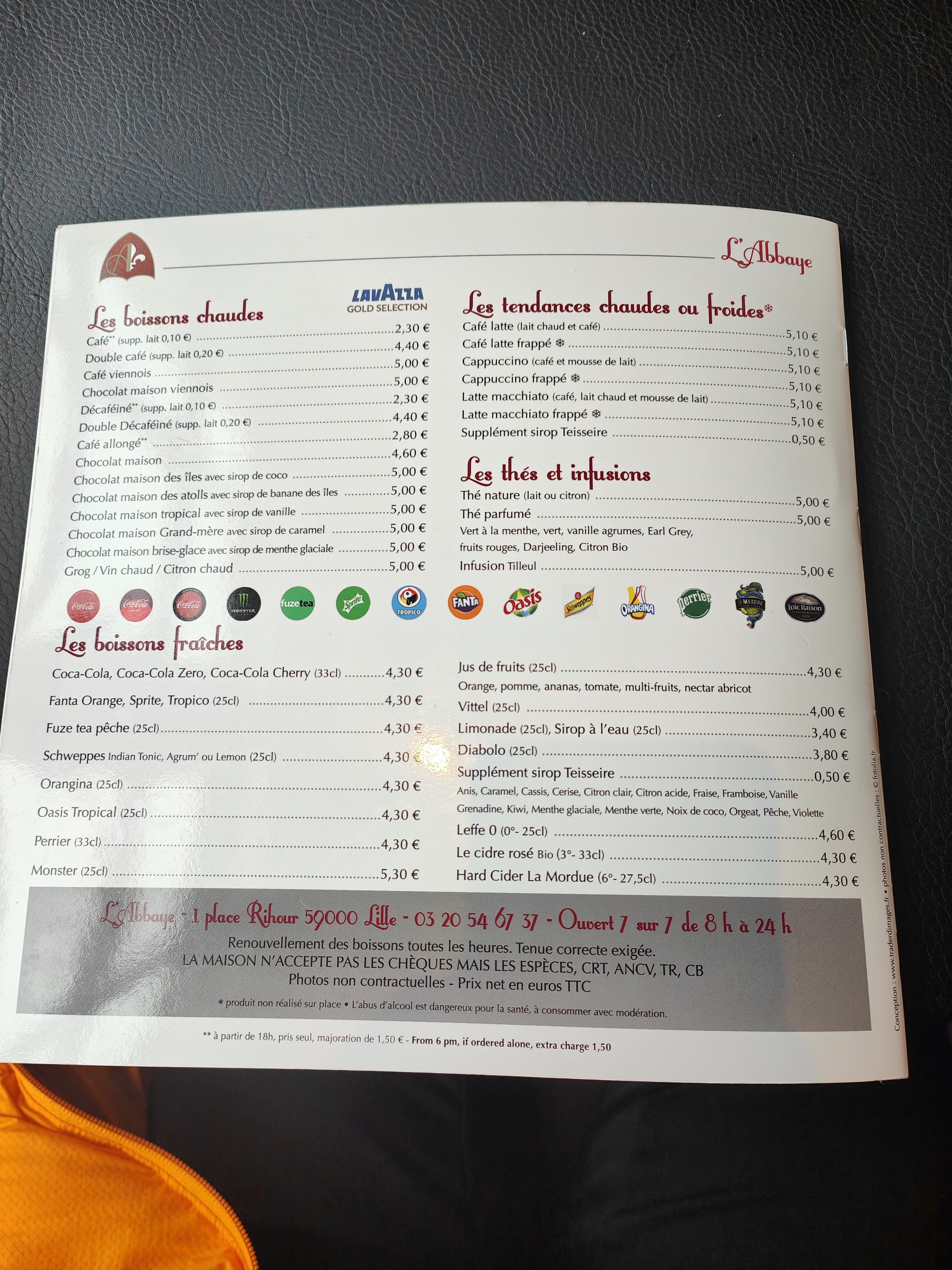 Comme d’habitude j’ai été frappé par le cadre magnifique de l'établissement. De plus il est situé à proximité des parkings souterrains de Lille ce qui est pratique si vous n’habitez pas dans le coin. Cependant, j'ai été déçu par la présentation du plateau de charcuterie qui à mon goût a été bâclé, pour un restaurant comme celui-ci je m’attendais à mieux. En outre, mon hamburger ( burger l’Abbaye ) était froid et le pain était difficile à trancher, mais cela n'a pas été un problème majeur car je ne le trouvais pas à mon goût comparé à la dernière fois où je m'étais régalé en prenant le Cheese burger. Malgré cela, j'ai été agréablement surpris par la gentillesse et le professionnalisme du serveur. Il a fait un geste commercial en m'offrant un Irish coffee pour compenser mon expérience mitigée. Bien que je ne me sois pas régalé comme je l'espérais, je recommande tout de même le restaurant L'Abbaye pour son cadre magnifique et son service attentionné.