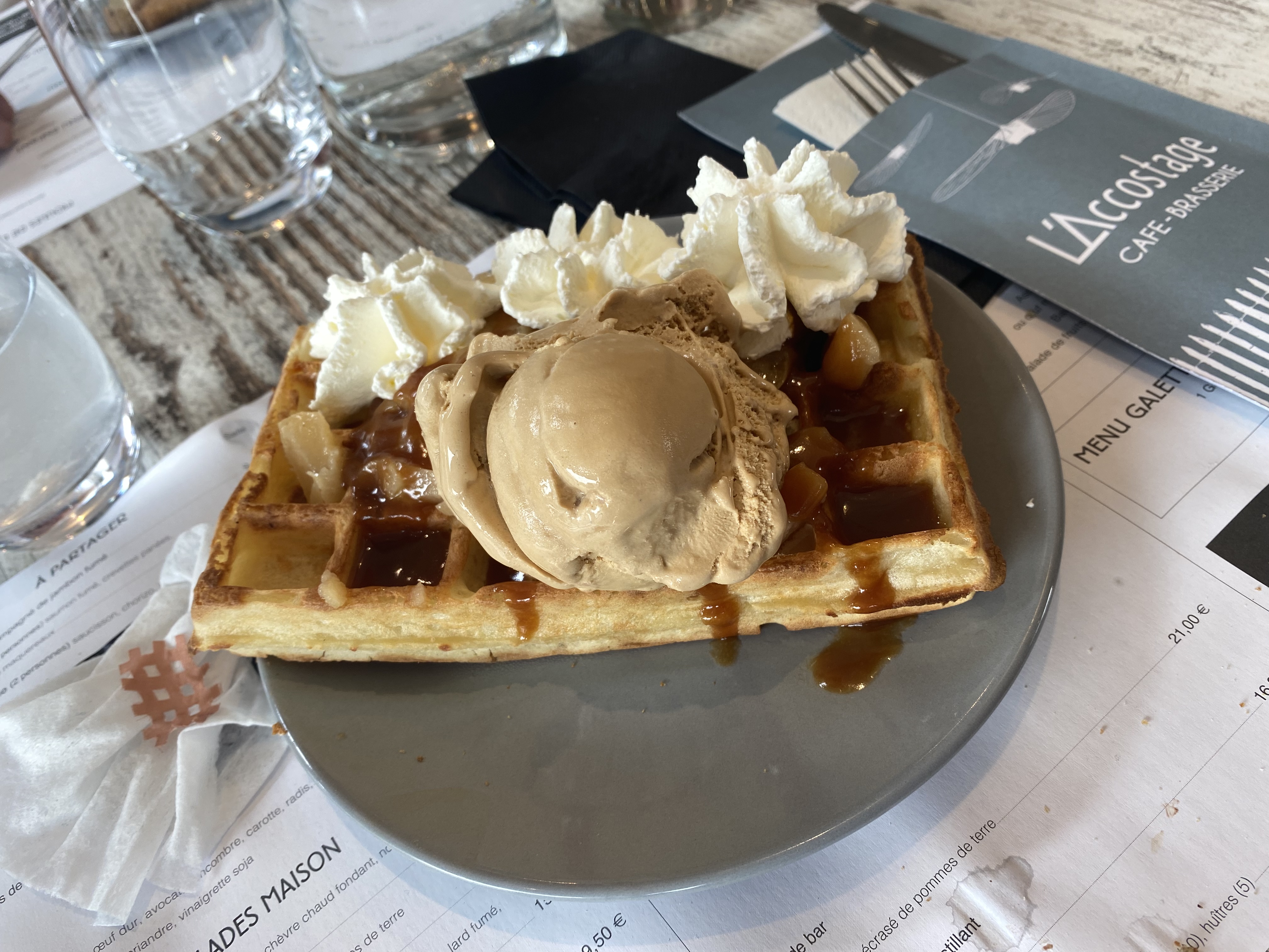 Tout était très bon ! Le serveur était adorable, service rapide, nous avons été bien accueillis ! Merci nous reviendrons 😊 Mon repas était : rillettes de poisson, moules au camembert, gaufre l’accostage : succulent ! ❤️