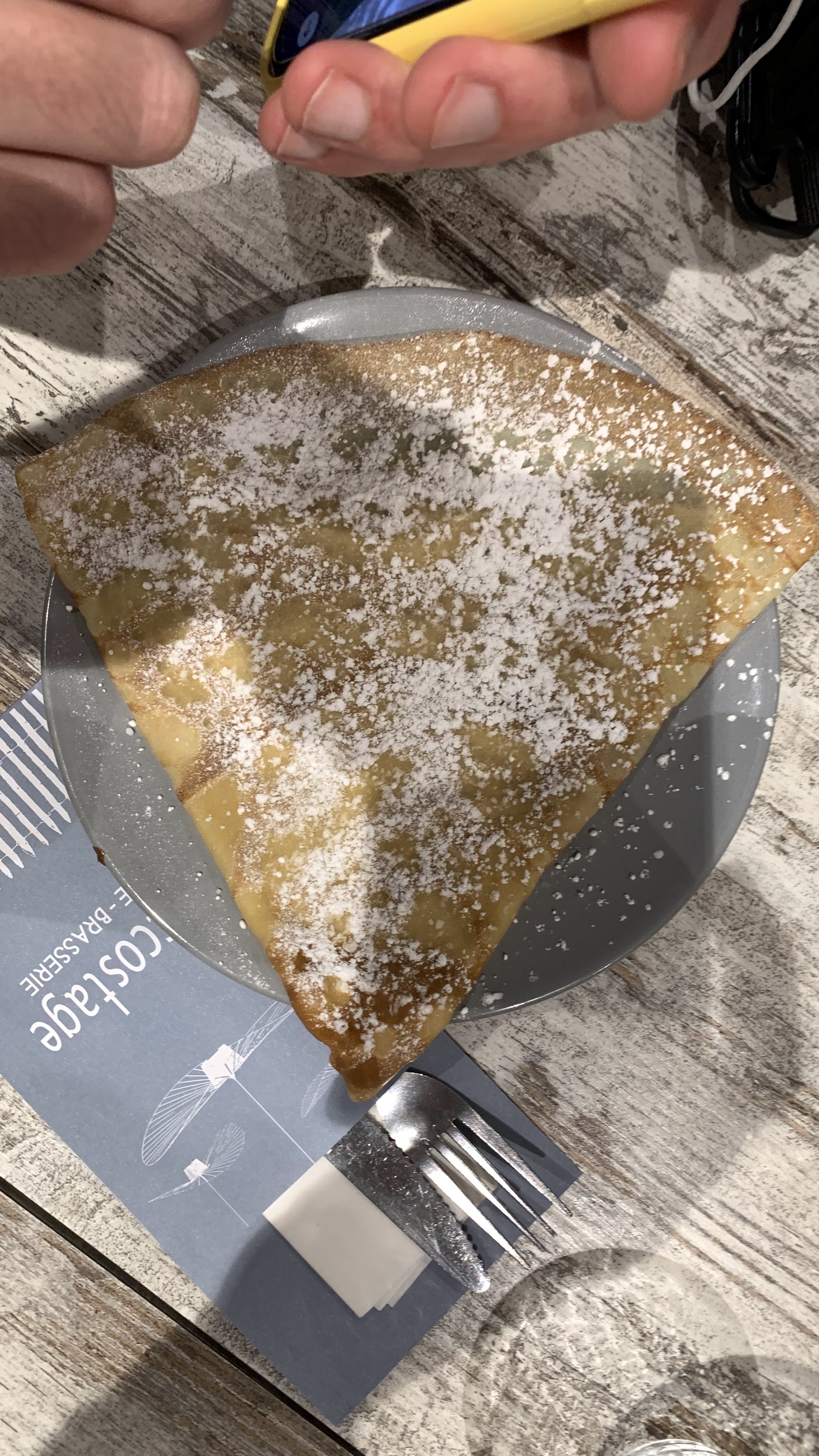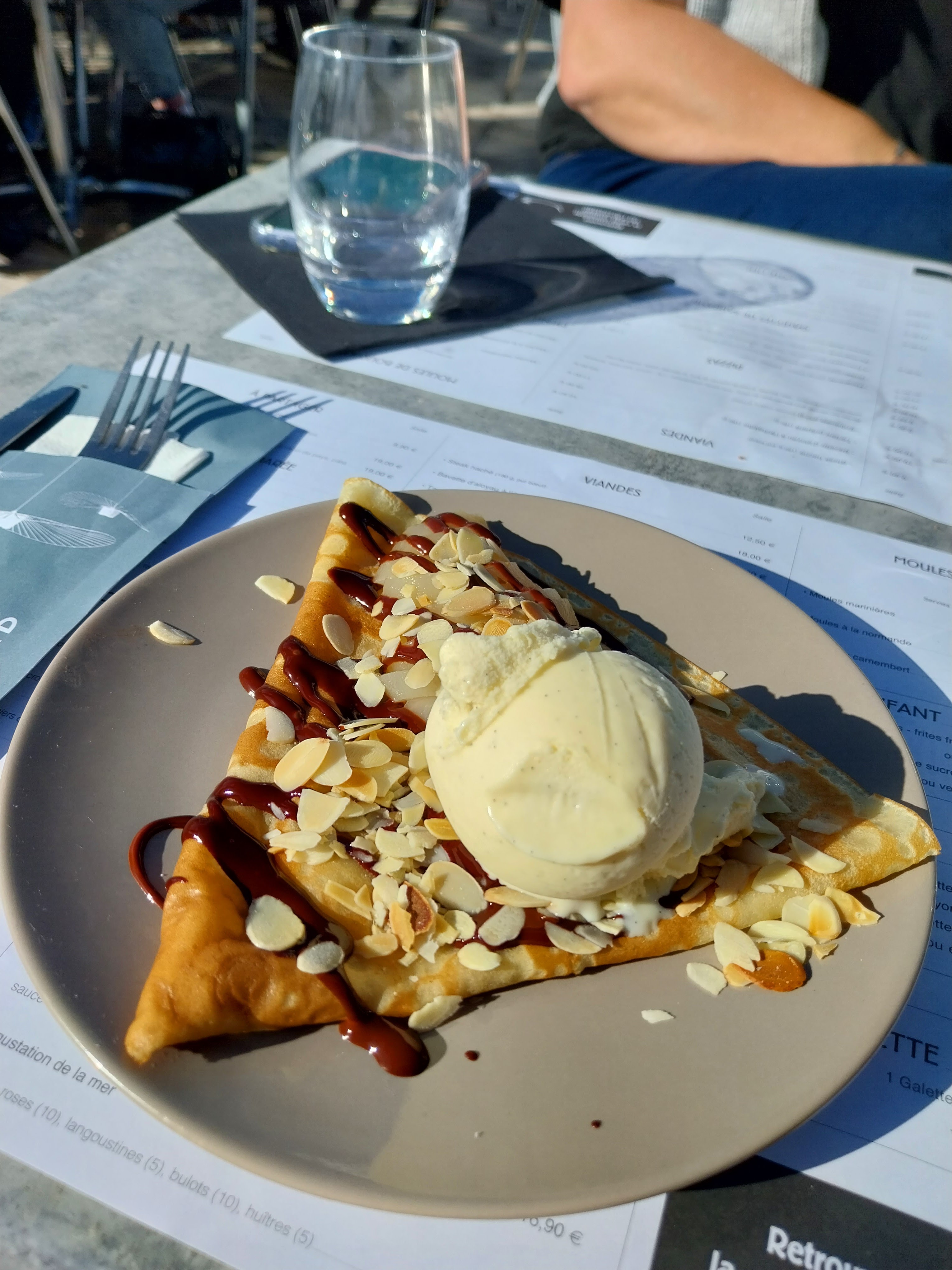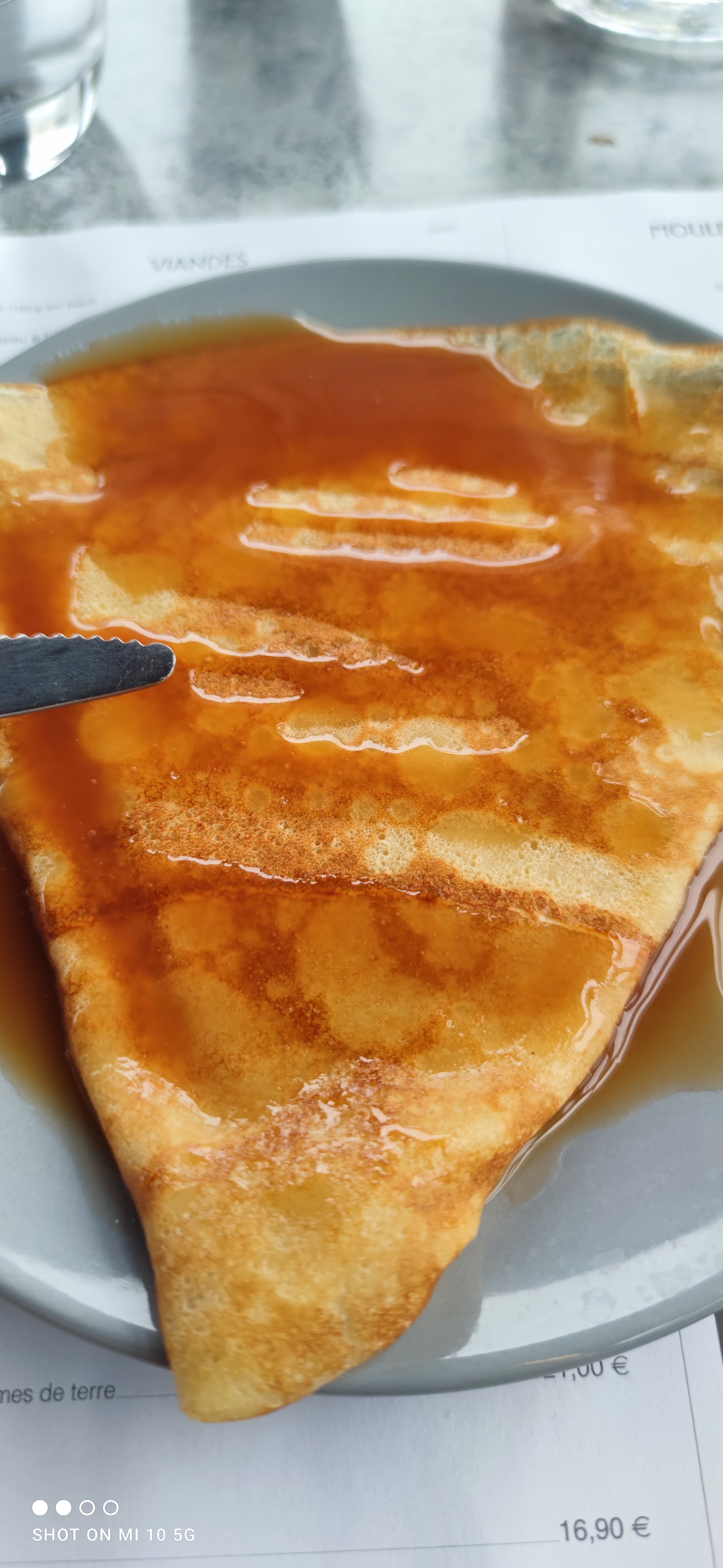 Venue prendre une crêpe pour nos amis canadien, il a fallu changer 3 fois de table pour enfin avoir une table ombragé, la commande vite prise, mais servi une bonne dizaine de minutes après ...