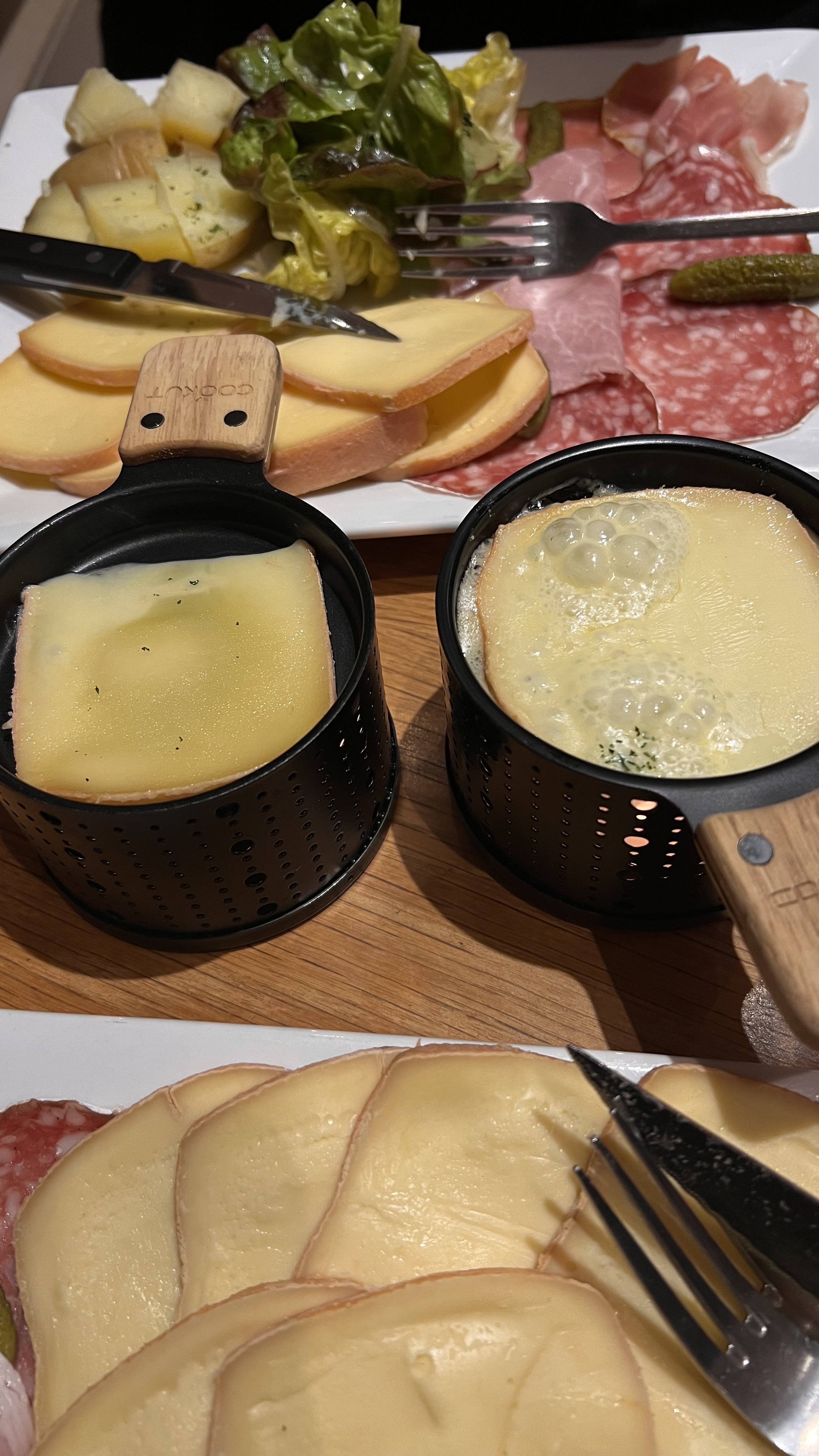 Lorsque vous entrez dans le restaurant, une forte odeur vous prend le nez. Étant du métier, je connais l’odeur du fromage, il devait être très vieux ! Ensuite on s’habitue (plus ou moins !) Nous avons commandé une fondue tradition à 27€80/personne, l’accompagnement de charcuteries se composait exactement de 3 fines tranches de gros saucisson, 1 fine tranche de jambon blanc et 2 fines tranches de jambon fumé, 4 petits cornichons et un peu de salade verte. Très léger pour le prix !!! Nous avons vraiment eu le sentiment d’être tombé dans un piège à touristes