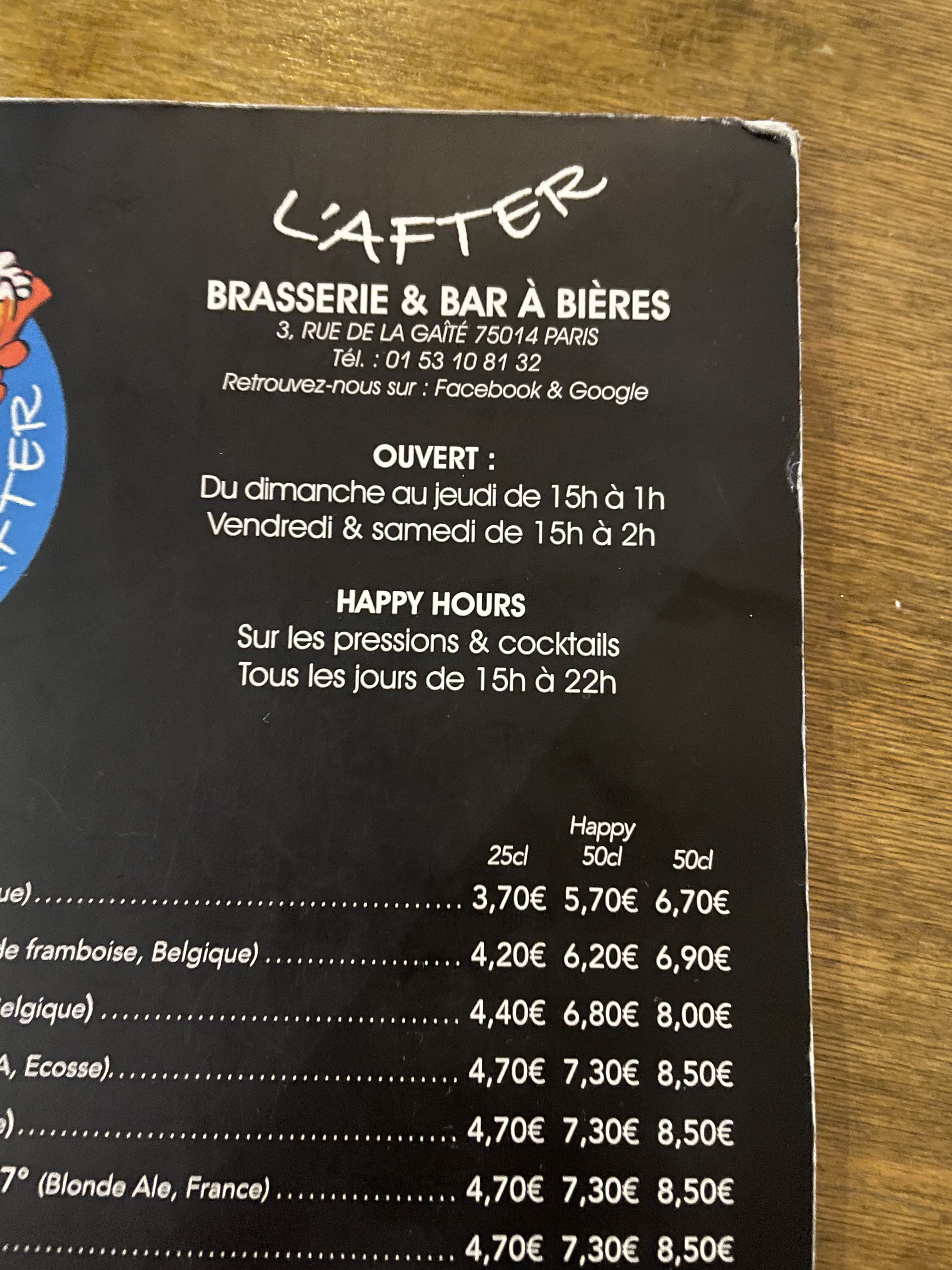 Je viens très souvent à l'after avec mes amis. Il est sans conteste le meilleur bar du quartier, l'ambiance y est bonne, ni trop bruyante ni trop calme, les serveurs sont amicaux et plaisantent volontiers avec la clientèle, les soirs de match, les principales rencontres sont diffusées mais il faut venir tôt si vous voulez de la place. On y apprécie le très bon choix de bières et la diversité des saveurs. L'happy hour vous permet de consommer sans vous ruiner. Je recommande !