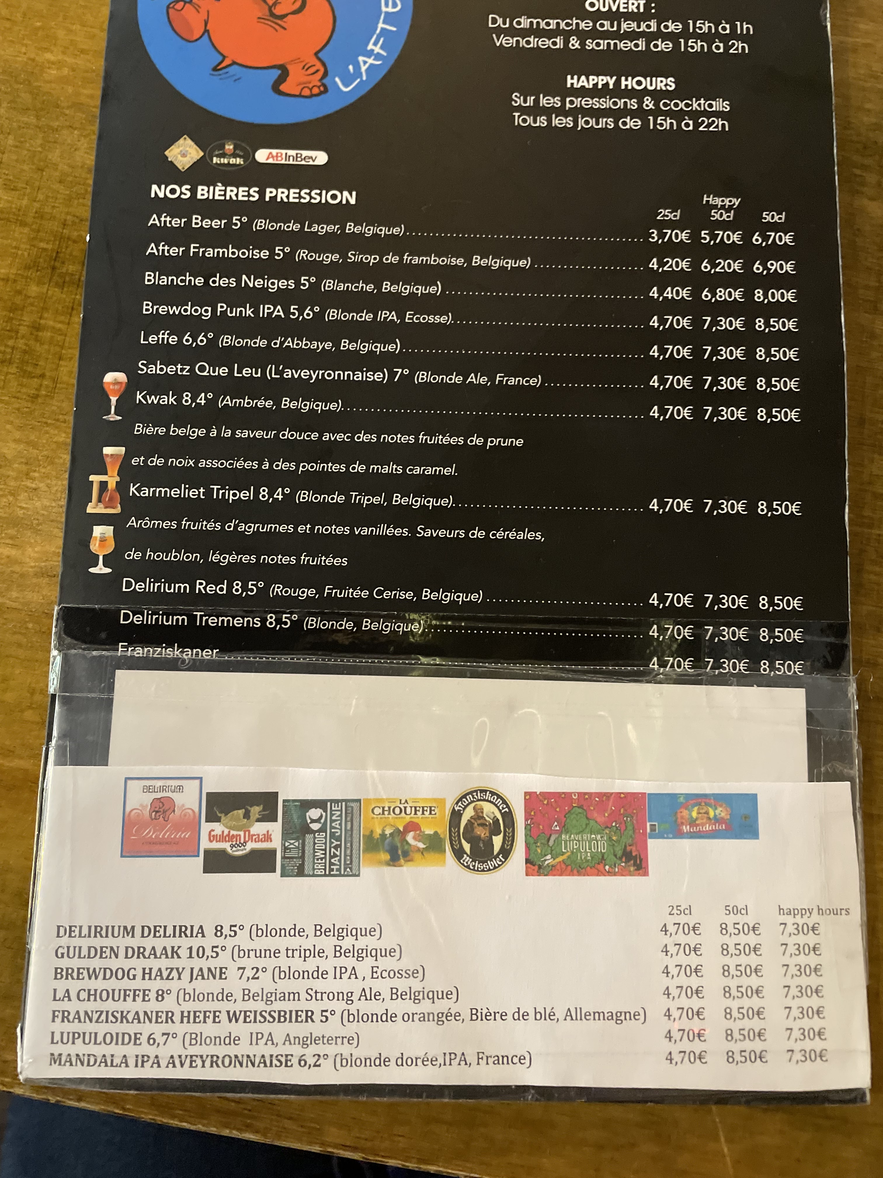 - Delirium tremens ! La pinte à 5 euros en happy hours - happy hours de 15h à 22h - terrasse - a manger (bon) - diffuse le foot