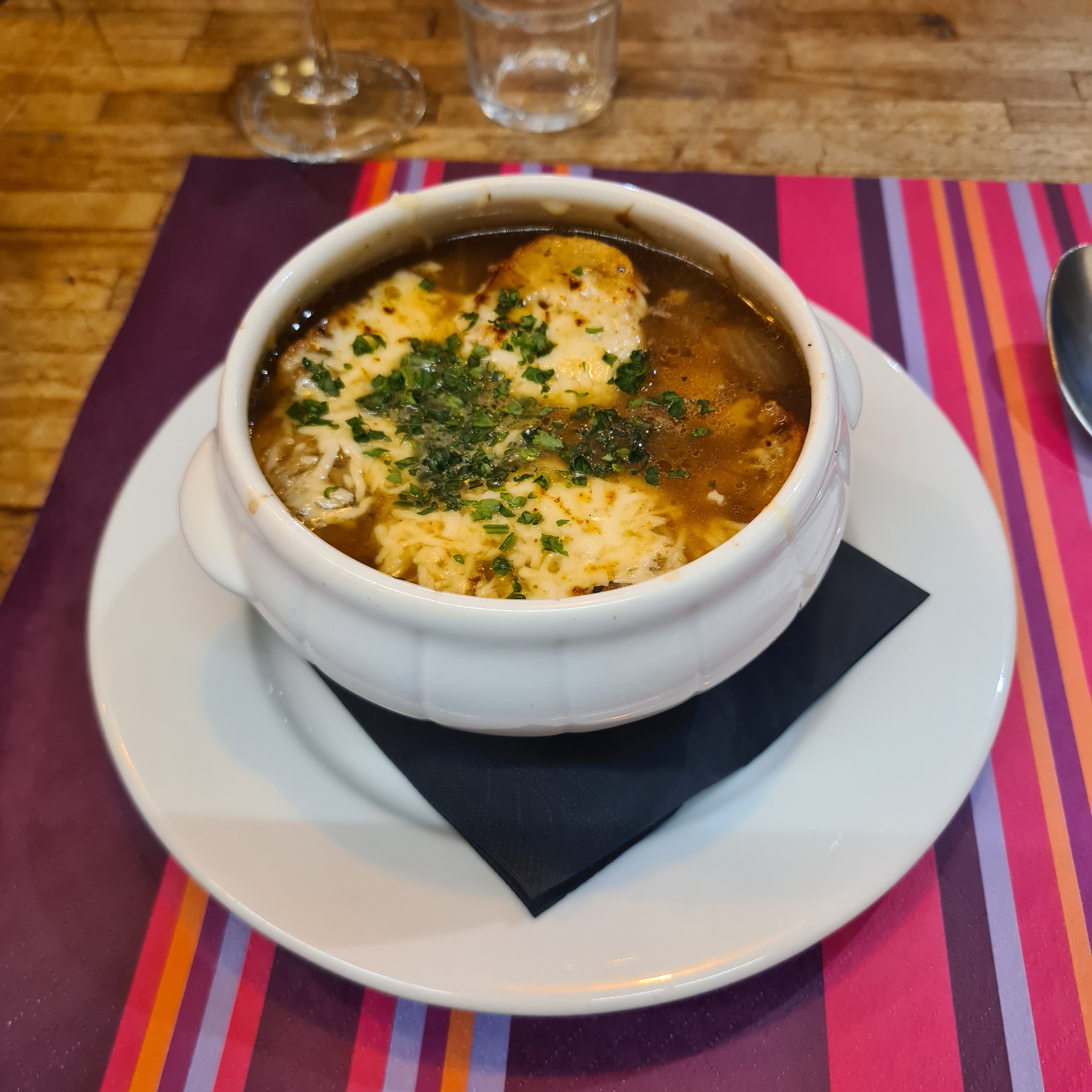 Endroit mignon pour un déjeuner léger ou un verre de vigne. Grand choix de vins et charcuterie. Merveilleuse soupe à l'oignon française.
