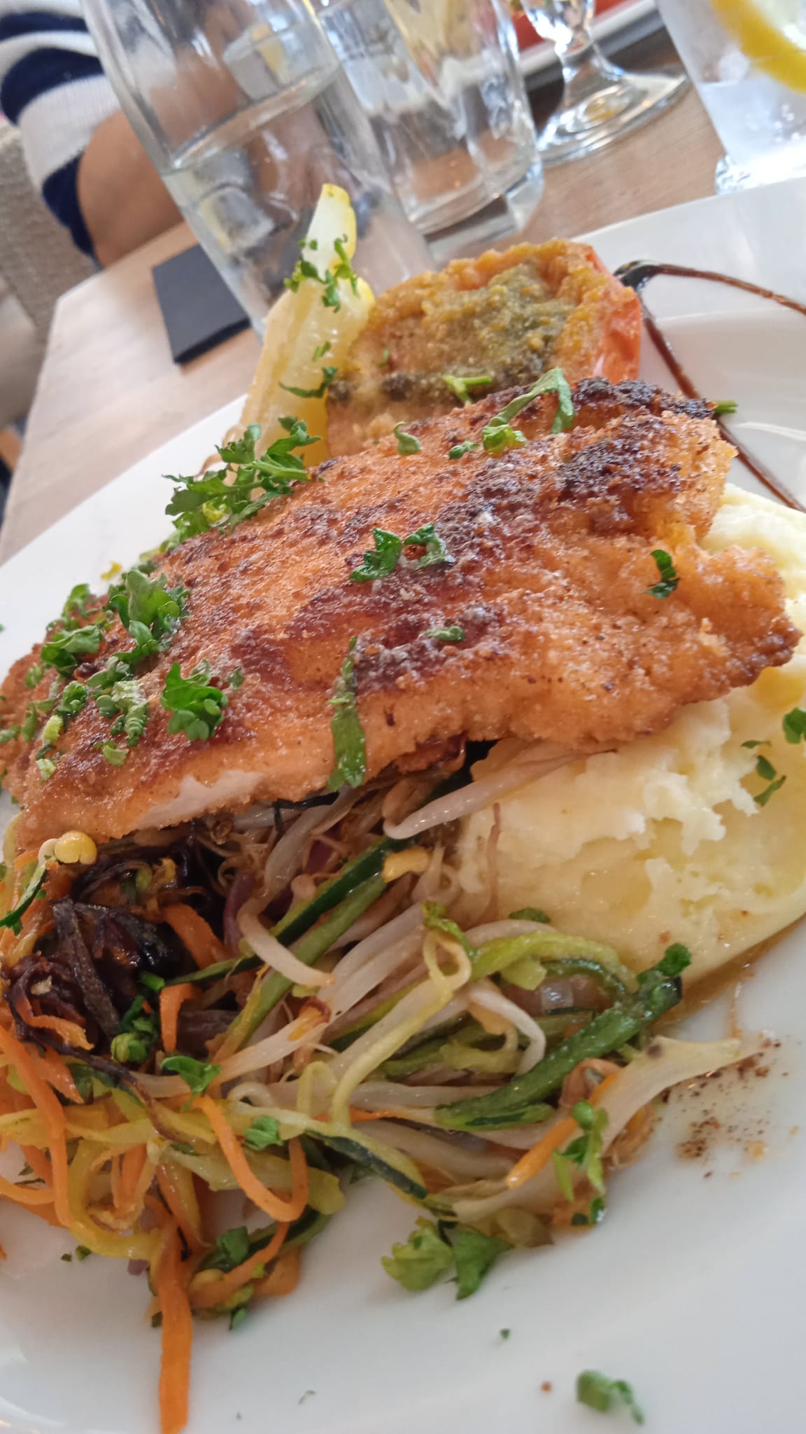 Le plat du jour était très bon, le poisson super tendre, vraiment un régal rien à redire ! Les frites et le burger très bons aussi. La note est cependant salé pour 2 apéros 2 plats et 2 desserts… (85euros) nous avons trouvé ça cher. Deco sympa surtout au niveau de la terrasse.