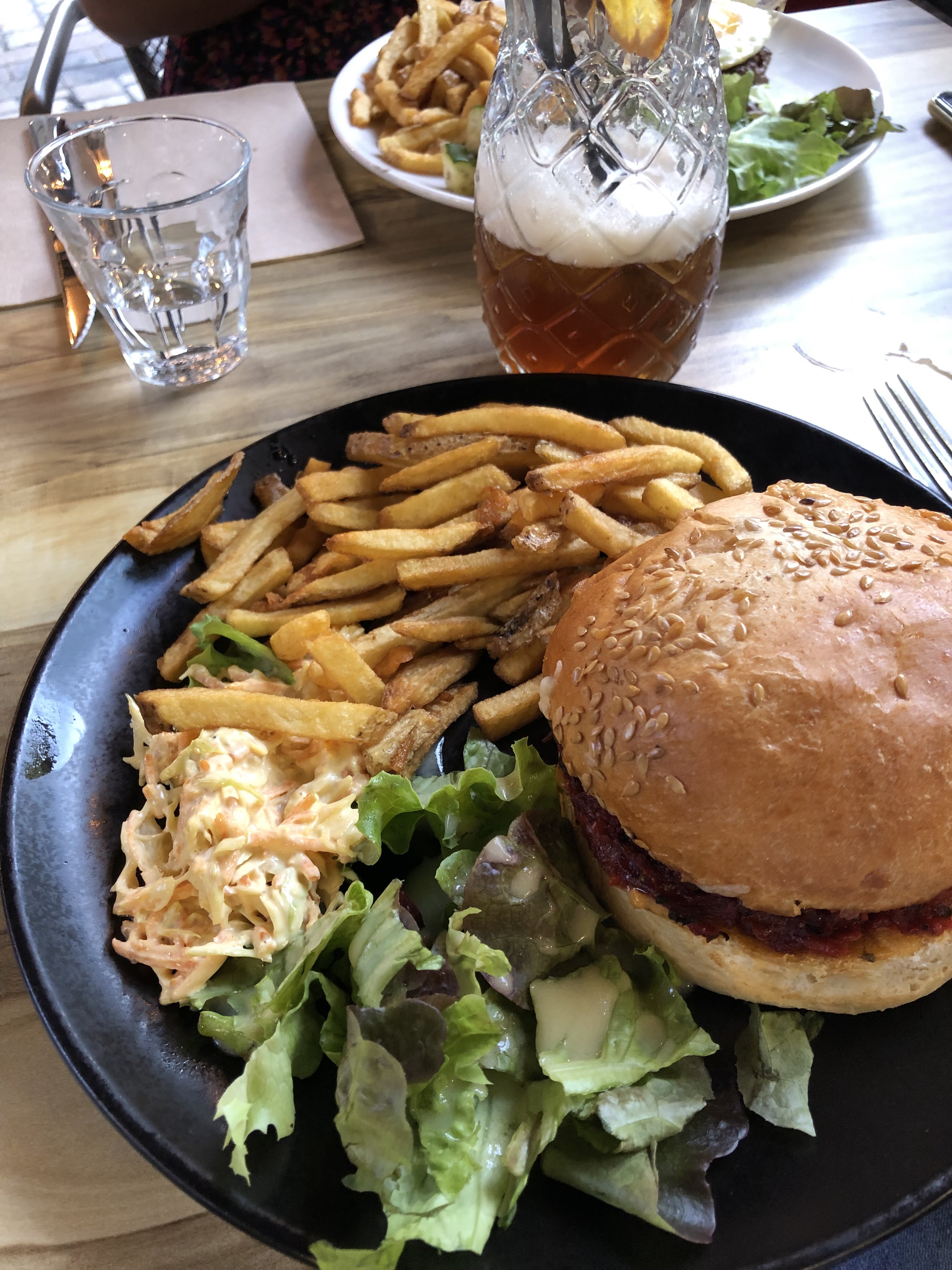 Repas de qualité. Les frites sont maison et le pain burger provient d'une boulangerie (c’est appréciable). La galette aux légumes du burger était bonne et très légère (contrairement à certains burgers où parfois c’est l’inverse). Le moelleux au chocolat très bon ! (Et sans gluten pour les intolérants, à noter l’attention). Nous sommes venues entre copines un vendredi soir, aucune attente, et le personnel était très gentil. Nous reviendrons !