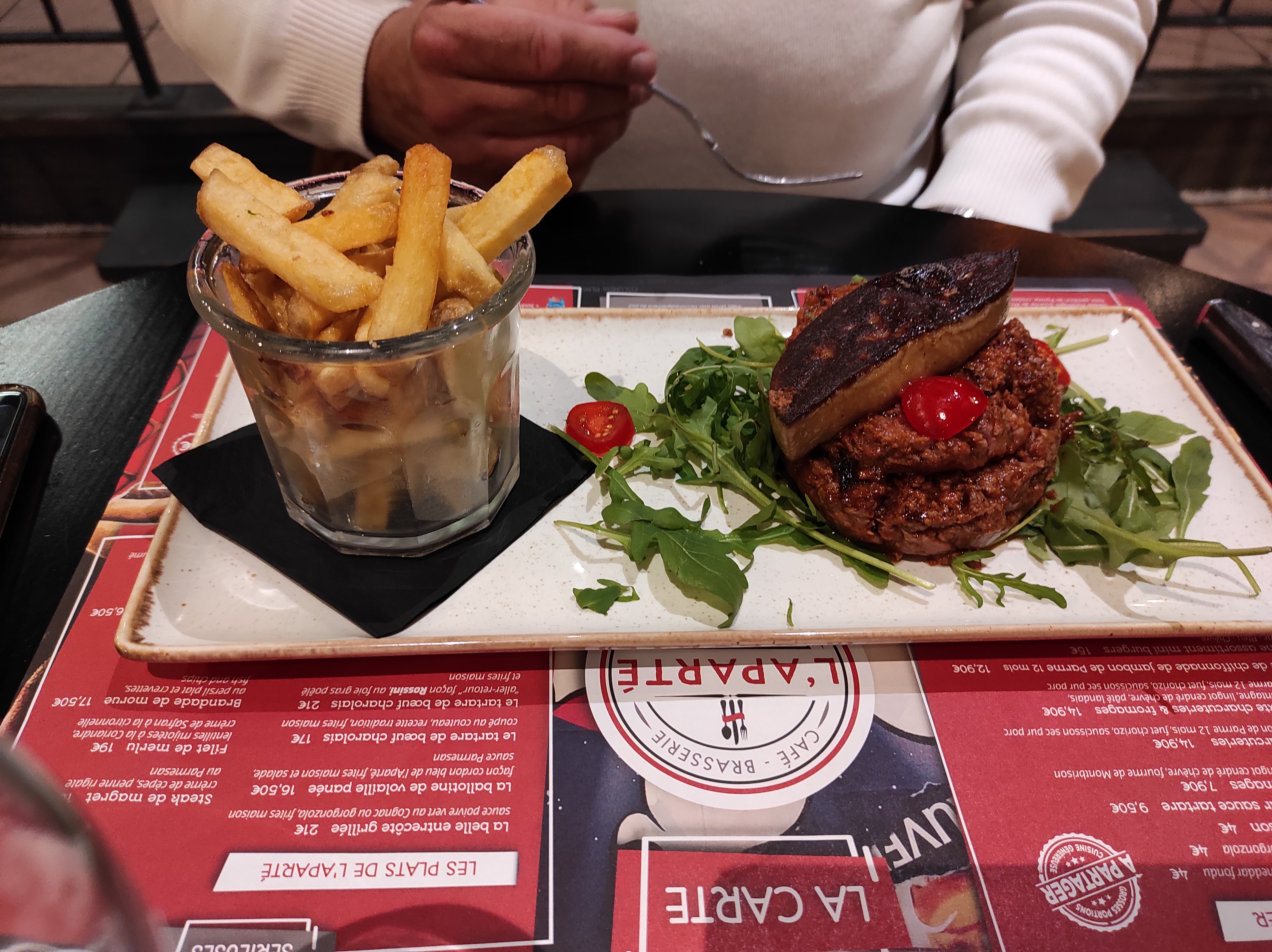 Notre visite dans ce restaurant fût globalement agréable. Nous avons commandé un burger, et des côtelettes d’agneaux tout deux accompagné de frites (maison) mais malheureusement, les frites n’étaient pas maison. Heureusement, l'équipe de serveurs était très sympathique, ce qui a contribué à rendre l'expérience plus positive malgré ce petit bémol.