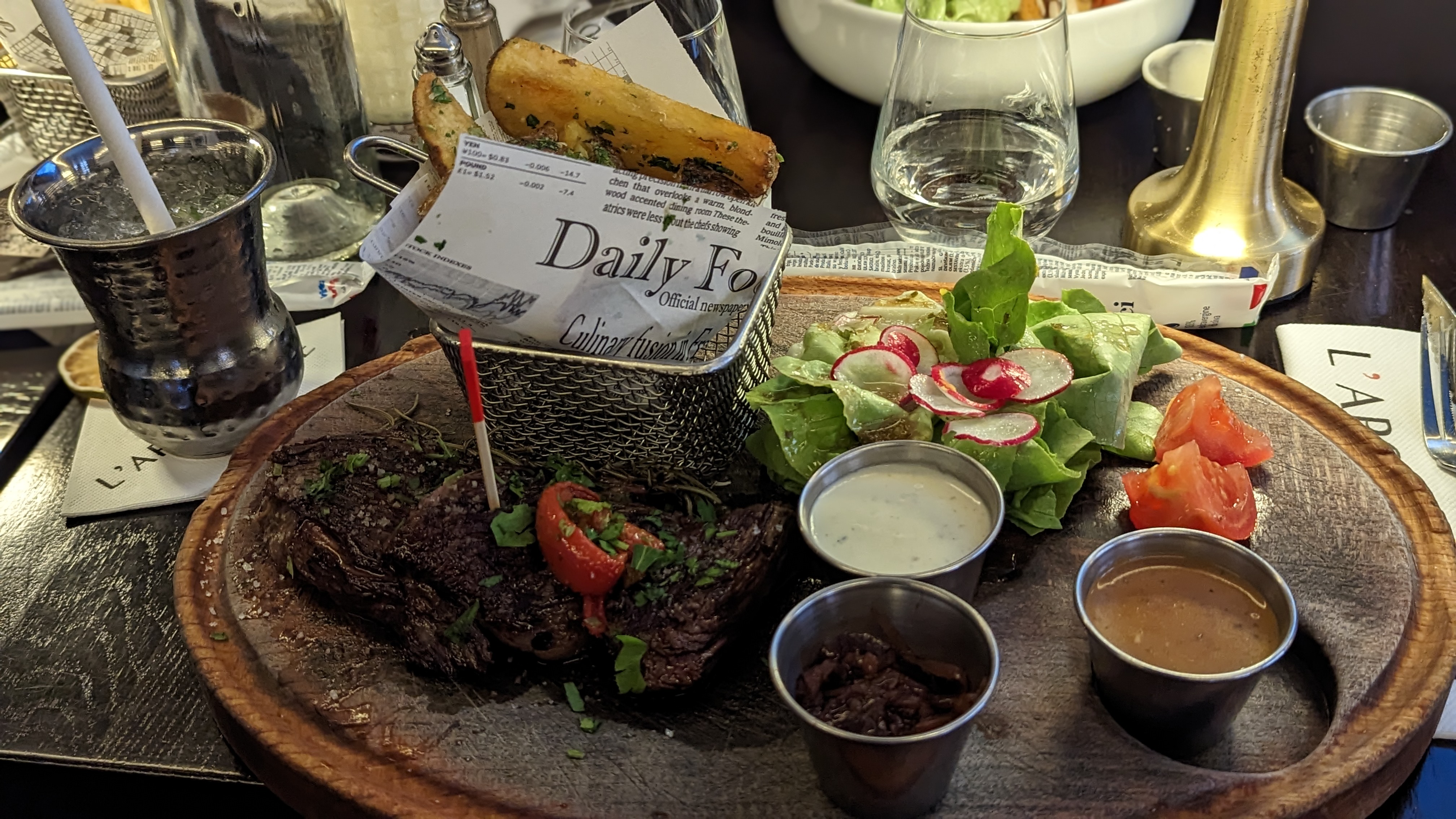 Nous avons dîné dans ce resto car la carte correspondait à nos envies du jour. Des salades, des viandes et Burger très copieux, des planches de charcuterie, fromages ou perigourdines... L'endroit est sympa tout comme les serveurs. Les planches sont bonnes et belles, la tomate buffala est également bonne. Concernant les plats, l'entrecôte angus était tendre et goûtue. Mon risotto cèpes St Jacques n'était pas exceptionnel il manquait de goût et les St Jacques trop cuites. Pour le dessert nous avons partagé le cheesecake qui nous avais été recommandé par le serveur. Et là mauvaise cuisson (encore) car il avait trop le goût d'oeufs et une texture d'omelette et mauvais équilibre entre biscuit et cream cheese... Pour résumer une carte attrayante mais quelques loupés...