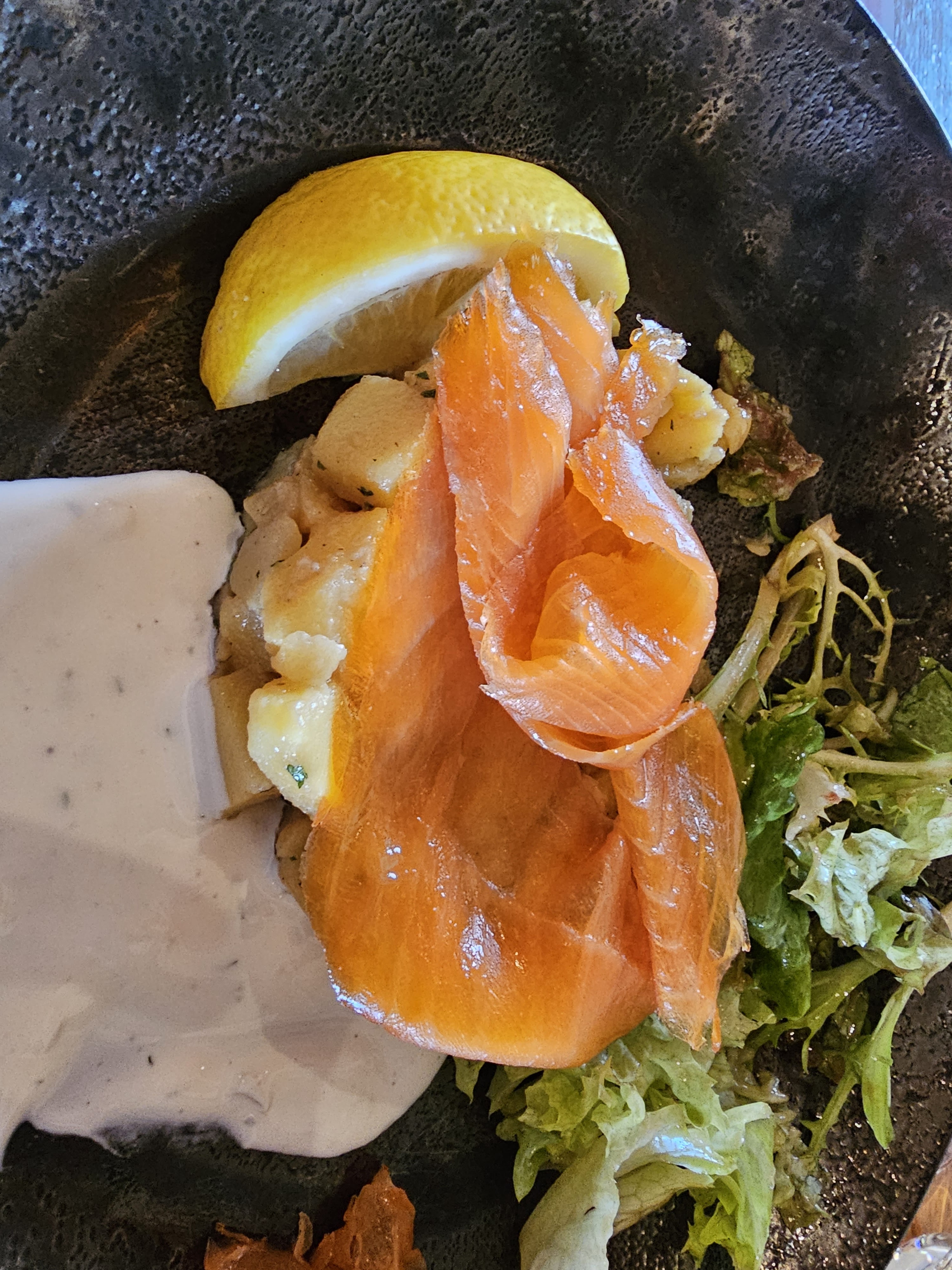 Très décevant, assiette de saumon mariné et tartare : le saumon n'était pas mariné et le tartare de la valeur d'une cuillerée à café et encore ! le filet d'agneau en croûte... la croûte immangeable l'agneau annoncé comme rosé trop cuit et la garniture à minima , un peu d'oignon et de poivron !!!!dommage, le cadre est agréable