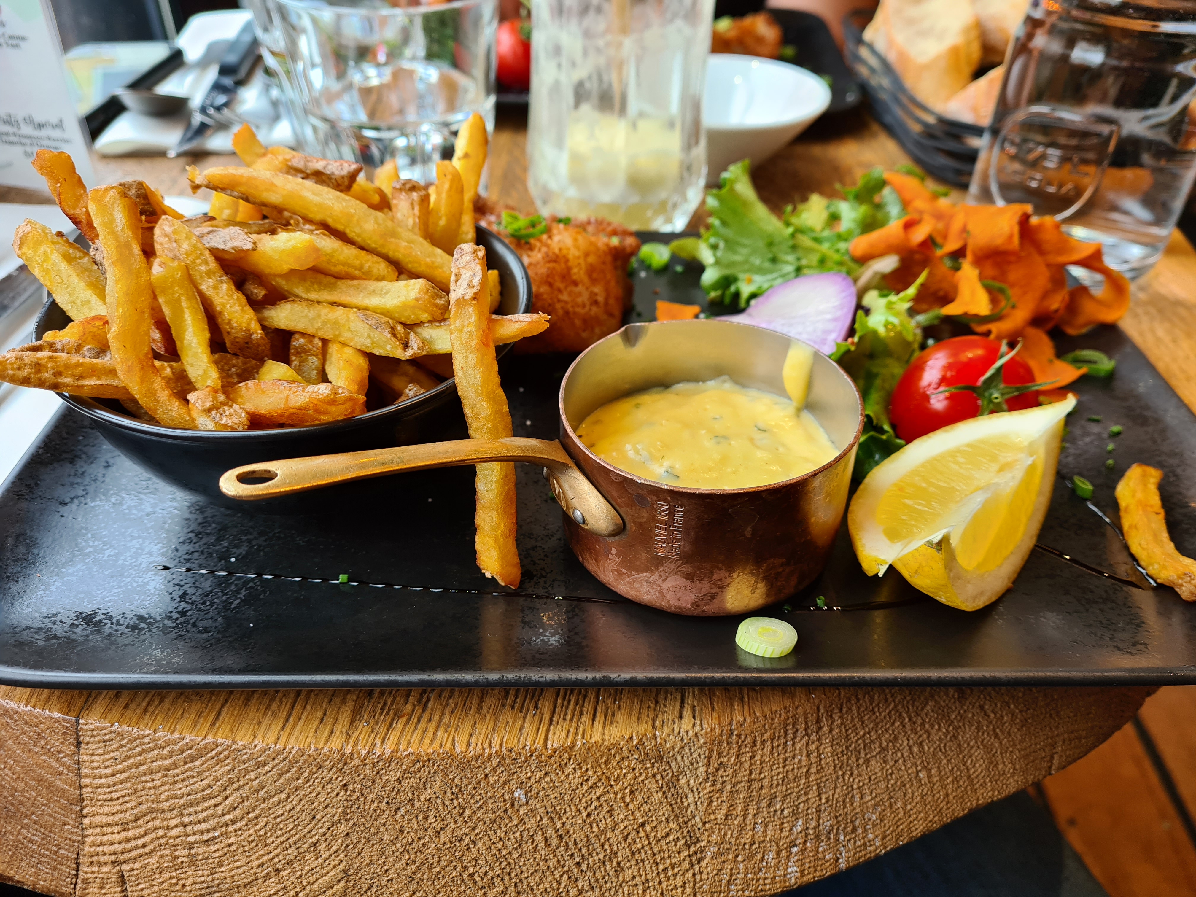 un bon fish and chips. cadre atypique. Le lavabo des toilettes avec un pneu : trop fun. Frittes maison délicieuses ainsi que les desserts