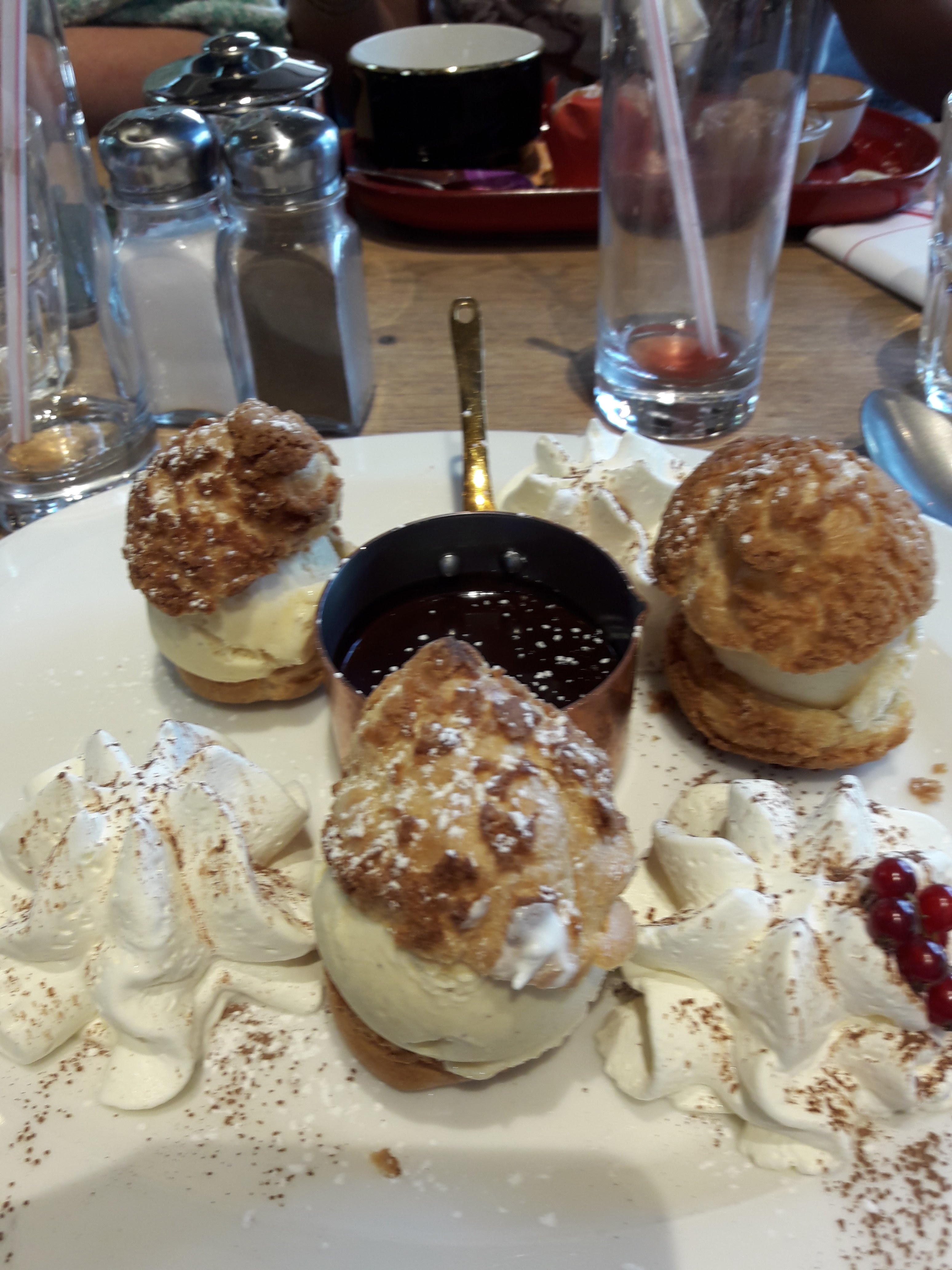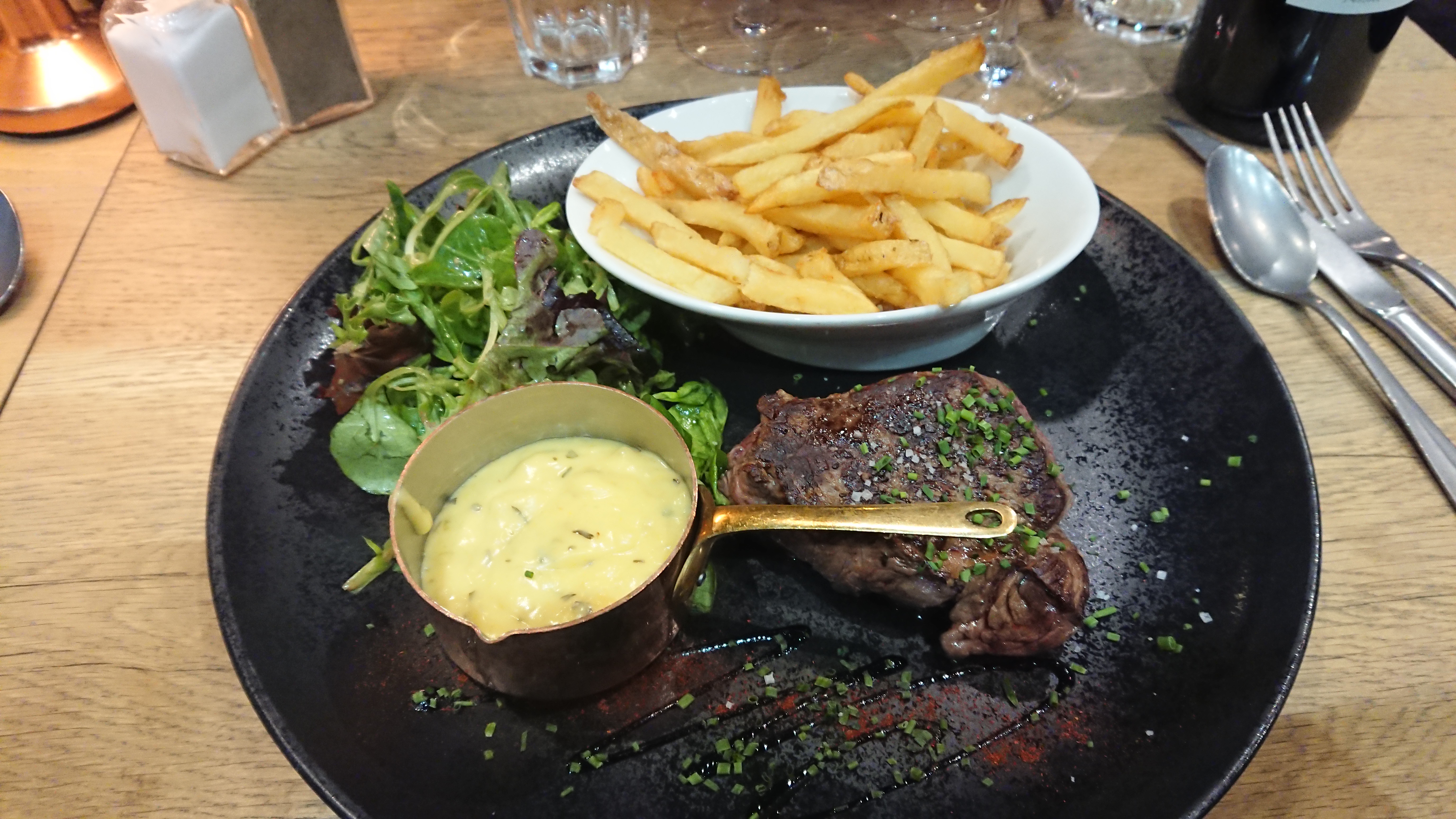 Ambiance sympa, côte de bœuf saignante bien trop cuite, profiteroles super sec… mais frites bonnes. Le prochain coup je prendrai autre chose…