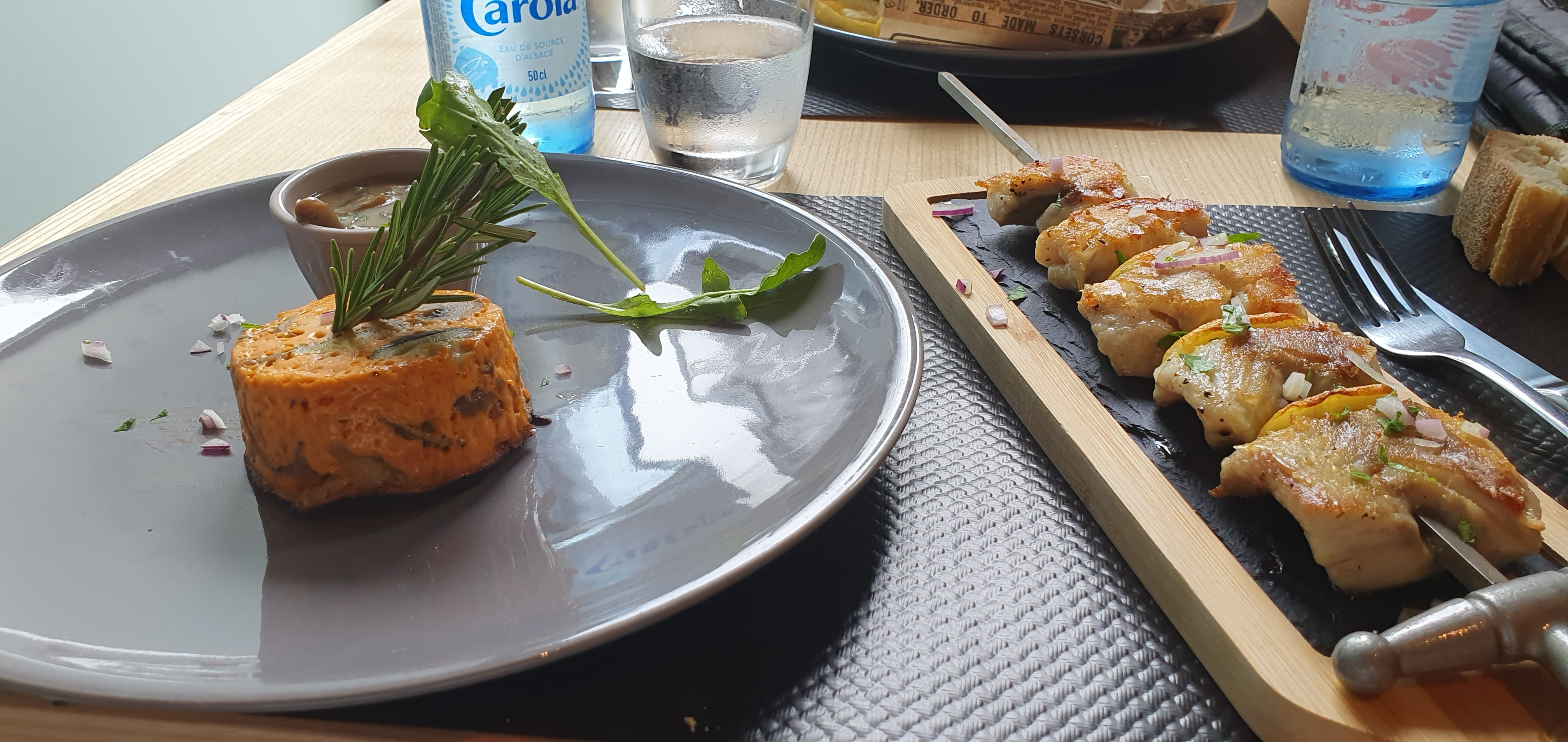 Les quantités dans l assiettes sont à revoir 5 petits morceaux de canard sur une brochettes et un mini flan de légumes un peu chères à revoir sinon sympa l endroit