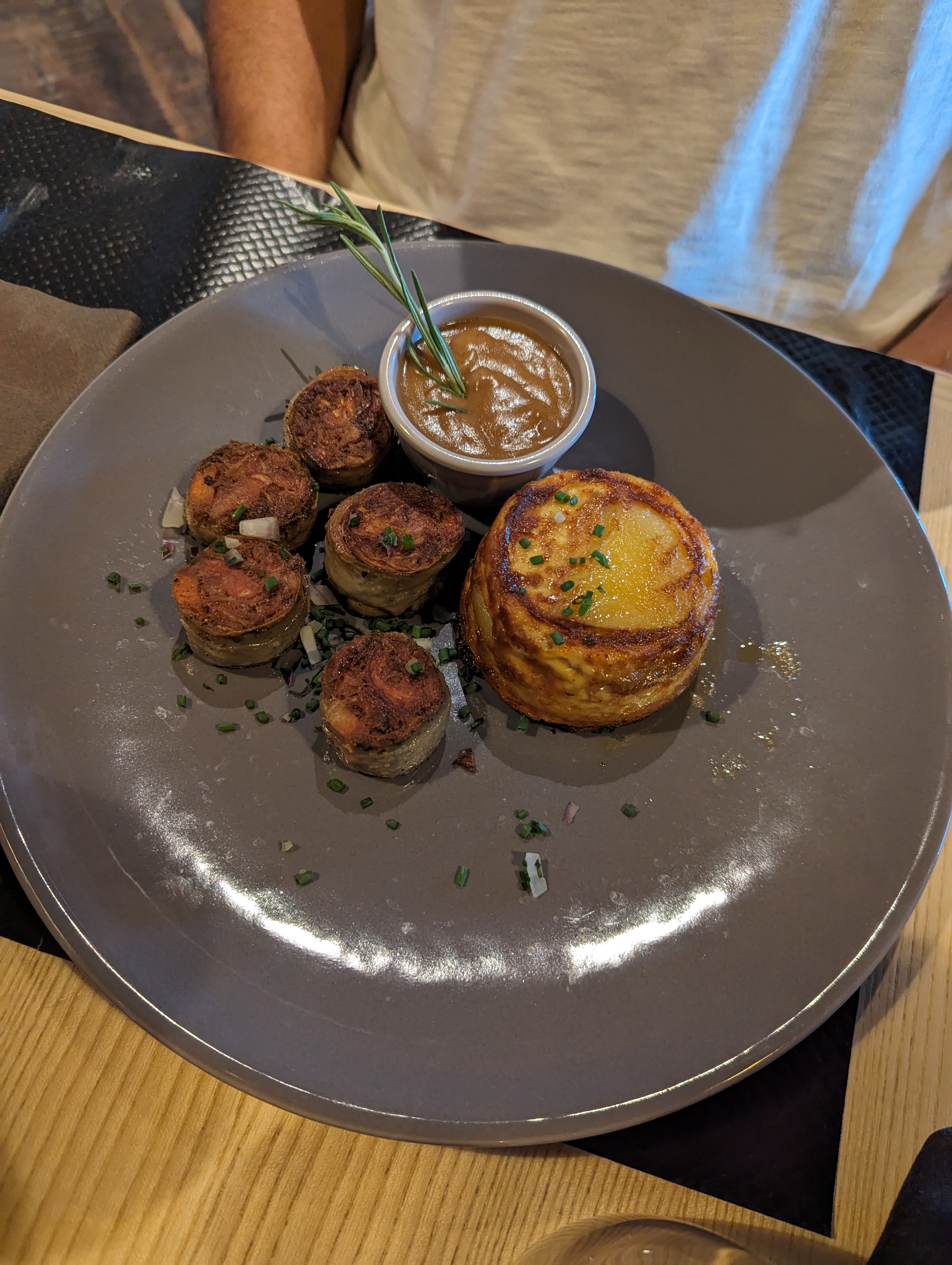 Restaurant visité à 2 reprises. Un peu d'attente la première fois. Ils se sont trompés dans les plats mais les ont remplacés par ce qui avait été commandé. Un en-cas non payé du coup sans conséquence. Ça démarre mais il y a une bonne volonté et de la qualité. Les desserts sont particulièrement bons. Les options veggie restent à agrémenter. La salade et la brochette ne sont composés que de légumes. Manque de protéines ou de légumineuses. Ou sont les lentilles, le quinoa, le seitan, le tofu par exemple ? Le burger veggie avec une galette de pomme de terre est sympa mais pas équilibré du coup. Comme la majorité des restaurants vosgiens le végétarien/végétalien reste caricatural. On retire les protéines et hormis viande poisson oeuf on ne sait pas remplacer. Le cadre est sympa. Sobre, relativement neutre. Les tarifs sont abordables. L'adresse mérite de s'ancrer dans la durée dans le paysage neocastrien. Le bilan est positif.