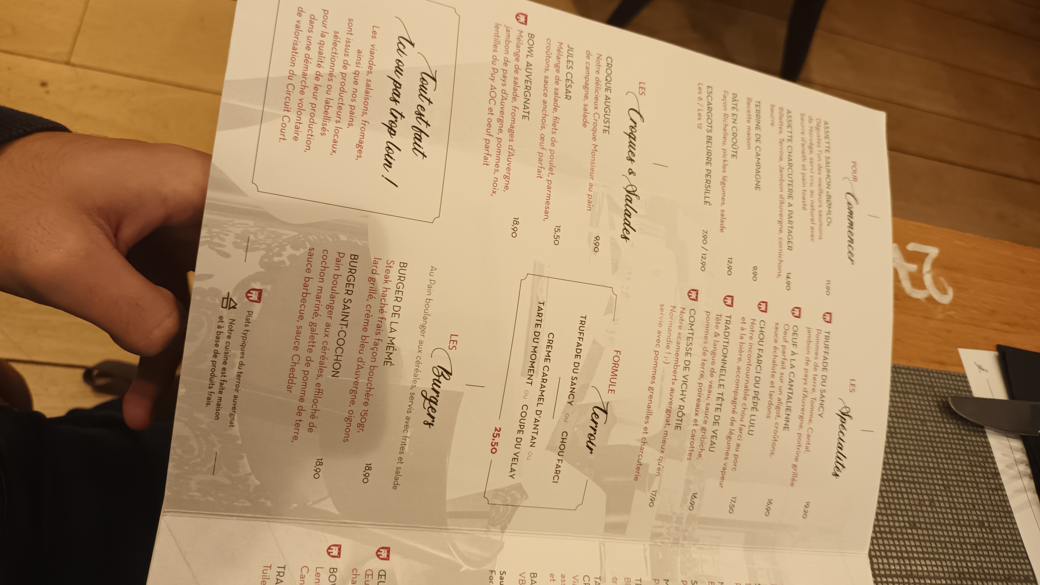 Lieu très sympathique dans le thème de l’Auvergne et de son terroir, plat régionaux très alléchants et produits de qualité. Repas très appréciable, saveur au rendez-vous et surtout une belle générosité dans les quantités, estomac plein avec une salade fourni. Serveuse très sympathique et prend du plaisir à faire son travail.