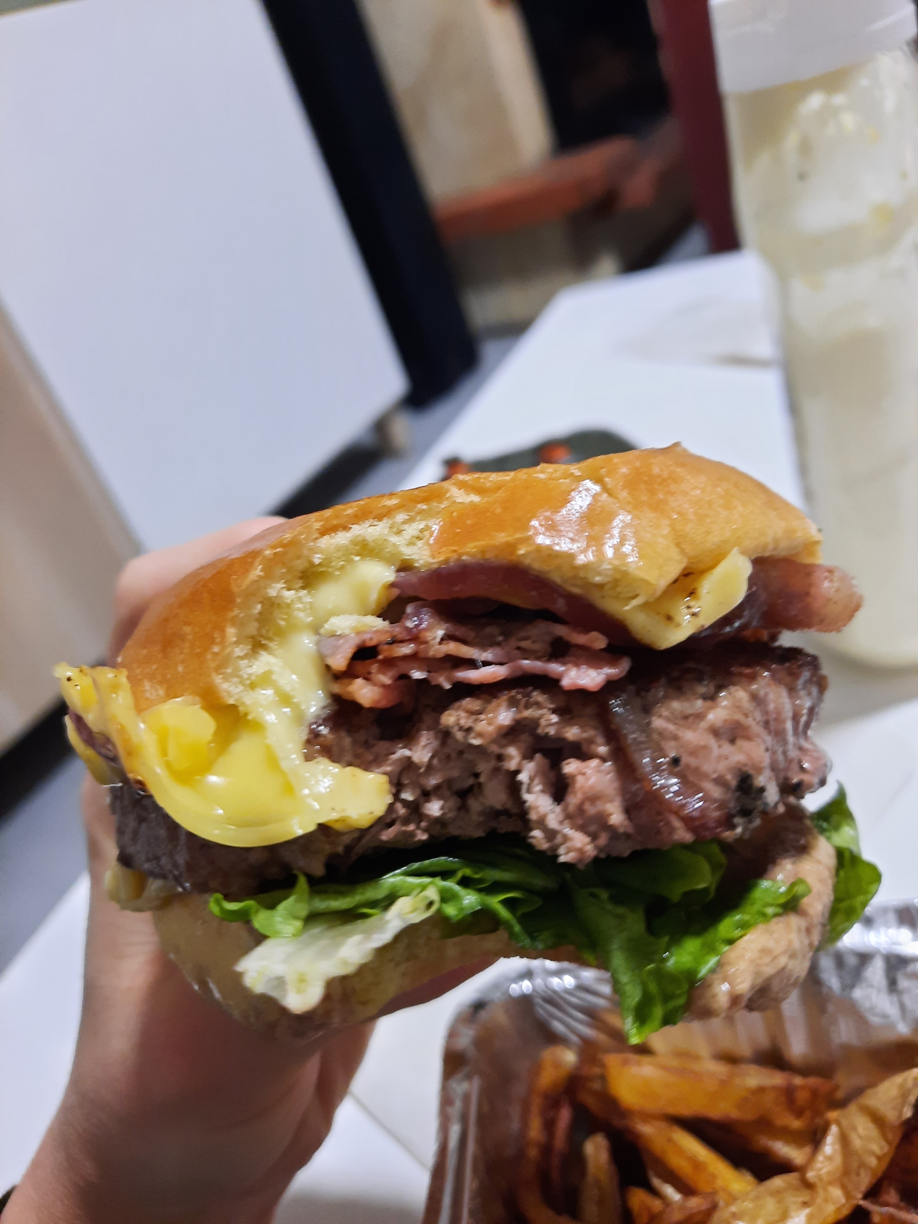 Frite grasse pas cuite avec la pelure et non salées vraiment pas bonne dommage car c'est fait maison ! Burger tres petit et sans sauce conditionné dans une barquette sur les frite entouré aluminium plus rien avoir avec les burger d'avant