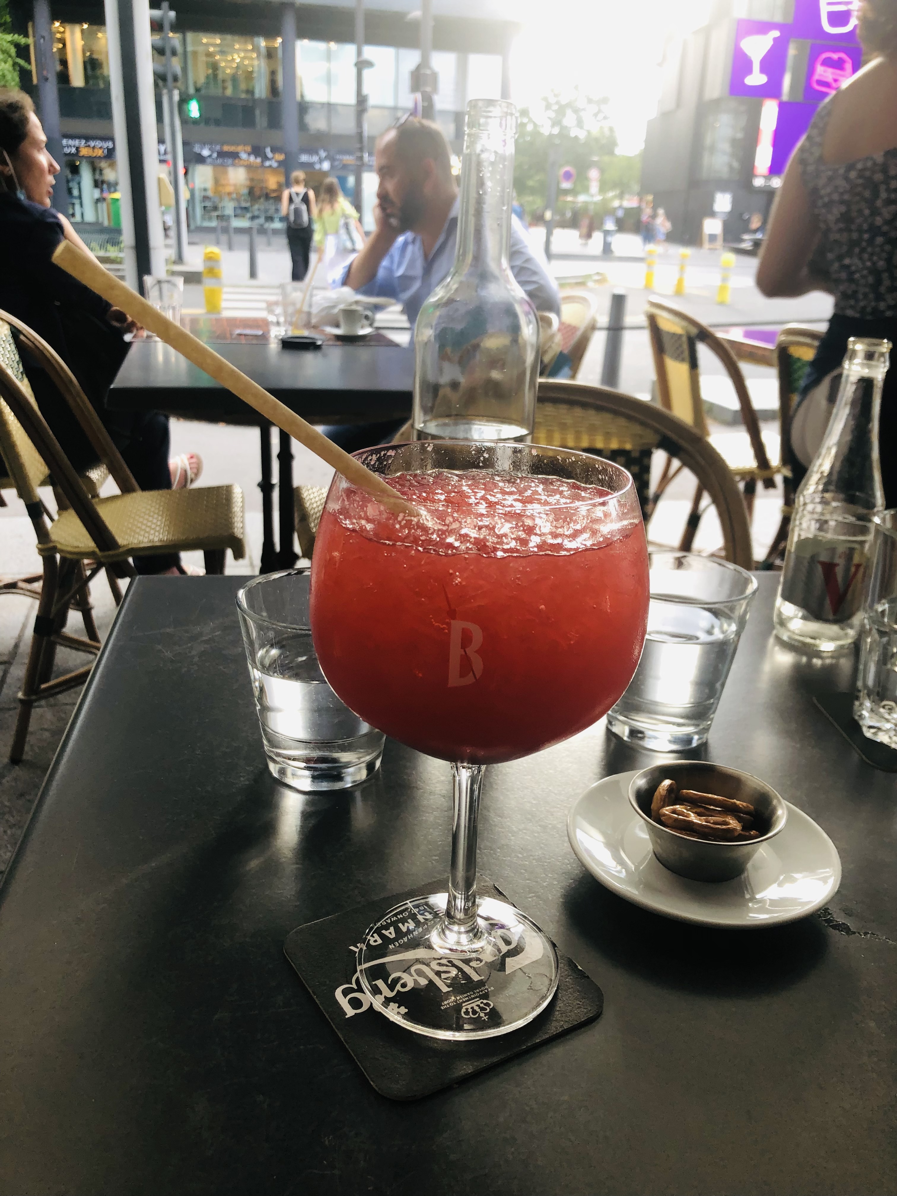Table de 4 4 verres : 2 cocktails , une bière et un verre de vin Les prix sont très hauts et malheureusement la qualité des boissons n’est pas là. Les boissons ont l’air d’être très diluées, et les cocktails et bière ne sentent pas très bons. Le vin n’est pas bon non plus :( L’ambiance est très bonne ceci dit et les serveurs à l’écoute. Je n’ai pas testé la nourriture, alors je ne me prononcerai pas la dessus
