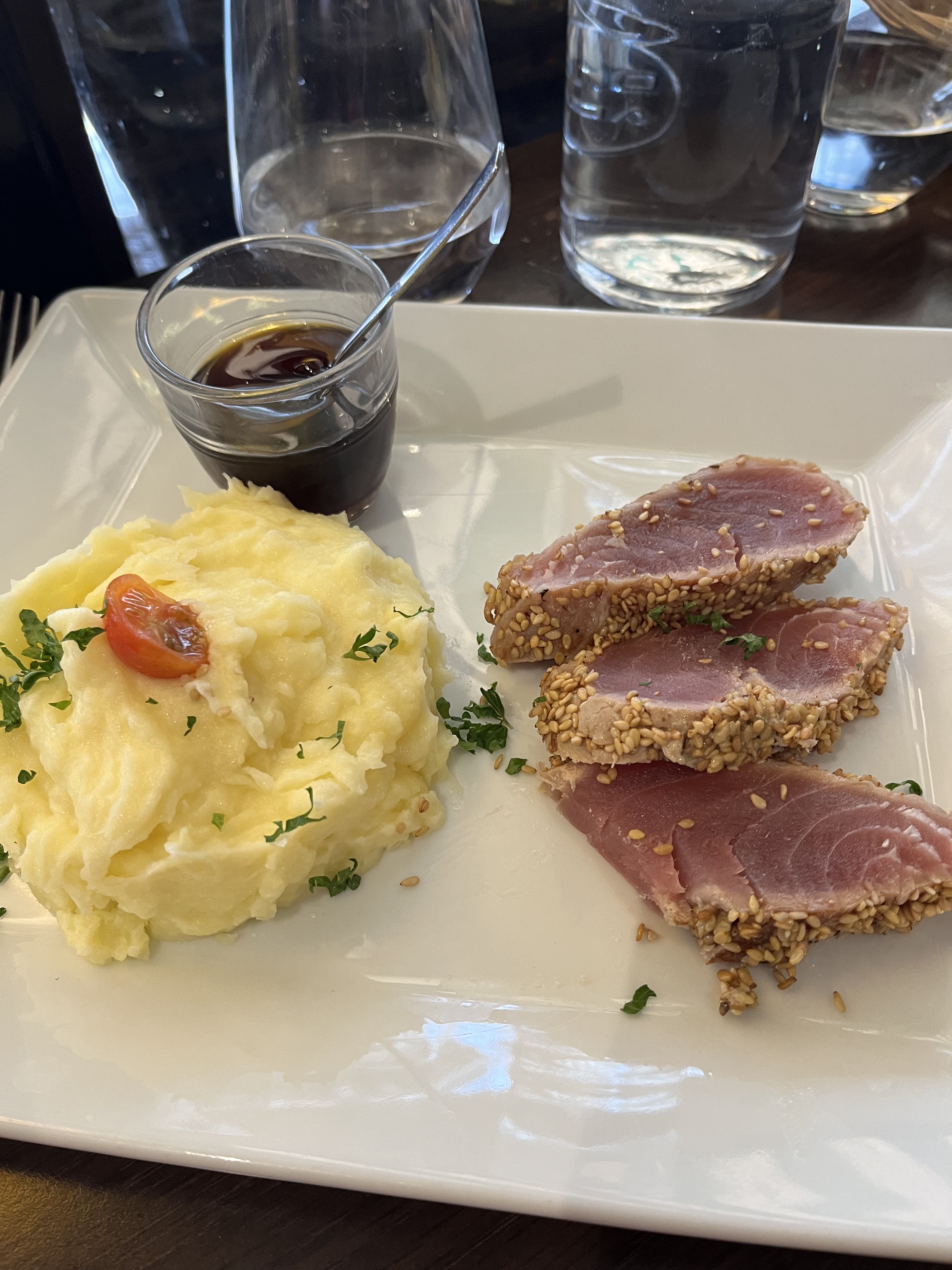 Très bon dîner en terrasse à l’Eden Nous avons pris le steak de saumon purée Très bon ! Service rapide et sympa Terrasse calme en ce samedi soir