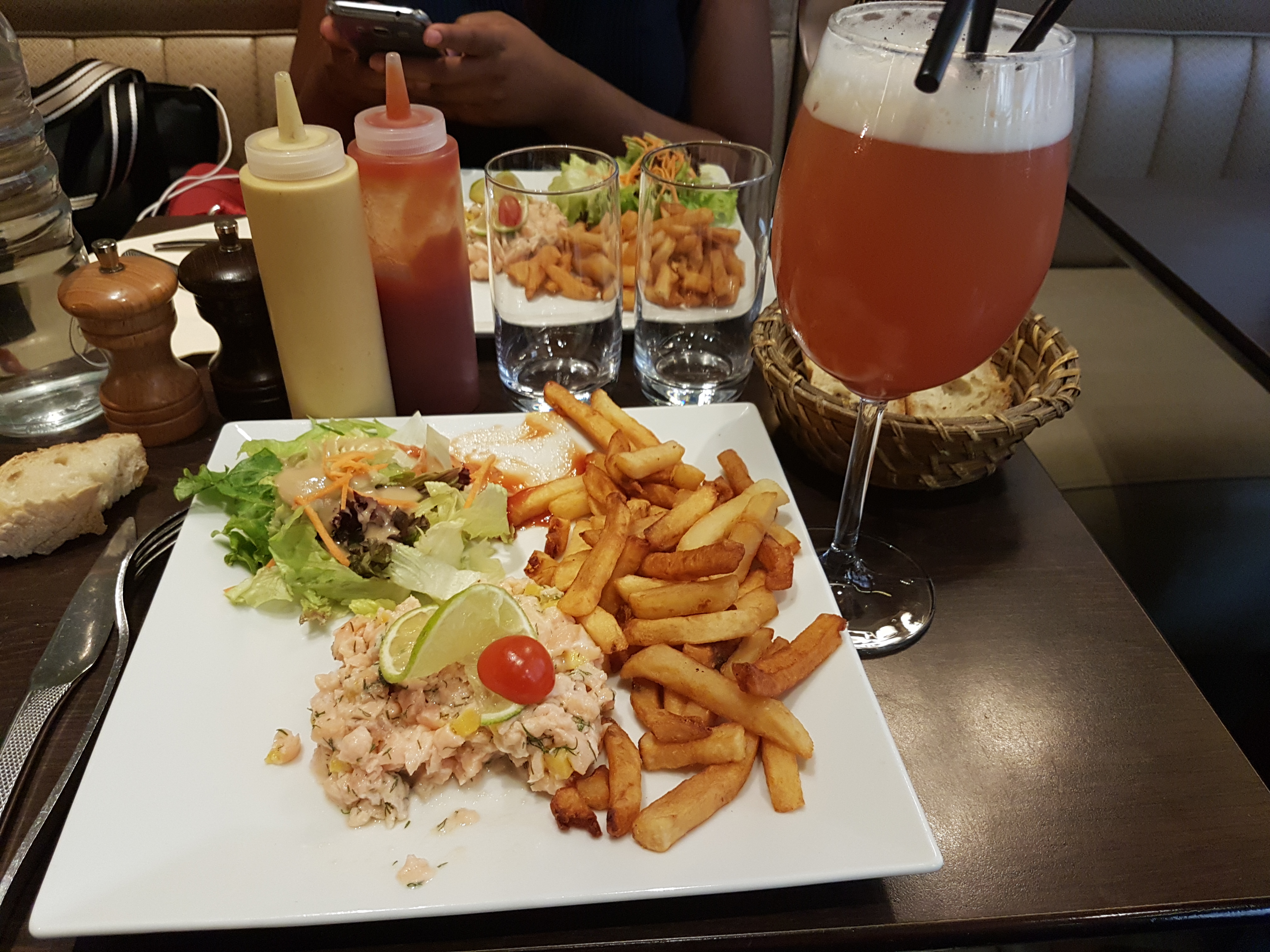On a fait on pot de départ pour une collègue ici, j'ai goûté le cocktail, c'est vraiment bon. Après j'ai pris aussi les frites, il n'y a pas bcp de goût, le pain est moyen. Le service est bien, la décoration est bien aussi. La position n'est pas bien placée, l'ambiance est cool.