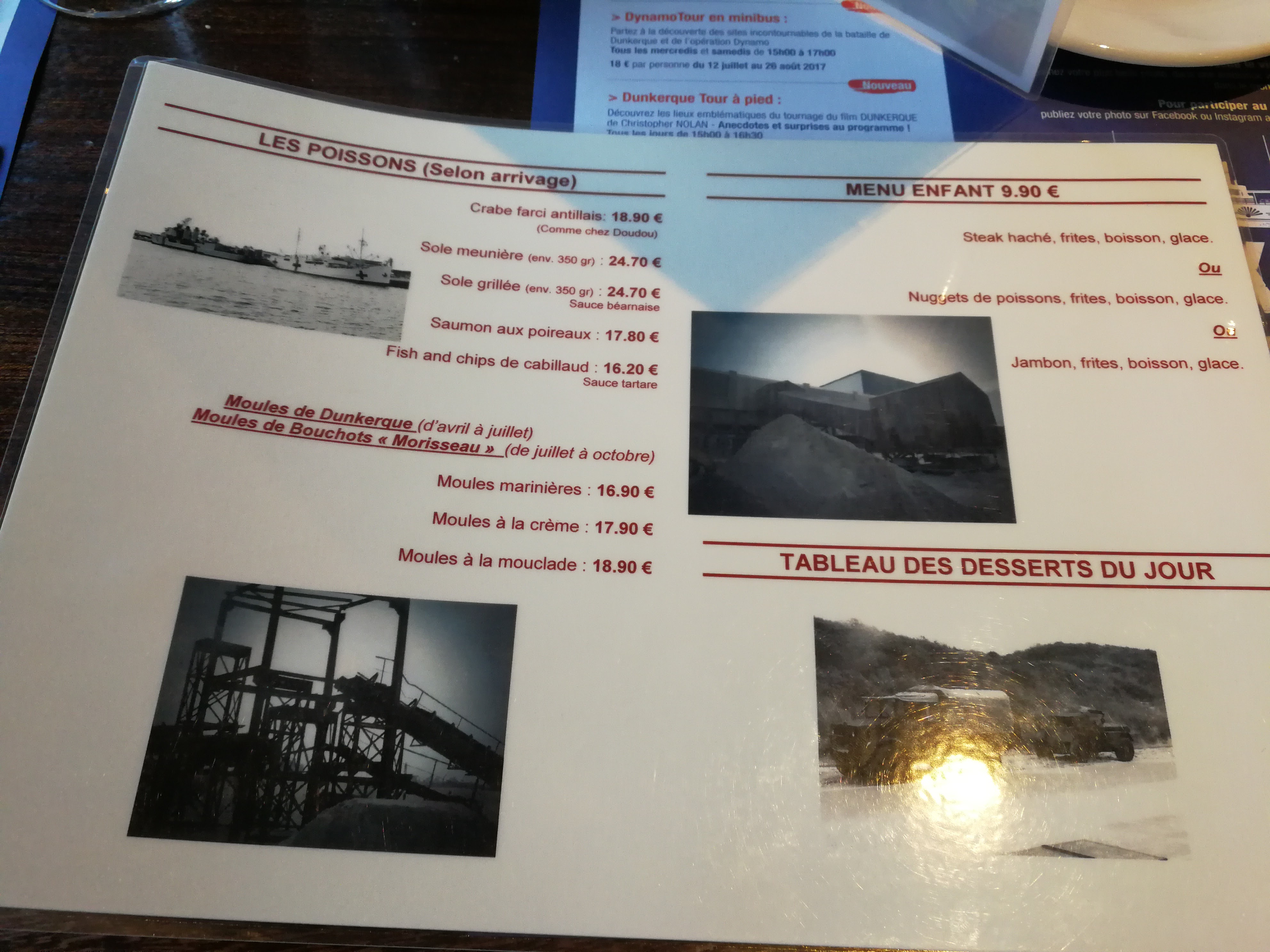 Poissons à la carte ou viandes, bons desserts, accueil sympathique, vous avez l'impression d'être dans un bateau, parking facile à proximité, prix légèrement plus élevés pour une brasserie, à 100m du bord de mer