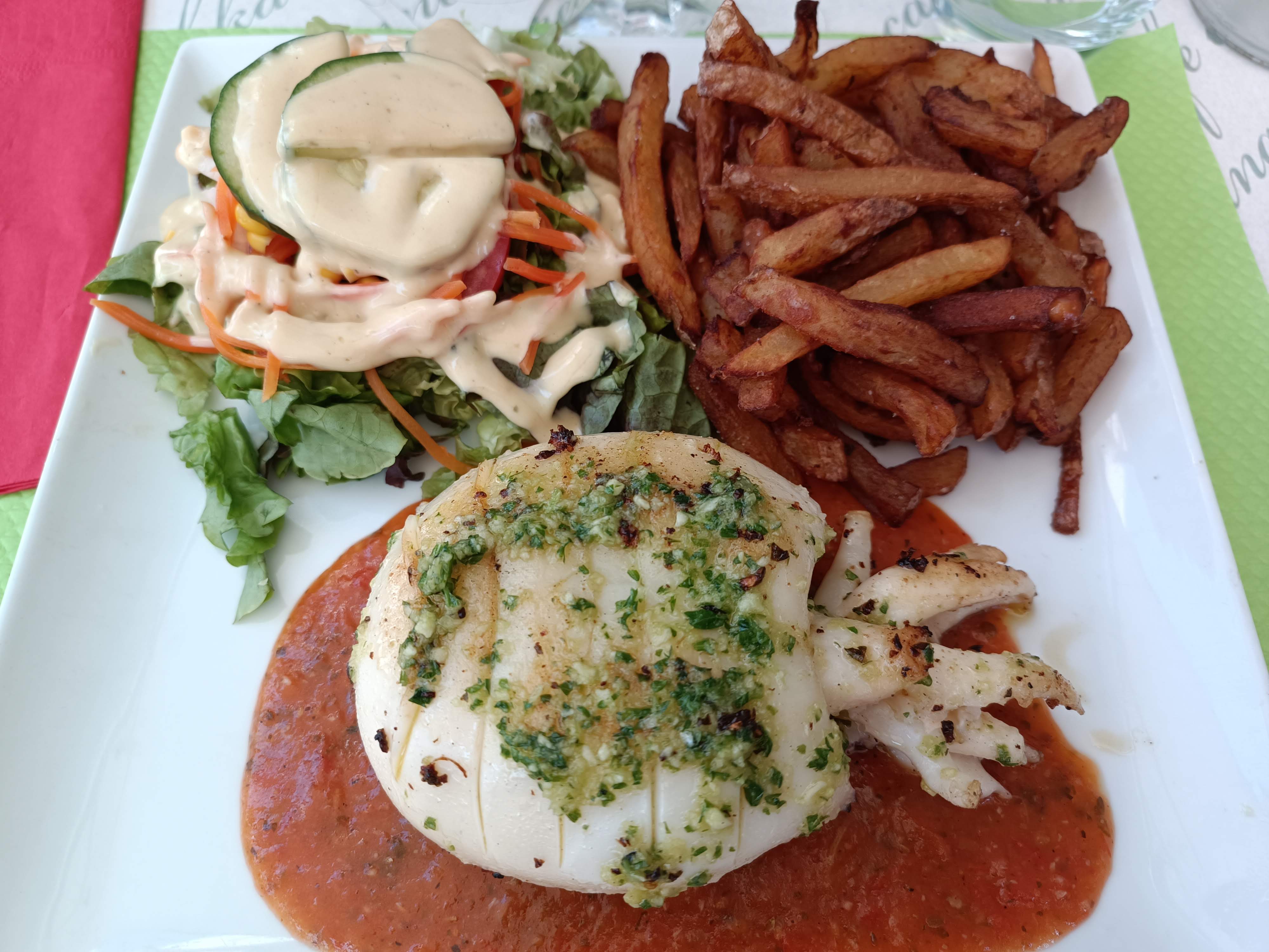 La Star de l'Escapade Seiche avec persillade une des meilleures que j'ai jamais mangé venez nombreux découvrir cette Star de l'établissement avec frites maison succulentes et crudités et un dessert formidable crème brûlée très goûteux !