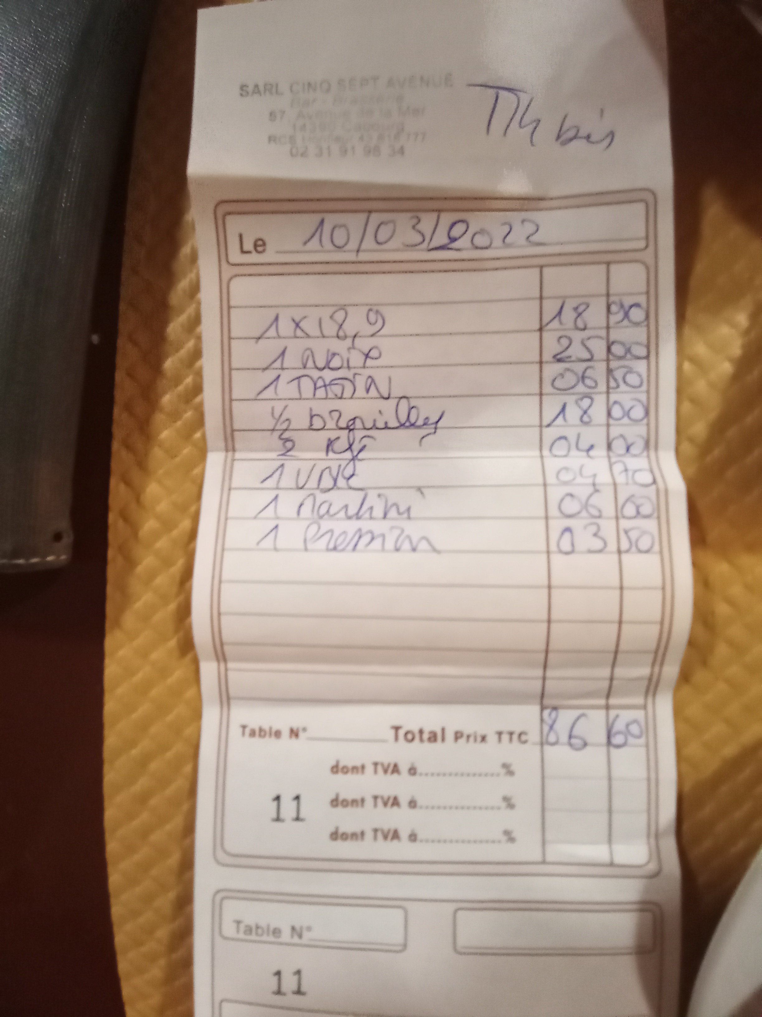 Plateau de fruits de mer à température ambiante ( bulots, langoustines sans aucun goût, touteau trop cuit...moules à la crème avec une seule cuillère de crème. Moules au menu moins consistante qu'à la carte (sans aucune précision). Tarte tatin ( du jamais vu)Pas de caisse enregistreuse!!!