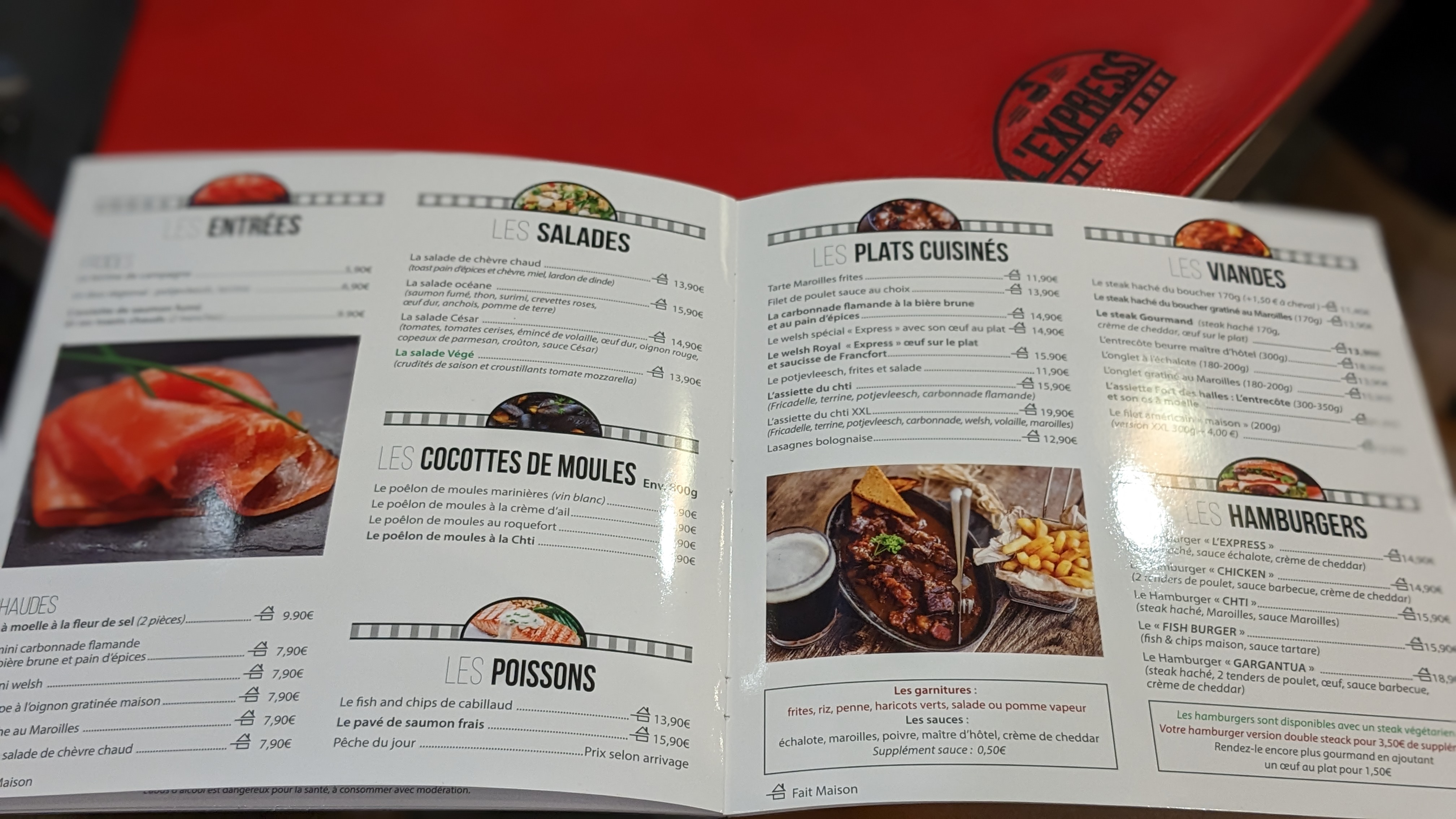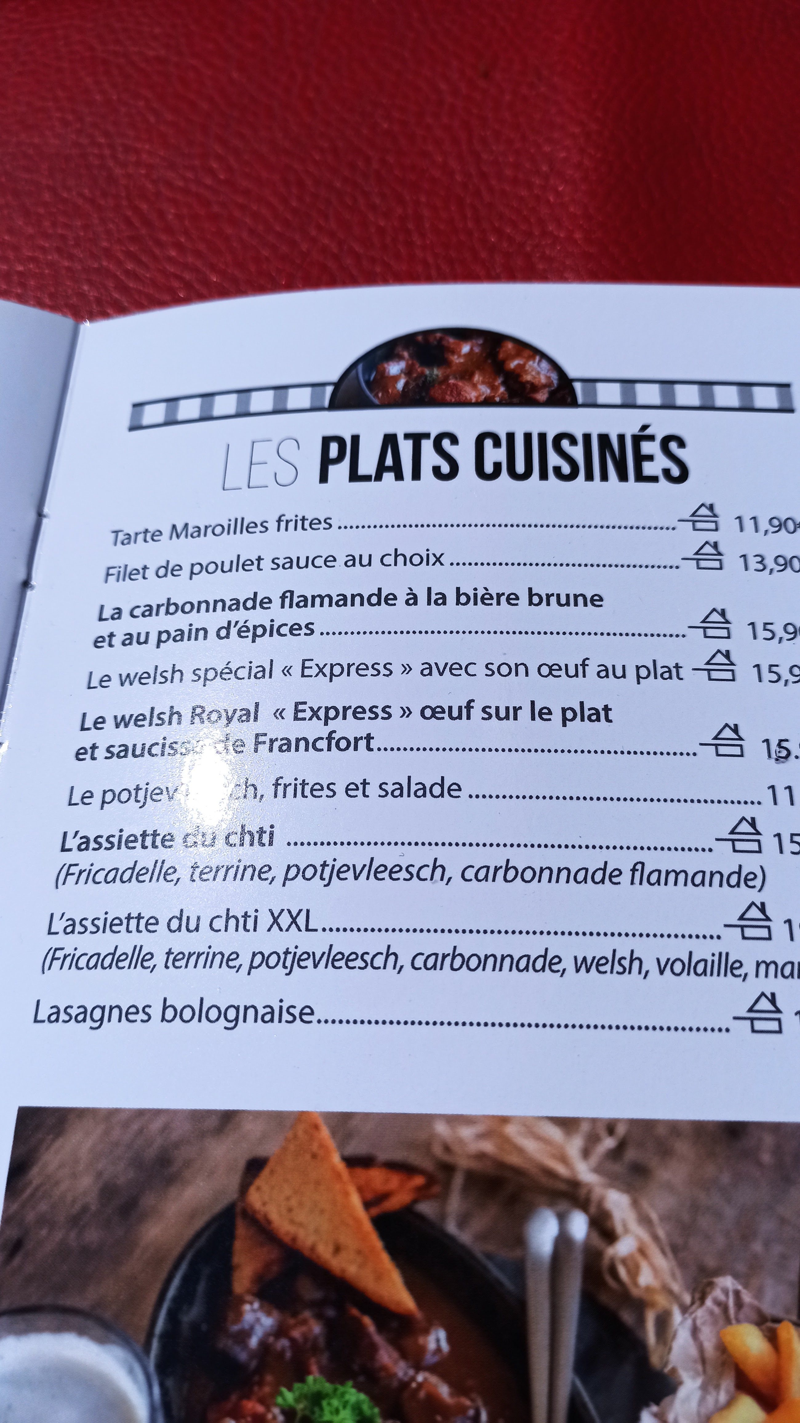 Ça fais plus d'un ans que je vien à l'express ya une bonne accueil, bonne ambiance, familial, toujours souriant😁 je suis beaucoup cocktail donc pour les gens qui aime les cocktail je vous conseille les cocktail de l'express les prix son raisonnable vos le coût très bon ❤️ pour les plats je vous recommande leur carbonade flamande 🤤un régale ! Leur frite son fraîche et délicieuse,leur hamburger son bien garni bien consistant 😁👌 et leur moule ! 😋🤤pour les gens gourmand comme moi c parfais ! ❤️ bref je vous recommande L'EXPRESS ! 😁Je les remerci beaucoup et plein de bisous et de courage 💪😁