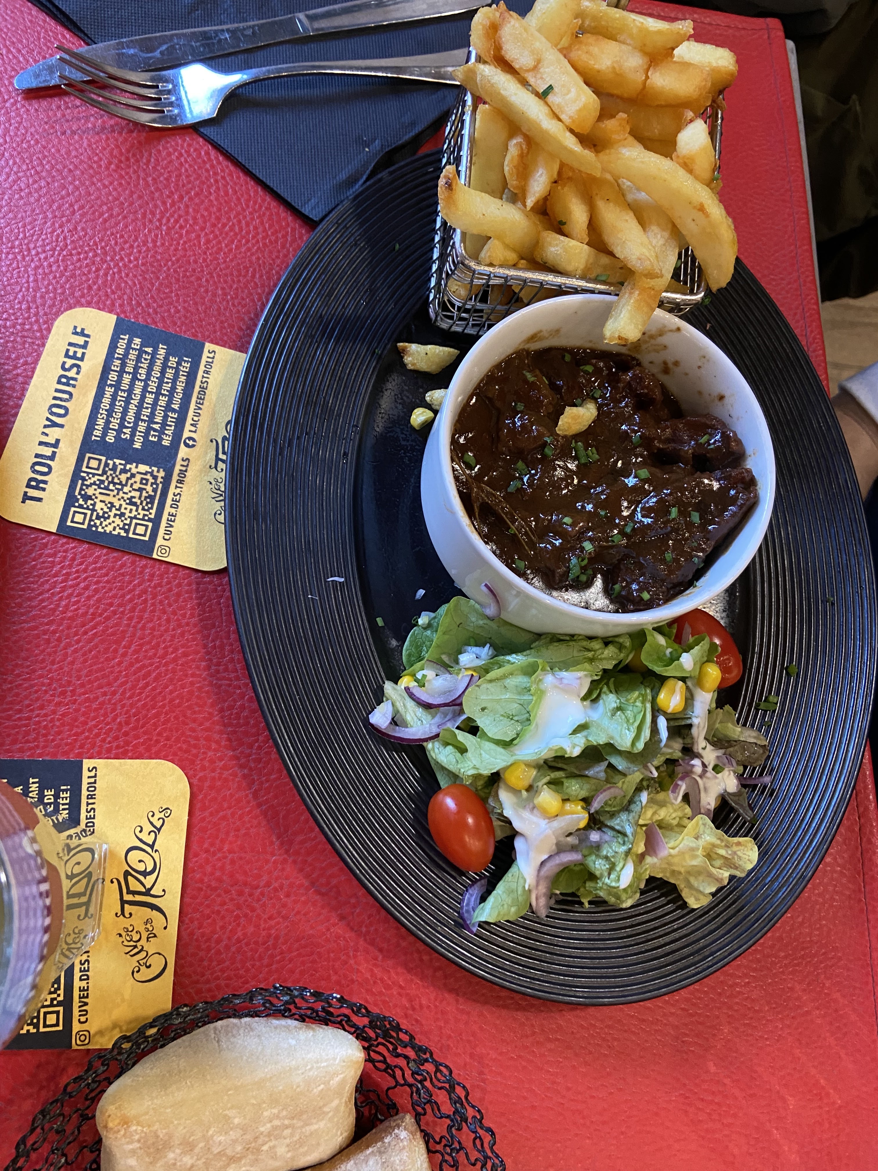 Samedi de braderie donc pas forcément représentatif, carbonnade flamande avec frites. Nourriture bonne, service un peu compliqué car braderie, portion un peu courte sur les frites par rapport au tarif.
