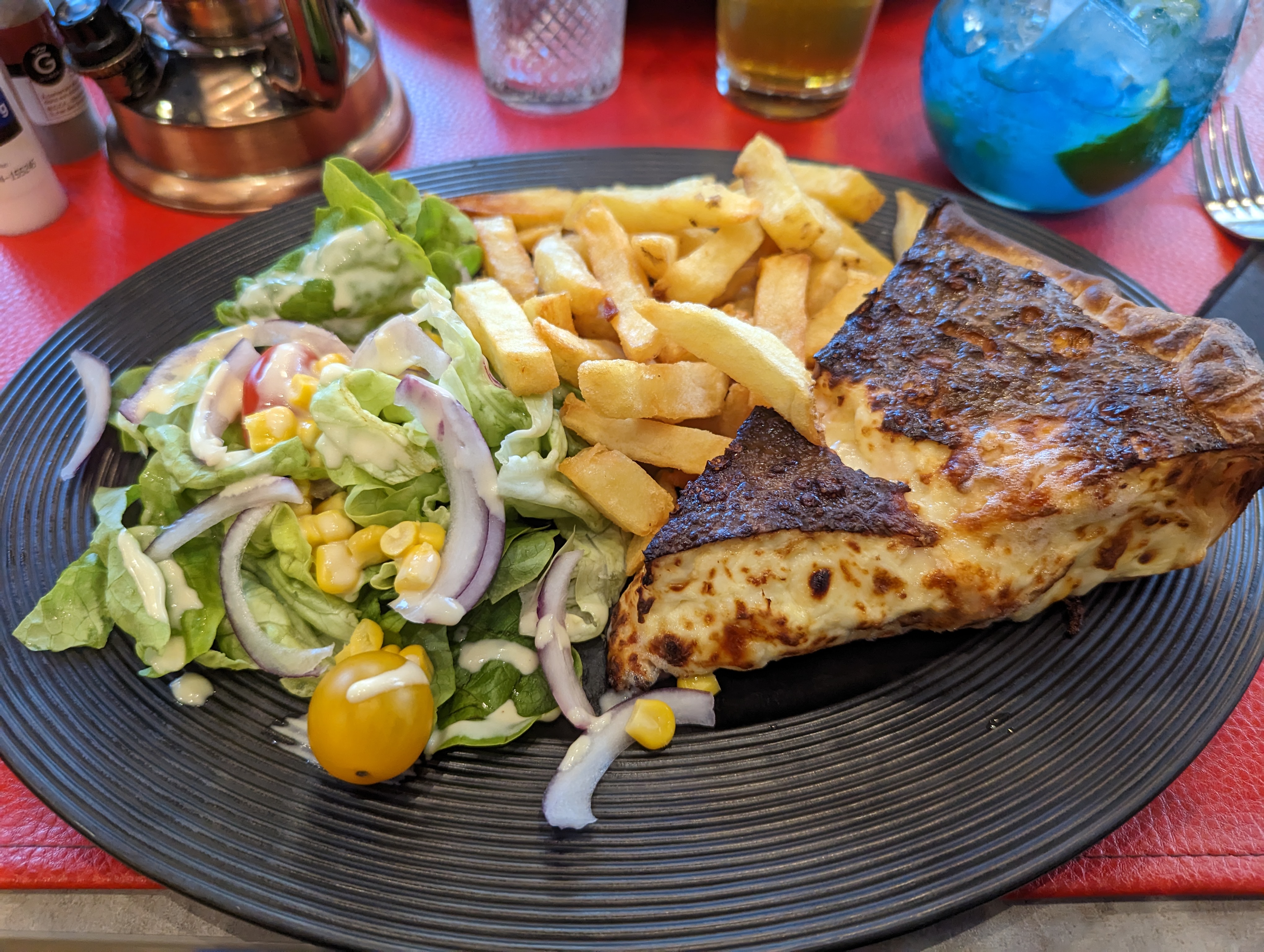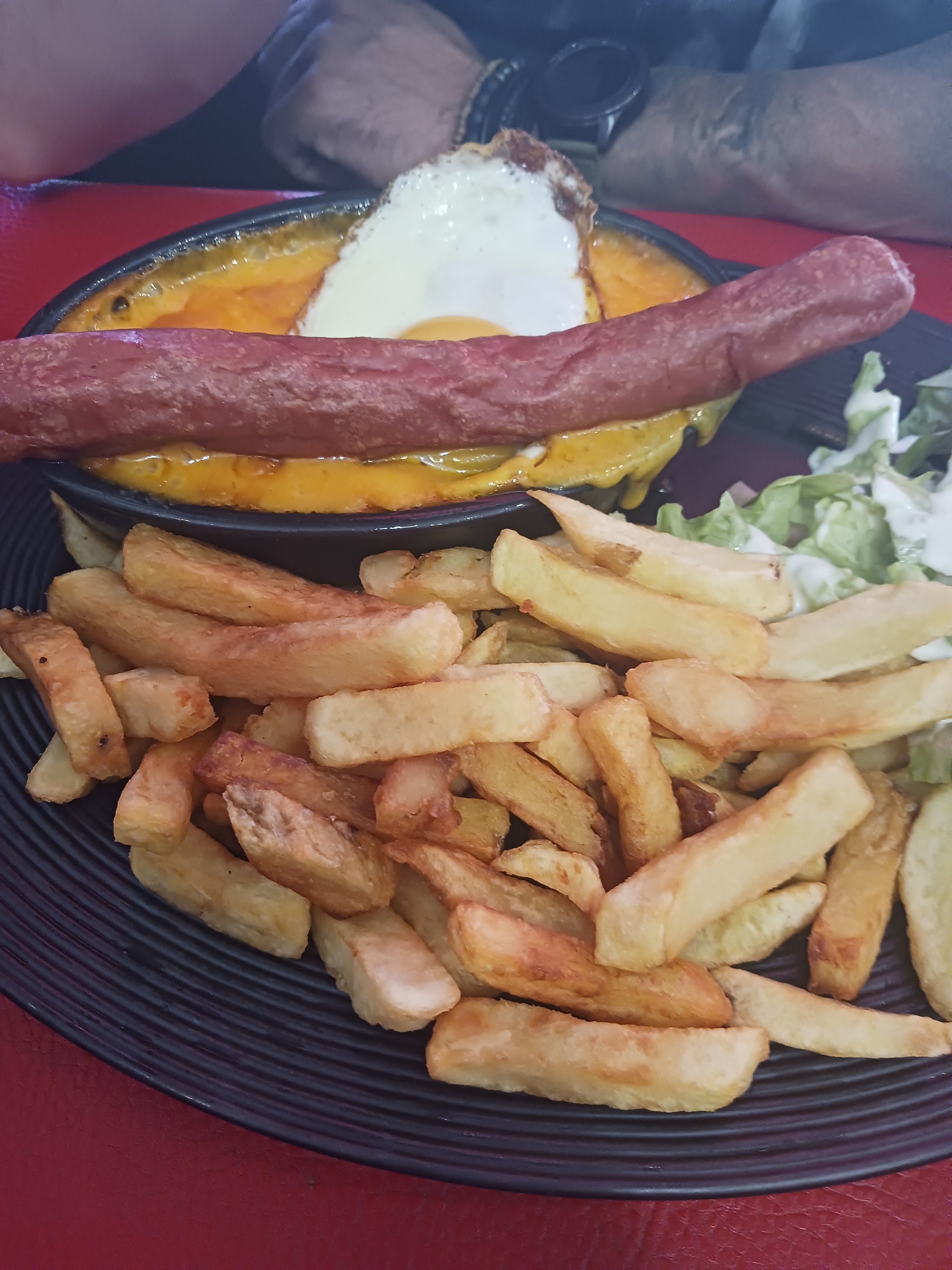 Nous n'avons pas déjeuné ni dîné simplement pris des boissons avec un dessert. Le personnel est sympathique, il y a une bonne ambiance et le dessert était excellent. Je recommande. Ah oui pris plusieurs fois des frites à emporter, ce sont de vraies frites.