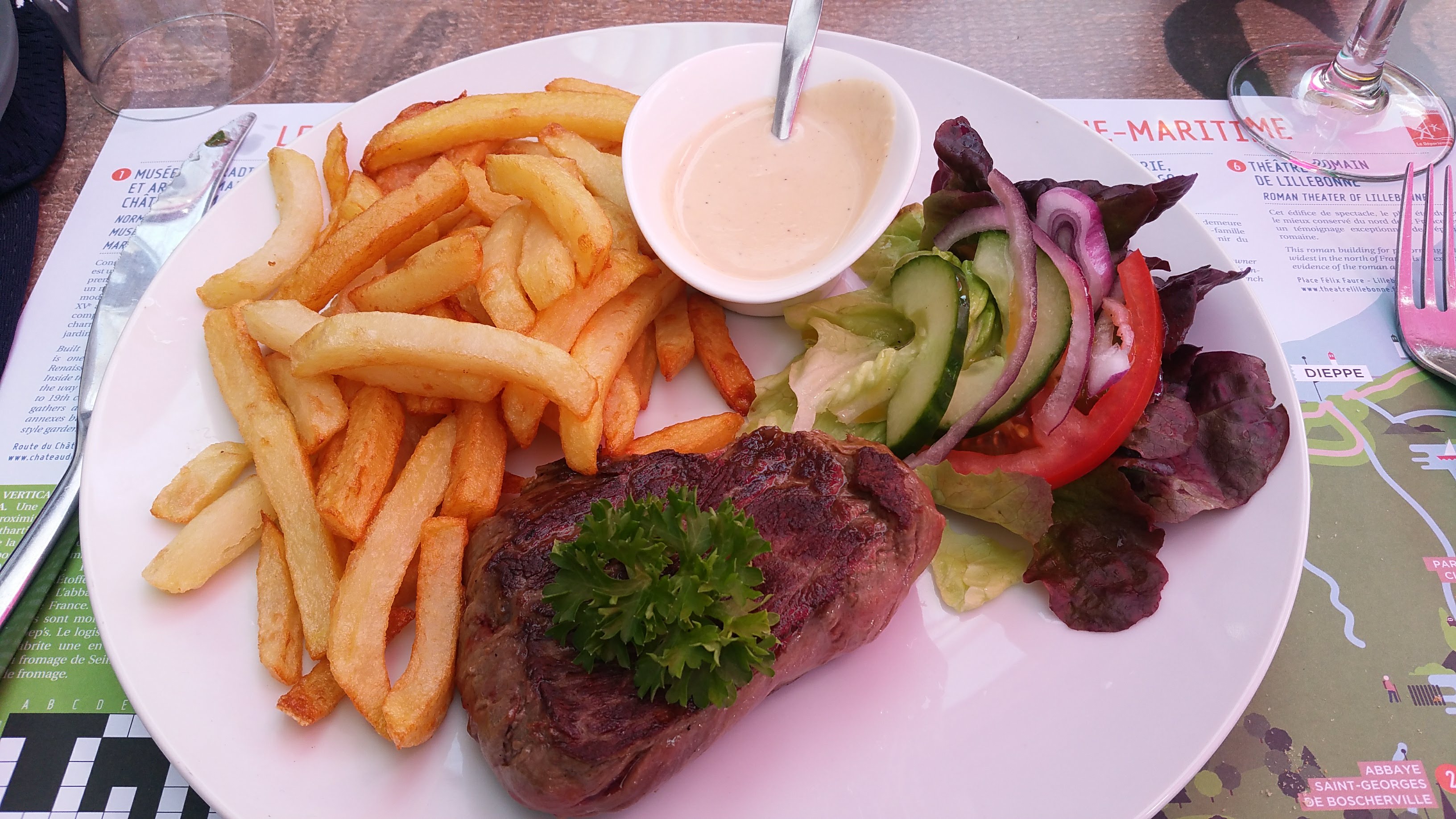 A 20 kms de Rouen Jumieges et son abbaye un restaurant sympa, propriétaire disponible malgré l affluence, menu à 15 euros copieux, plats variés et très bons. Je conseille le lieu.