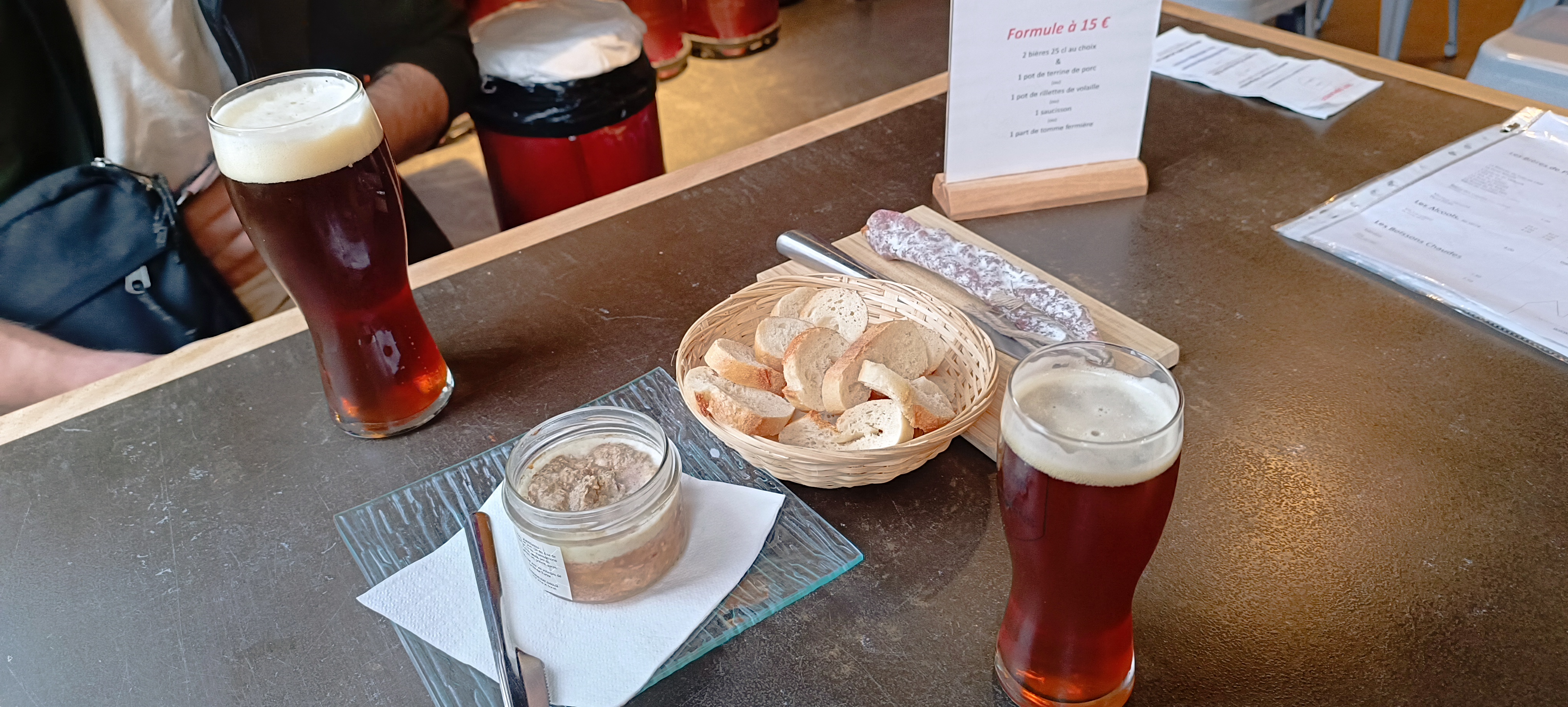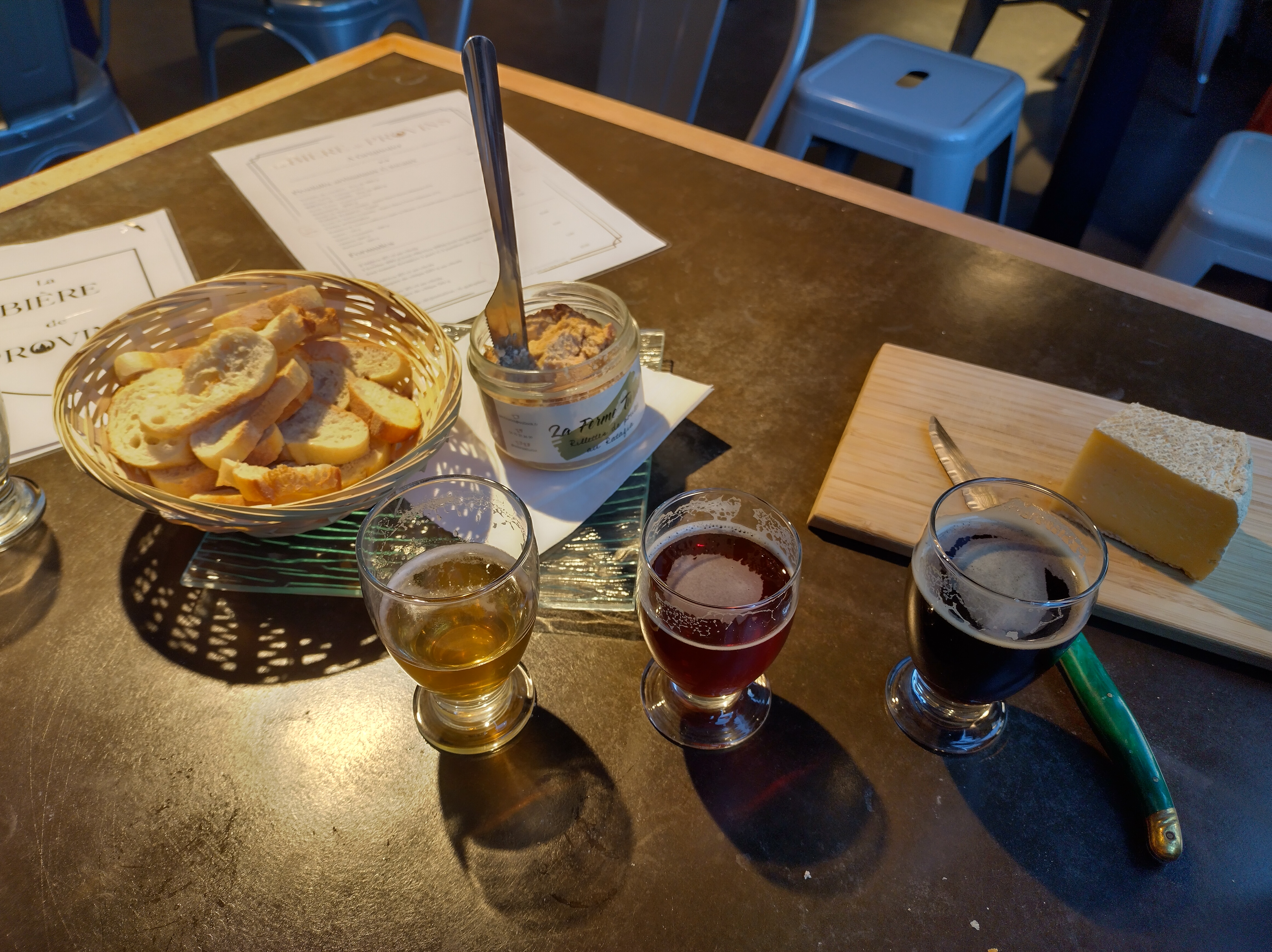 Je me suis arrêté dans cette brasserie. J'ai choisi un plateau de dégustation. Je trouve que la brune a des notes de café et se marie correctement avec la tome. La blanche et l'ambré se marient bien avec les rillettes. Les produits sont du coin et artisanaux. J'ai passé un bon moment.