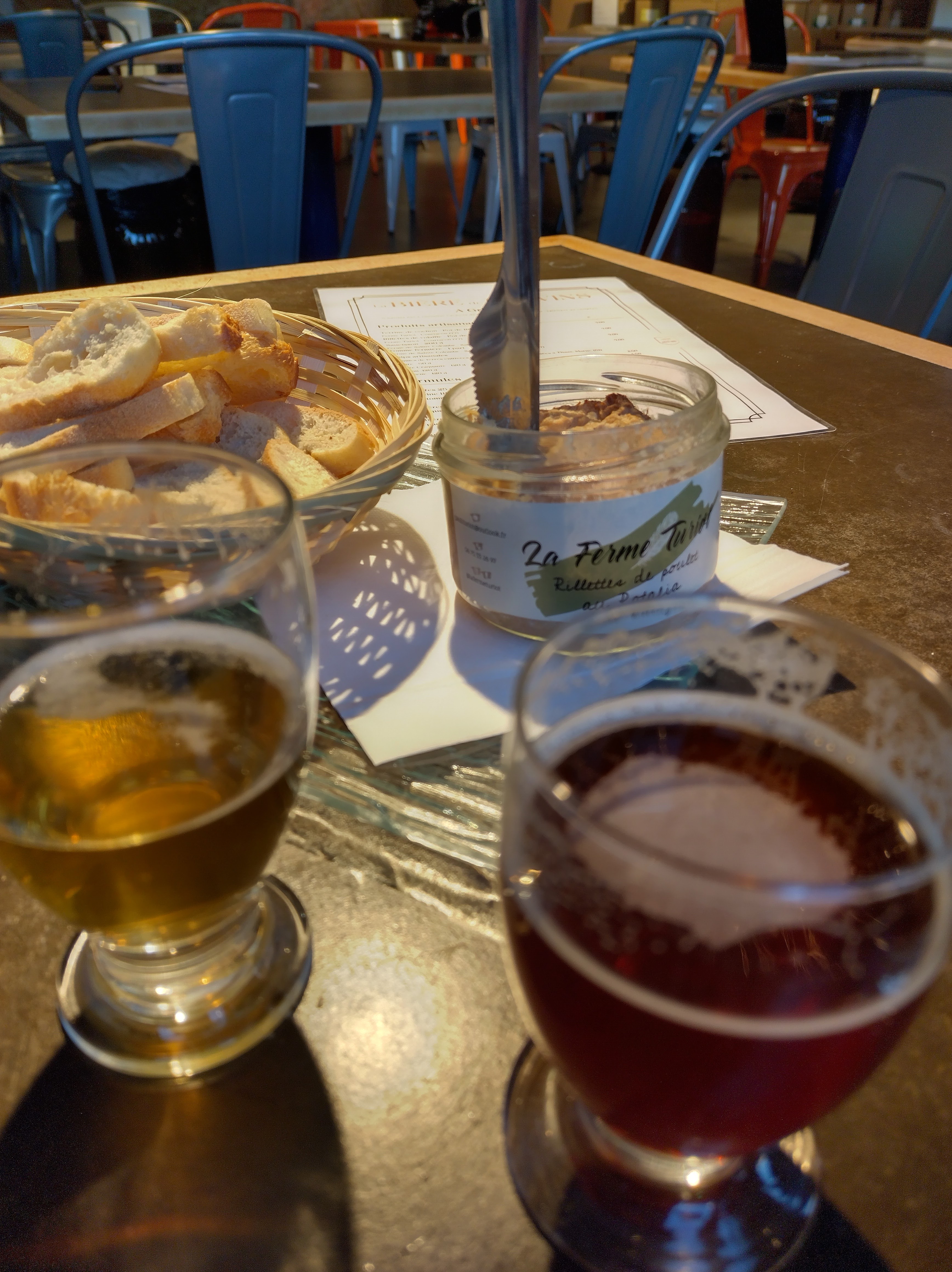 Une super microbrasserie où pour 15 euros on a pu avoir deux bières et de très très bonnes rillettes locales. Un vrai pot gourmant et pas une petit bout vite fait comme à Paris. La bière à la rose,bière blonde est légère et se boit très facilement. La bière Thibaut a plus de caractère, une bière ambrée qui se boit bien mais qui se déguste plus lentement selon moi. Je recommande l'endroit 🤗