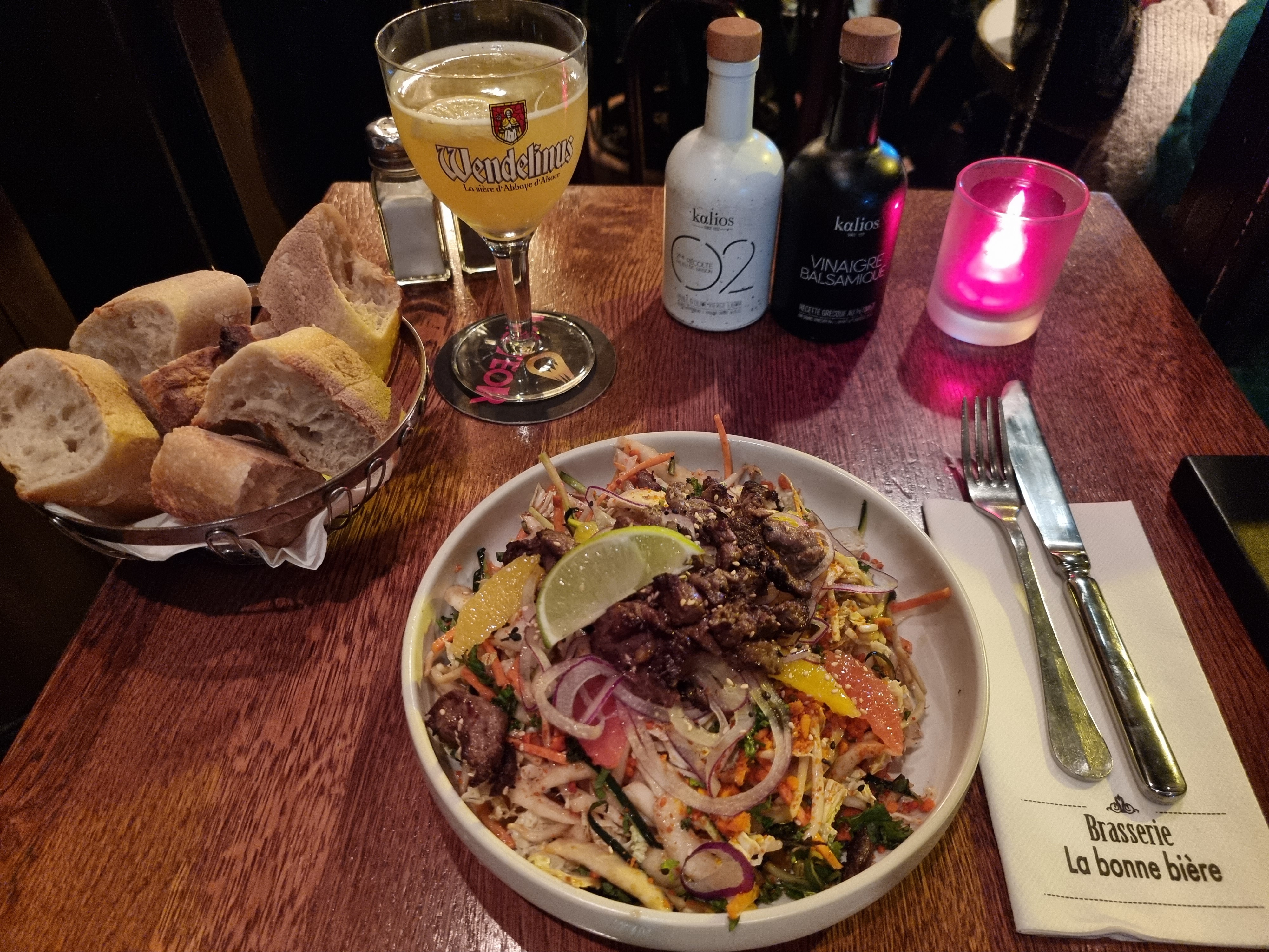 Accueil très agréable, service rapide. Nous étions déjà venus il y a quelques années avant une représentation au palais des glaces, et nous y avions dîné avant le spectacle. Nous avions apprécié, et c'est à nouveau tout naturellement que nous nous y sommes rendus hier soir pour dîner avant d'aller voir Pablo Mira ! Ça n'a pas bougé, ambiance intimiste, repas agréable. J'ai pour ma part pris une salade vietnamienne, très bon assaisonnement, et mon mari un tartare qu'il a également apprécié ! En apéritif, j'ai pris un St Germain et mon mari une bière du moment (à savoir Noël). Je vous le conseille fortement si vous passez dans le coin avant un spectacle ou autre 😉