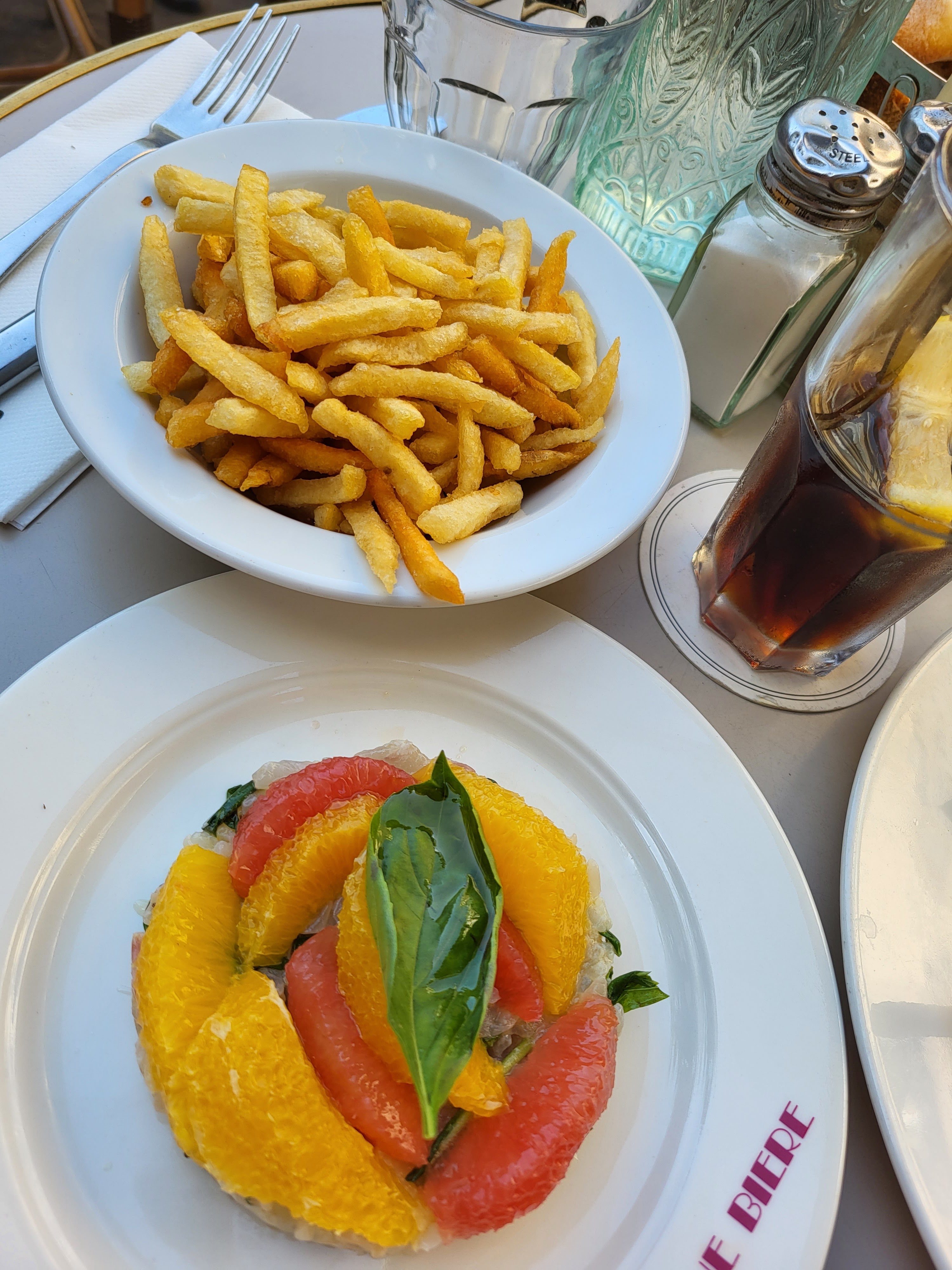Thé glacé maison : très doux, au début c'est étonnant car on sent très peu le goût du thé mais c'est frais et fait maison (Prix élevés tout de même ; 4,2€ le verre d'eau, mais bon pas étonnant pour Paris non plus au final) Service agréable