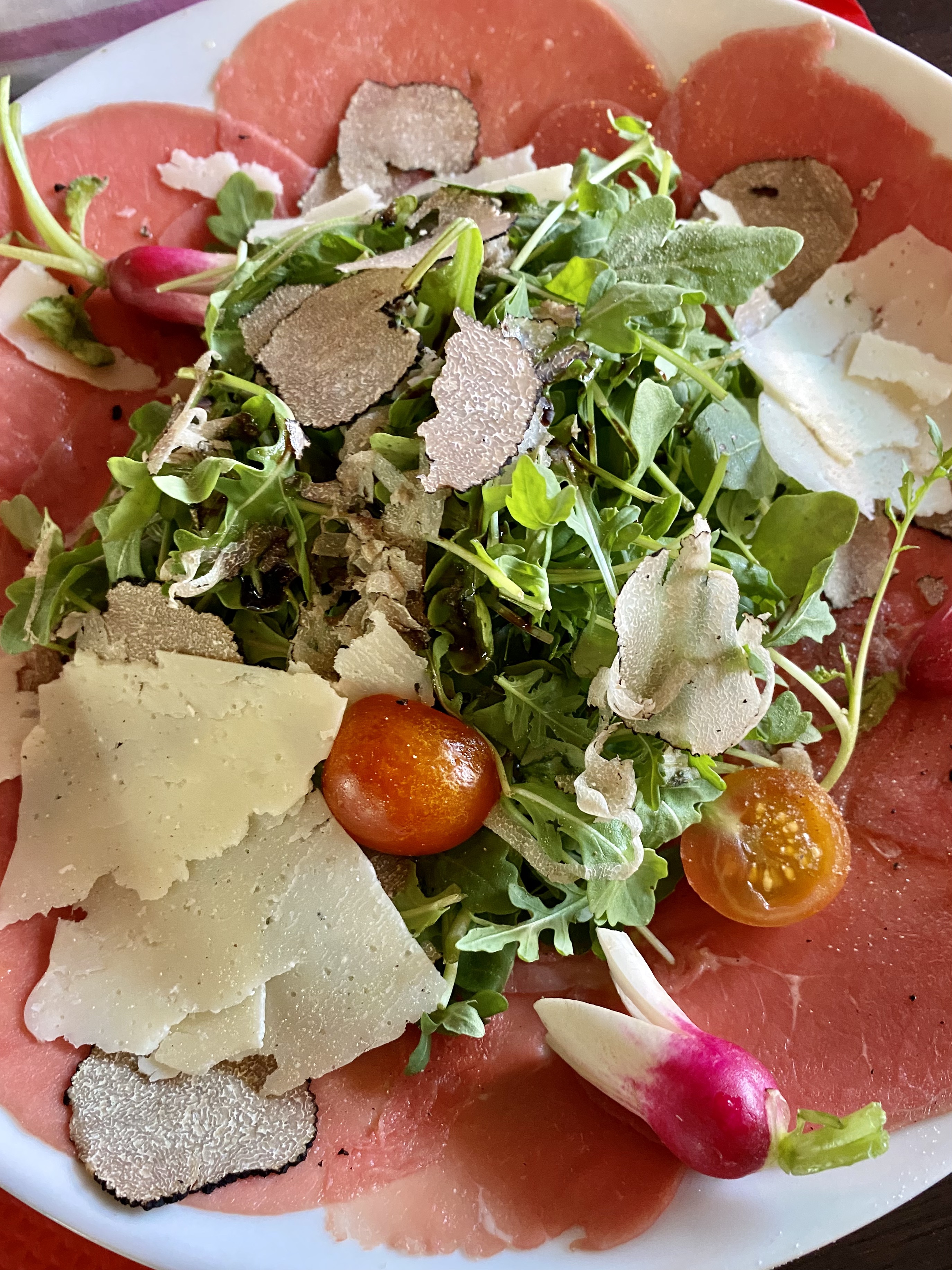 Duo carpacio/tartare super bon par ce temps ensoleillé un must have pour la période estivale avec un petit verre de rosé ! chaudement recommandé ! Service impeccable ! Bonne adresse