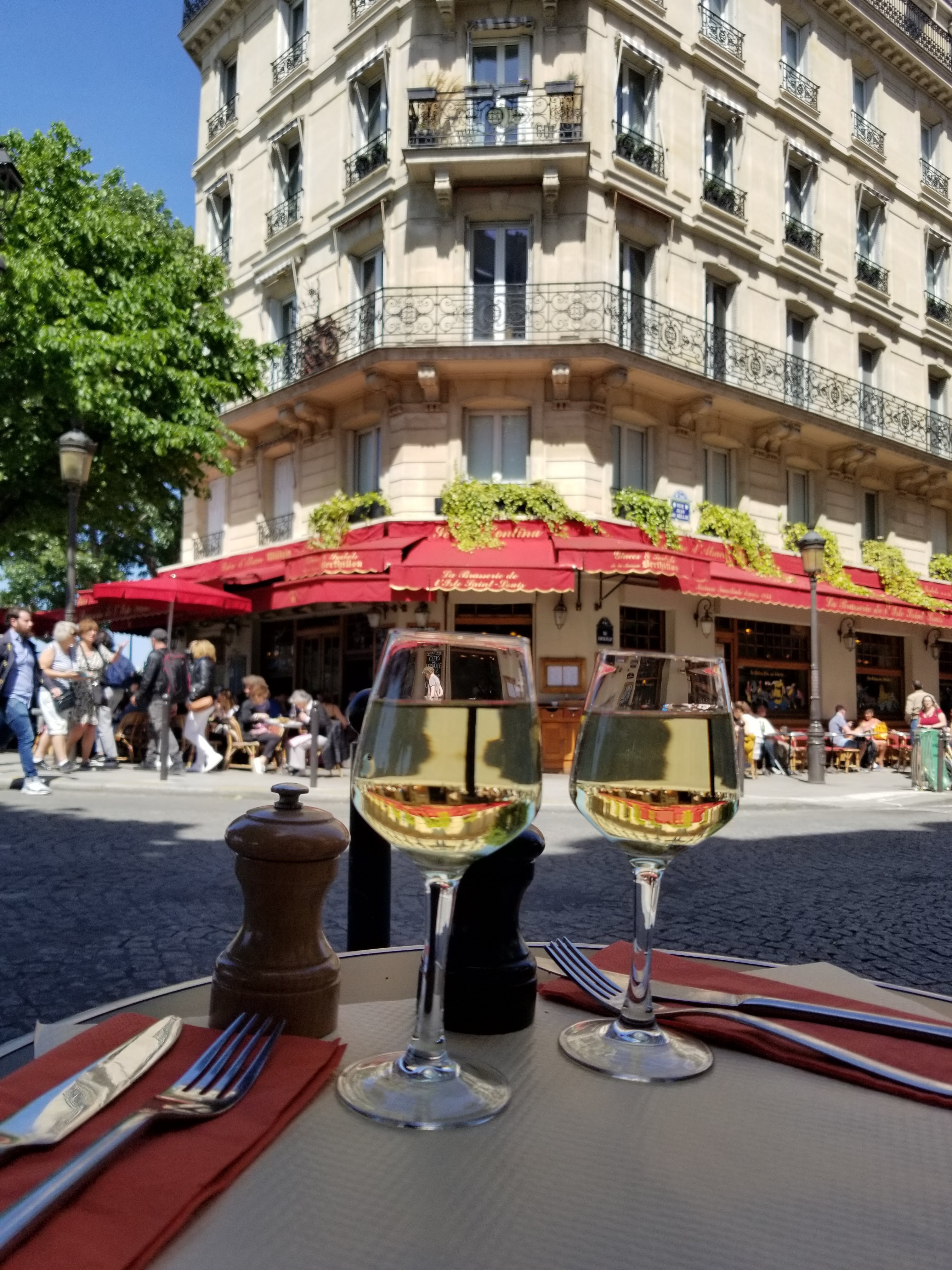 Alors La Brasserie de l'Isle Saint-Louis, la première chose à retenir de notre passage est peut-être qu'il faut d'abord demander si vous ne dérangez pas! Pourtant vous êtes à Paris, au mois de juillet et il n'est pas très tard! Mais voilà en premier posez la question! Le service s'arrête à 22h, c'est calme vous comprenez, je comprend alors nous prendrons juste un verre. Oui mais attention on va vraiment fermer, je crois comprendre qu'il faudra donc le boire vite et partir. J'ai envie de rappeler au serveur la célèbre scène de la traversée de Paris ou Gabin commande 4 vins chauds au lieu de 2 parce qu'il est tard et que le patron veut fermer....il est tard. Nous ne traverserons pas Paris mais la Seine puis la rue de Rivoli et serons enfin beaucoup mieux accueillis!!